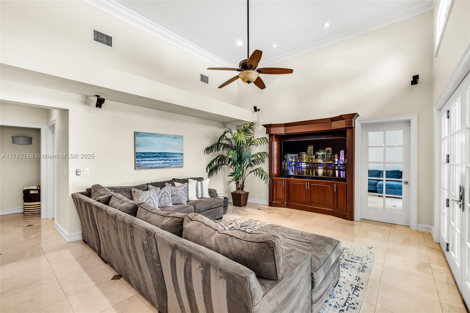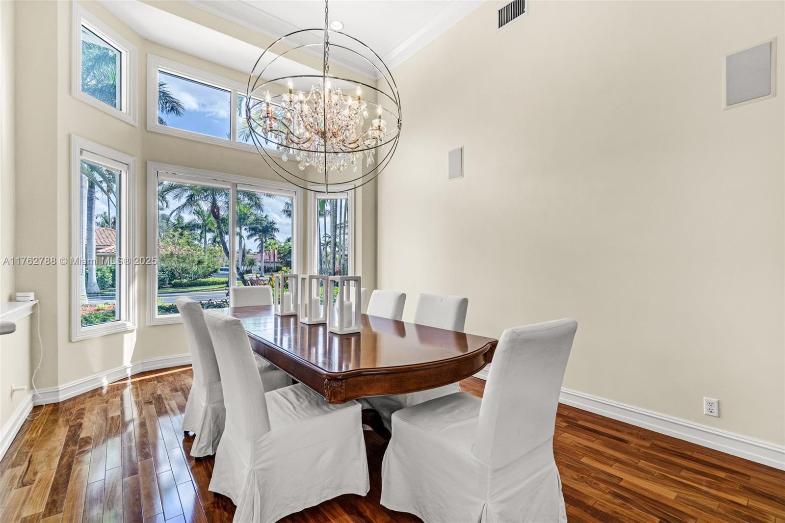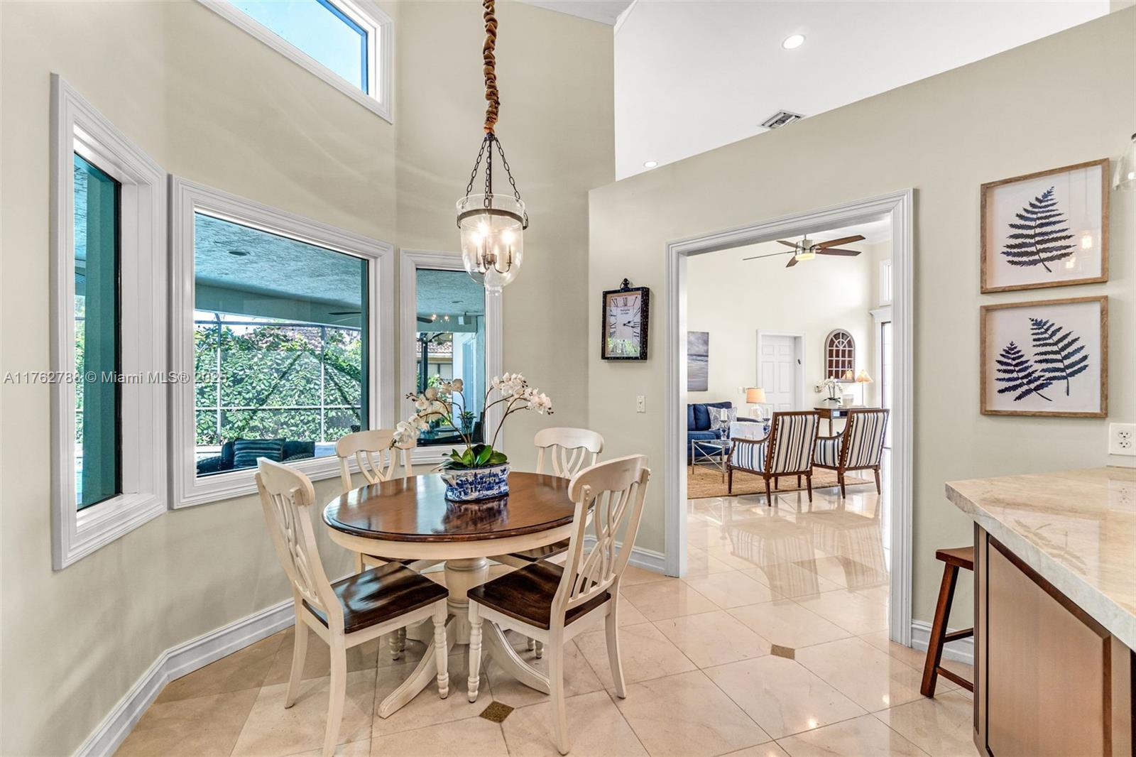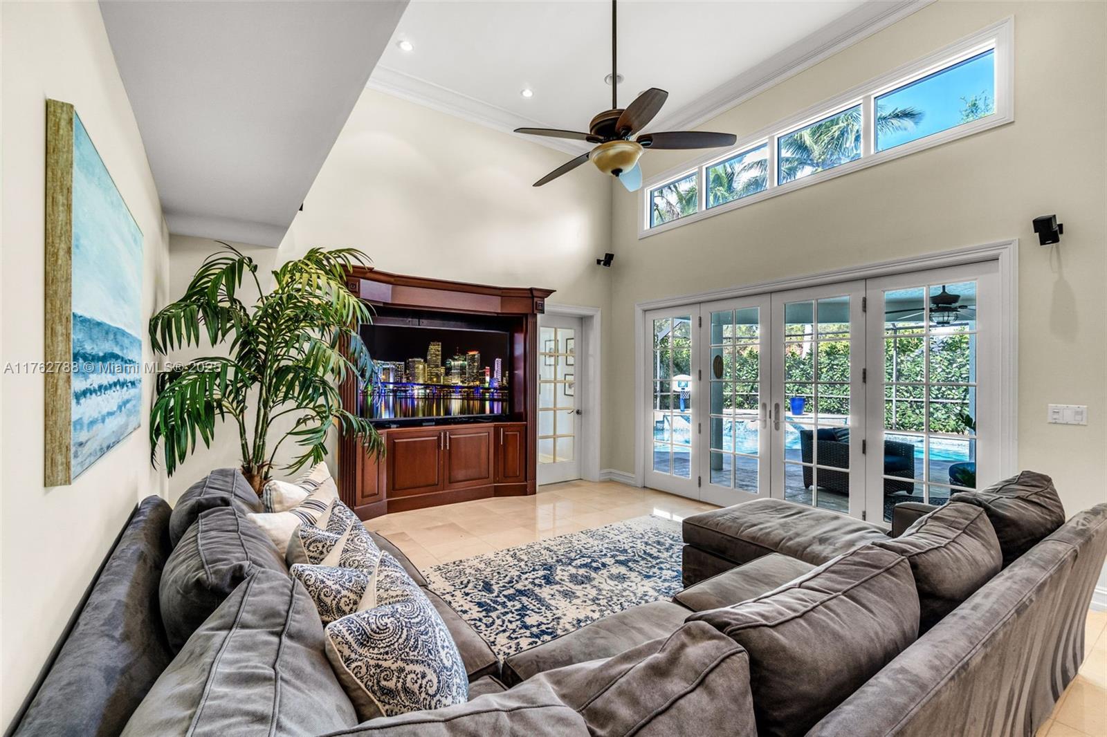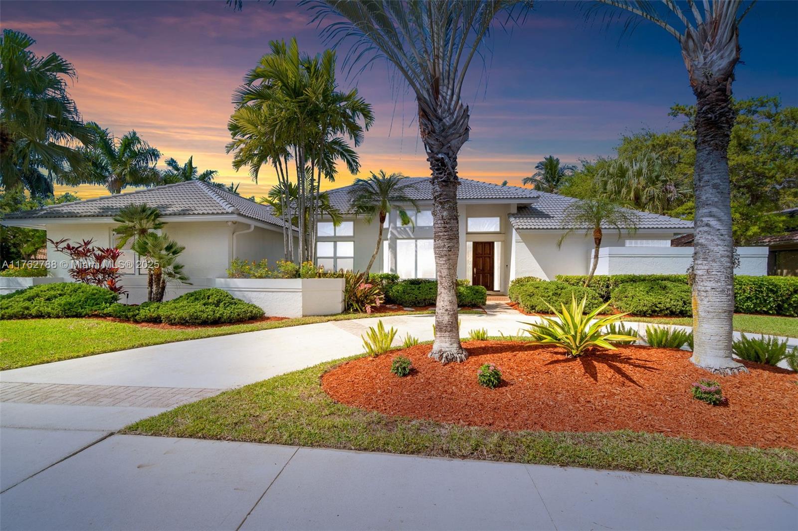 Nestled in the highly sought-after Palm Island community in Weston, this stunning corner-lot home offers A-rated schools and luxury living! Enjoy breathtaking pool view throughout, soaring ceilings, crown moldings, and abundant natural light. Gourmet kitchen features exquisite Taj Mahal countertops and a wine fridge, while custom closets provide ample storage. French doors open to a serene backyard with a saltwater pool, covered patio, and lush privacy hedges. The huge 5th bedroom can serve as a playroom or an extra master suite. Updated primary bathroom, with engineered hardwood floors in primary bedroom, Murphy bed in one of the bedrooms making it spacious. A circular driveway plus an additional side driveway offer plenty of parking. Steps from the community park—this home is a must-see!