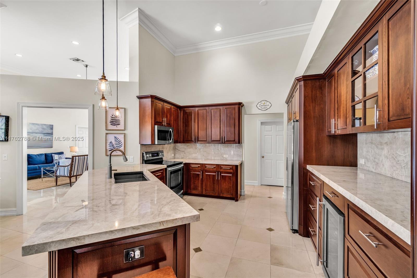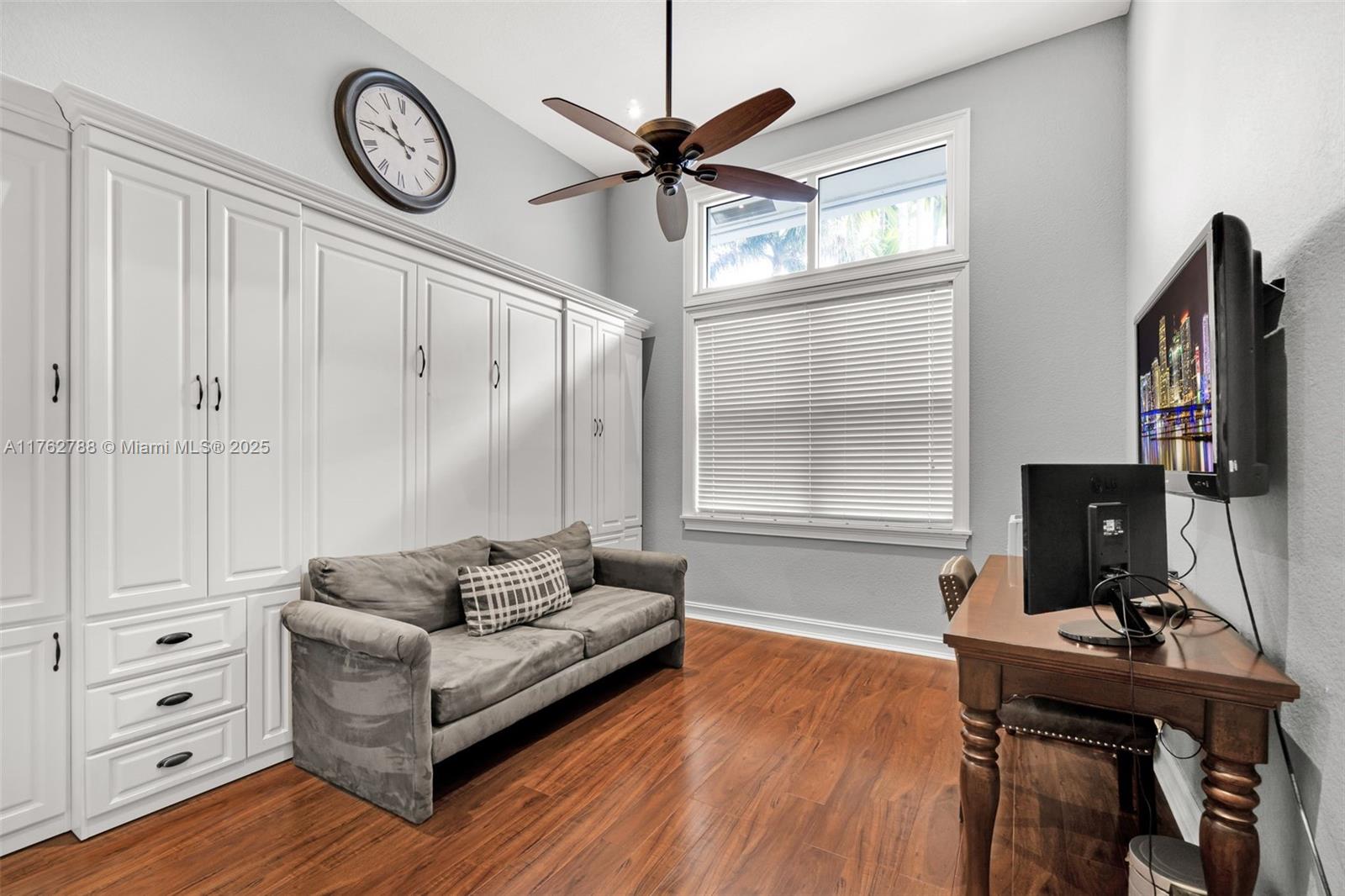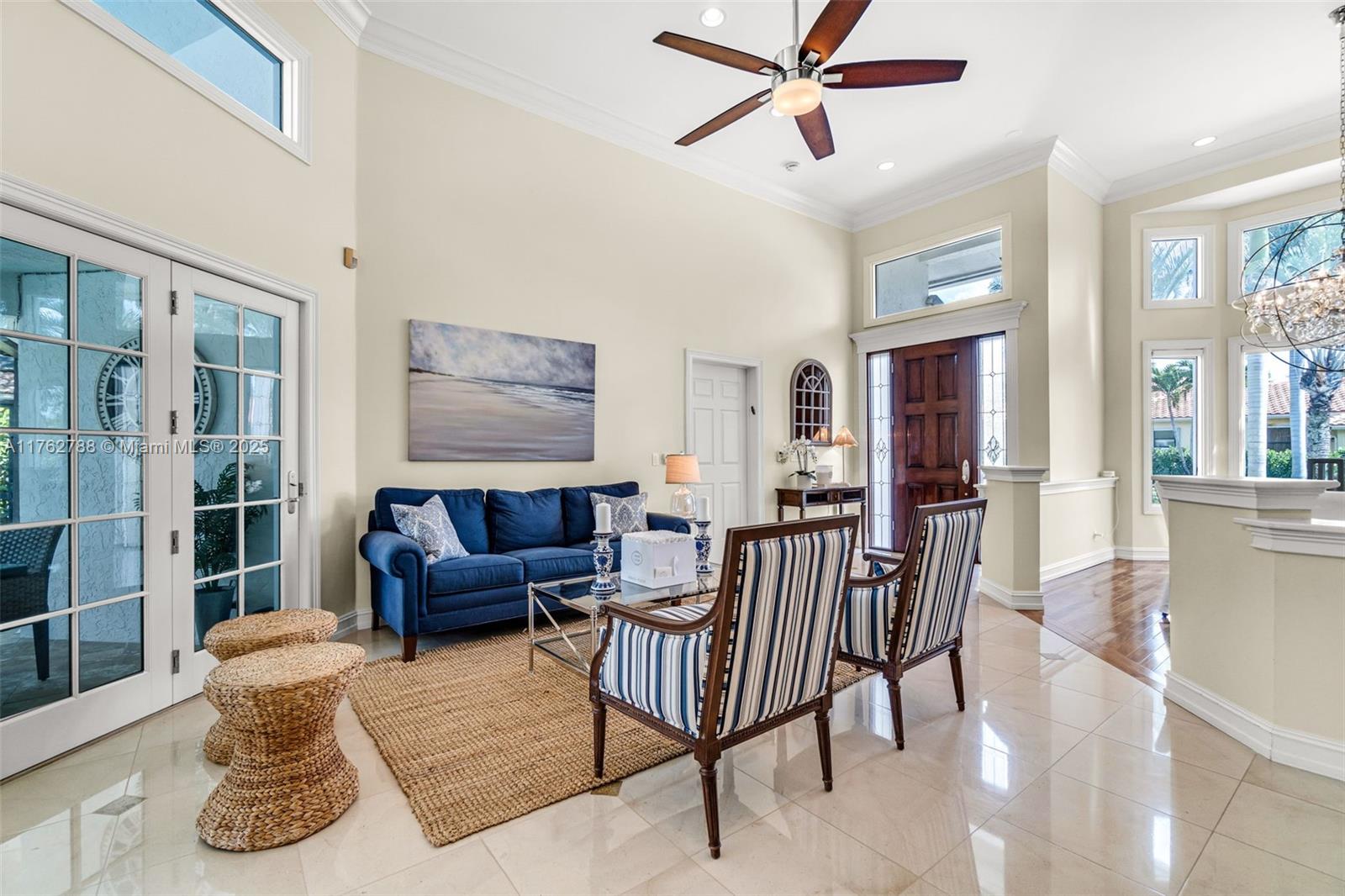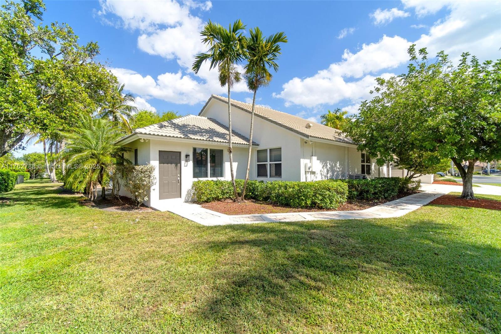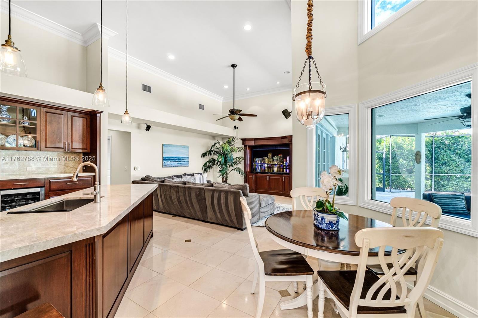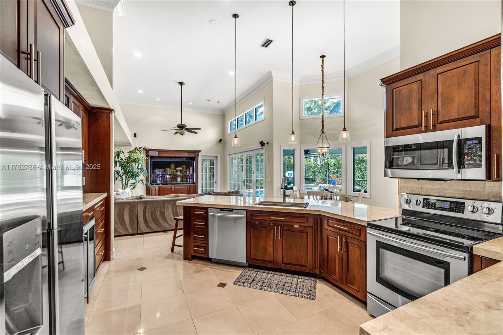 Nestled in the highly sought-after Palm Island community in Weston, this stunning corner-lot home offers A-rated schools and luxury living! Enjoy breathtaking pool view throughout, soaring ceilings, crown moldings, and abundant natural light. Gourmet kitchen features exquisite Taj Mahal countertops and a wine fridge, while custom closets provide ample storage. French doors open to a serene backyard with a saltwater pool, covered patio, and lush privacy hedges. The huge 5th bedroom can serve as a playroom or an extra master suite. Updated primary bathroom, with engineered hardwood floors in primary bedroom, Murphy bed in one of the bedrooms making it spacious. A circular driveway plus an additional side driveway offer plenty of parking. Steps from the community park—this home is a must-see!