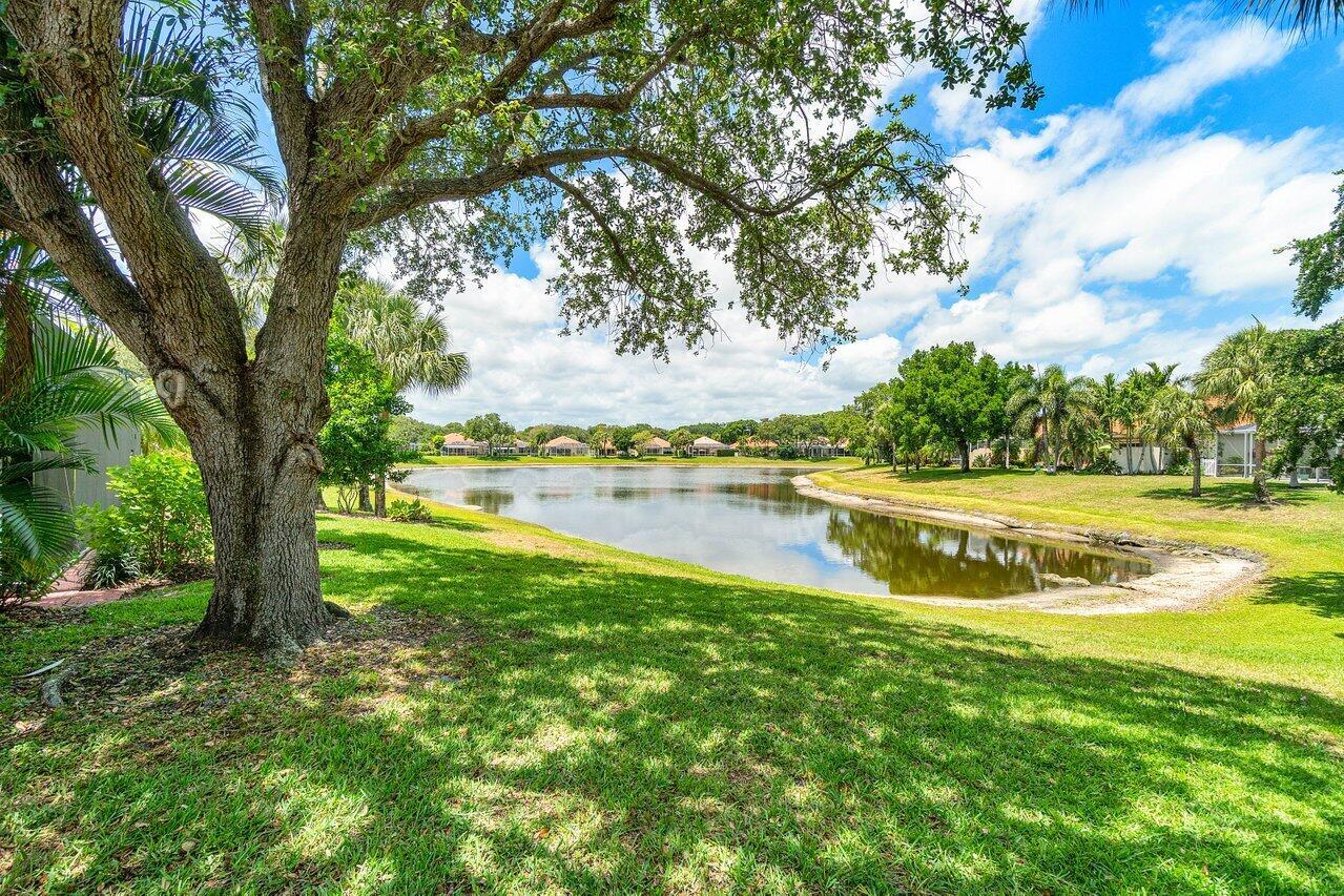 Very Palm Beachy! Loaded with magnificent custom features including a NO EXPENSE SPAIRED Renovation w/Updated Bathrooms & Kitchen, Top-o-line Cabinetry (full extension, dove tail, undermount slides, & soft close doors & Drawers),scrumptious quartzite countertops, Black SS Appliances, Plantation Shutters, Wood-Look Tile Flooring in a classic Herringbone pattern w/wide base floor moldings, volume ceilings w/X-TRA Wide Crown Molding, all 1-floor of living(NO STAIRS), Divosta's signature 'Built Solid' Poured Concrete Contruction all on a Premium Property Lot w/X-tra Large Side Yard, spectacular Lake & lush open greenspace views. Largest Model available, plus spacious covered & screened back patio + extra side patio.All gr8 4 entertaining inside or alfresco dining outside. A Total Must C!