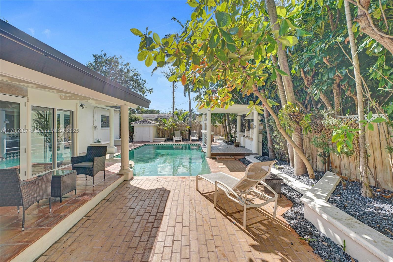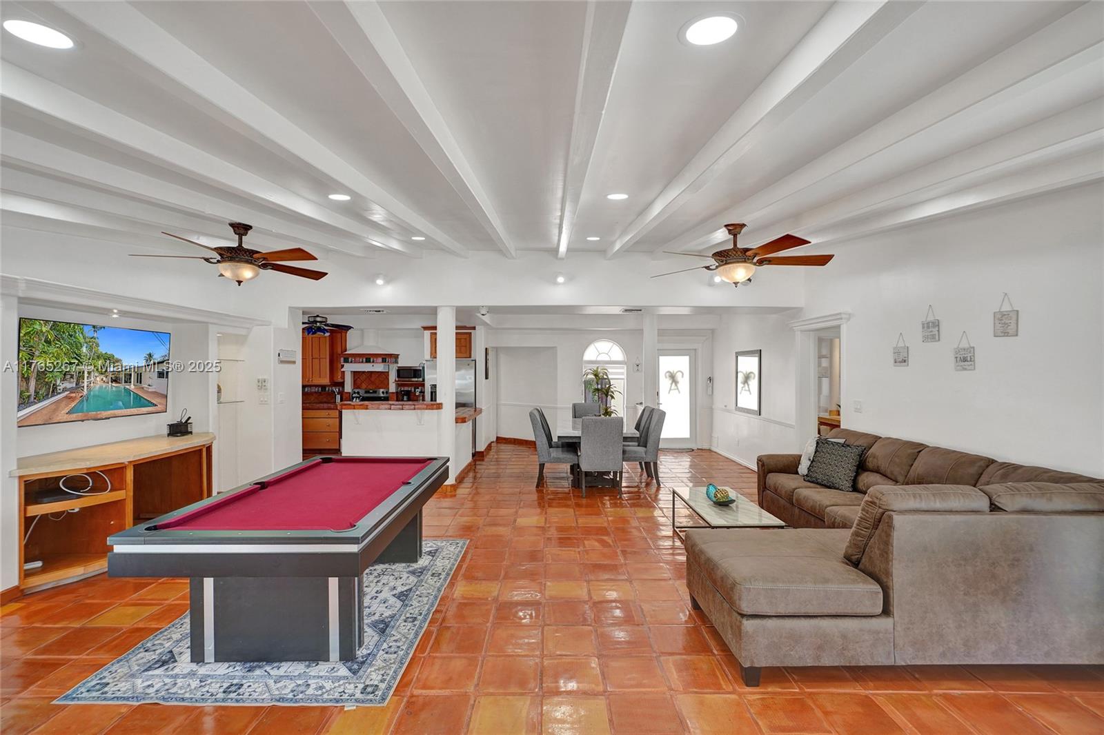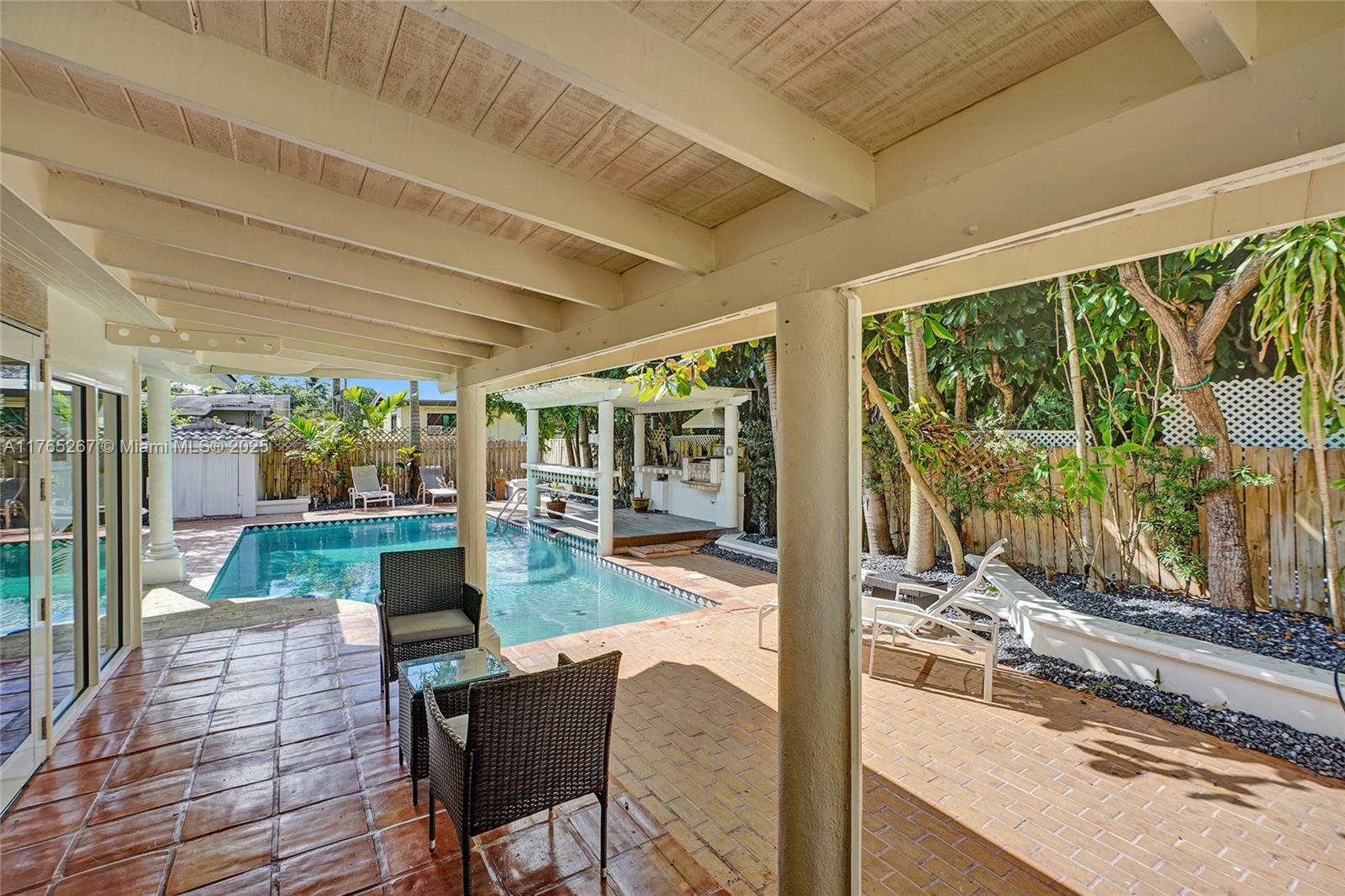 Welcome to this stunning 4-bedroom, 3-bathroom home featuring a spacious open-concept layout perfect for entertaining. The bright and airy living area boasts exposed white ceiling beams, terracotta tile flooring, and large sliding glass doors that open to the backyard. Enjoy the ultimate entertainment space with a pool table and seamless indoor-outdoor living. The kitchen offers warm wood cabinetry, terracotta countertops, and stainless steel appliances. Major upgrades include a new roof, new impact windows and doors, and all-new appliances. Step outside to a private backyard oasis complete with a sparkling pool and a outdoor storage. This move-in-ready gem is a must-see!