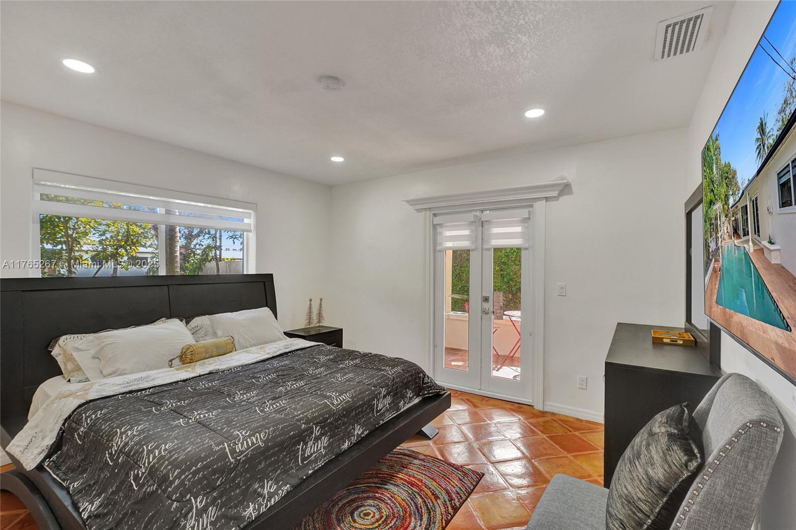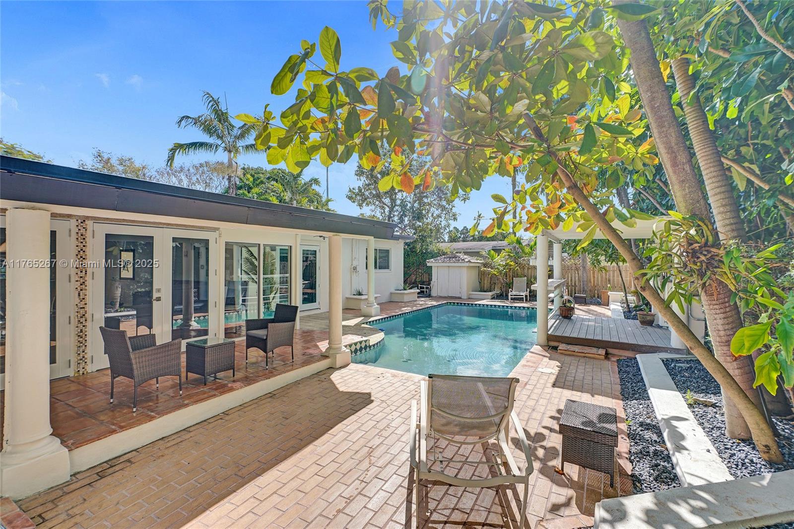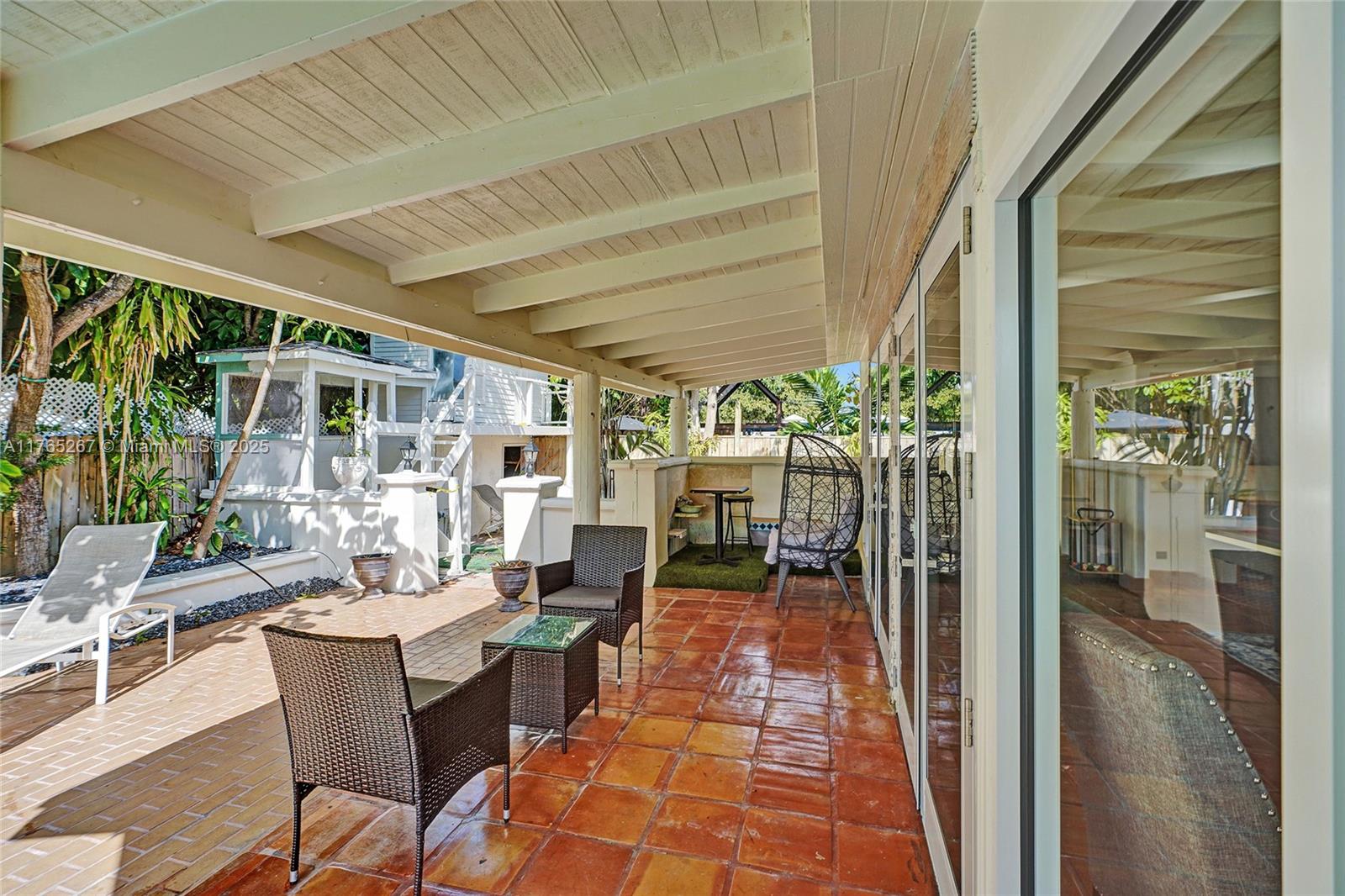 Welcome to this stunning 4-bedroom, 3-bathroom home featuring a spacious open-concept layout perfect for entertaining. The bright and airy living area boasts exposed white ceiling beams, terracotta tile flooring, and large sliding glass doors that open to the backyard. Enjoy the ultimate entertainment space with a pool table and seamless indoor-outdoor living. The kitchen offers warm wood cabinetry, terracotta countertops, and stainless steel appliances. Major upgrades include a new roof, new impact windows and doors, and all-new appliances. Step outside to a private backyard oasis complete with a sparkling pool and a outdoor storage. This move-in-ready gem is a must-see!
