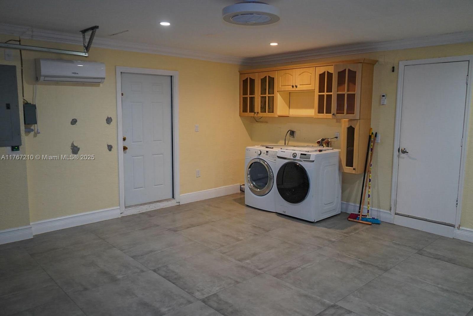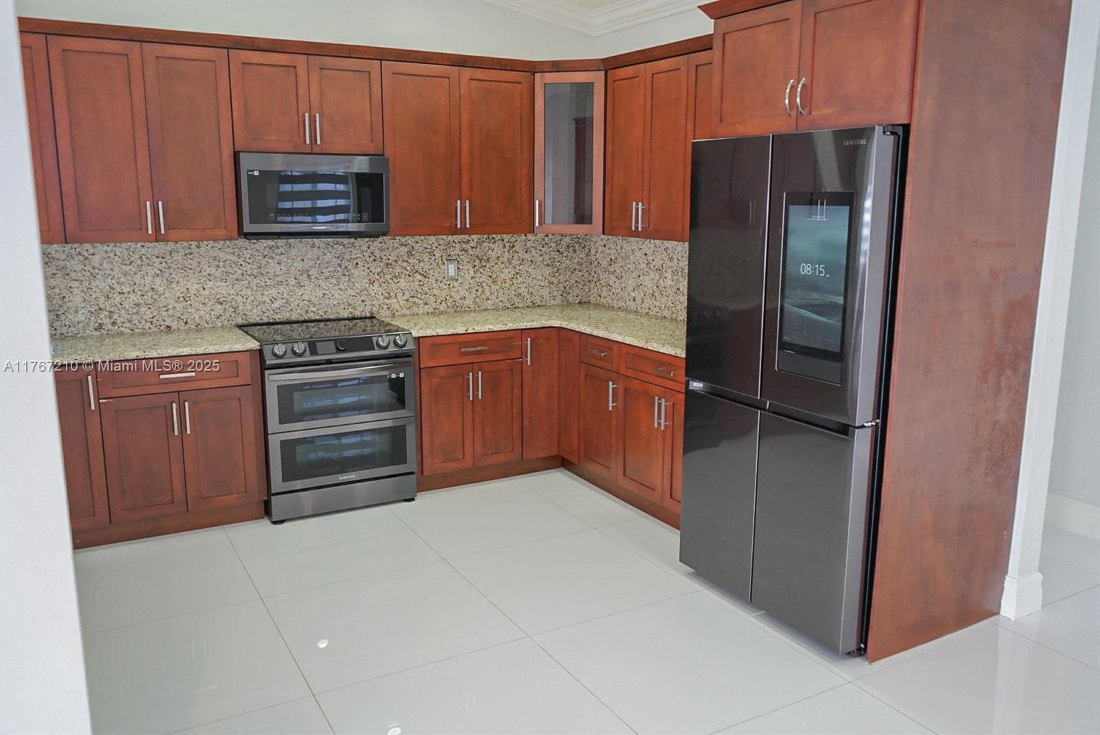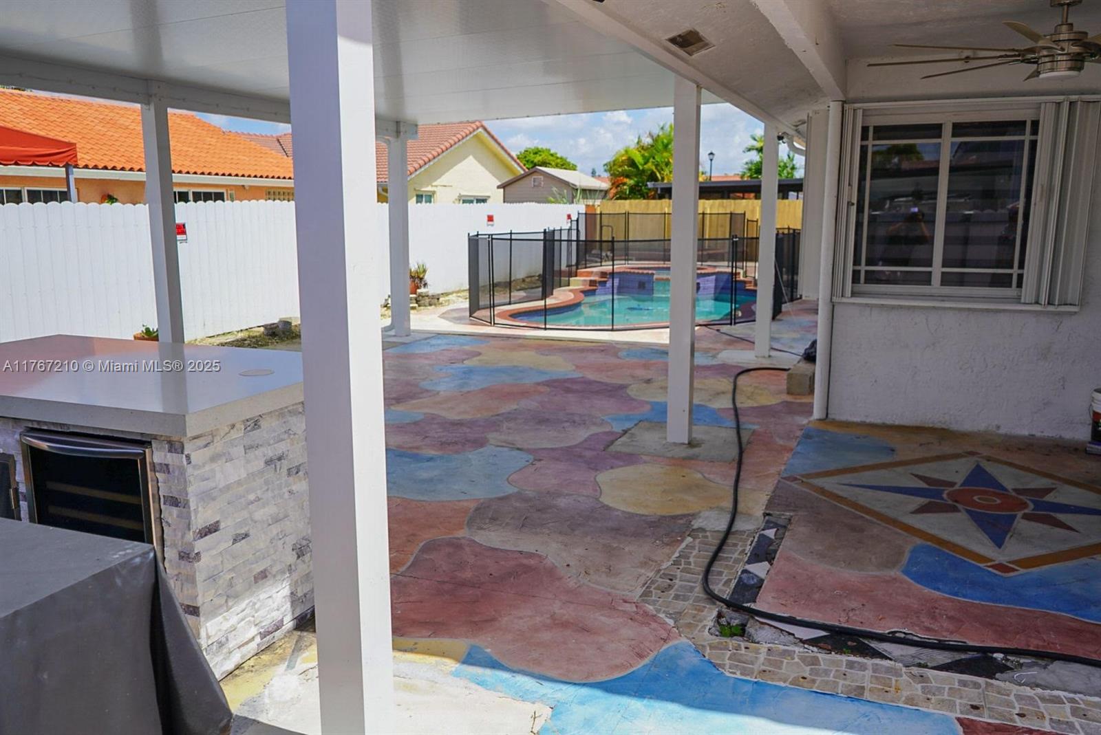 This stunning property has been completely remodeled to offer an impeccable contemporary design. Featuring 3 spacious bedrooms and 2 fully bathrooms, this home is adorned with crown moldings and showcases stunning 24x24 white porcelain tiles throughout, including in the attached 2-car garage. The upgraded kitchen boasts sleek finishes, new light fixtures, and remote-control window shades, enhancing the home’s modern elegance. The circular driveway adds convenience and charm. The outdoor area is an oversized oasis, custom-designed for Miami's year-round sunny enjoyment. Highlights include an illuminated pool, and covered terraces, providing the perfect setting for relaxation and entertaining. Don't miss this incredible opportunity to experience luxurious living in this one-of-a-kind home!