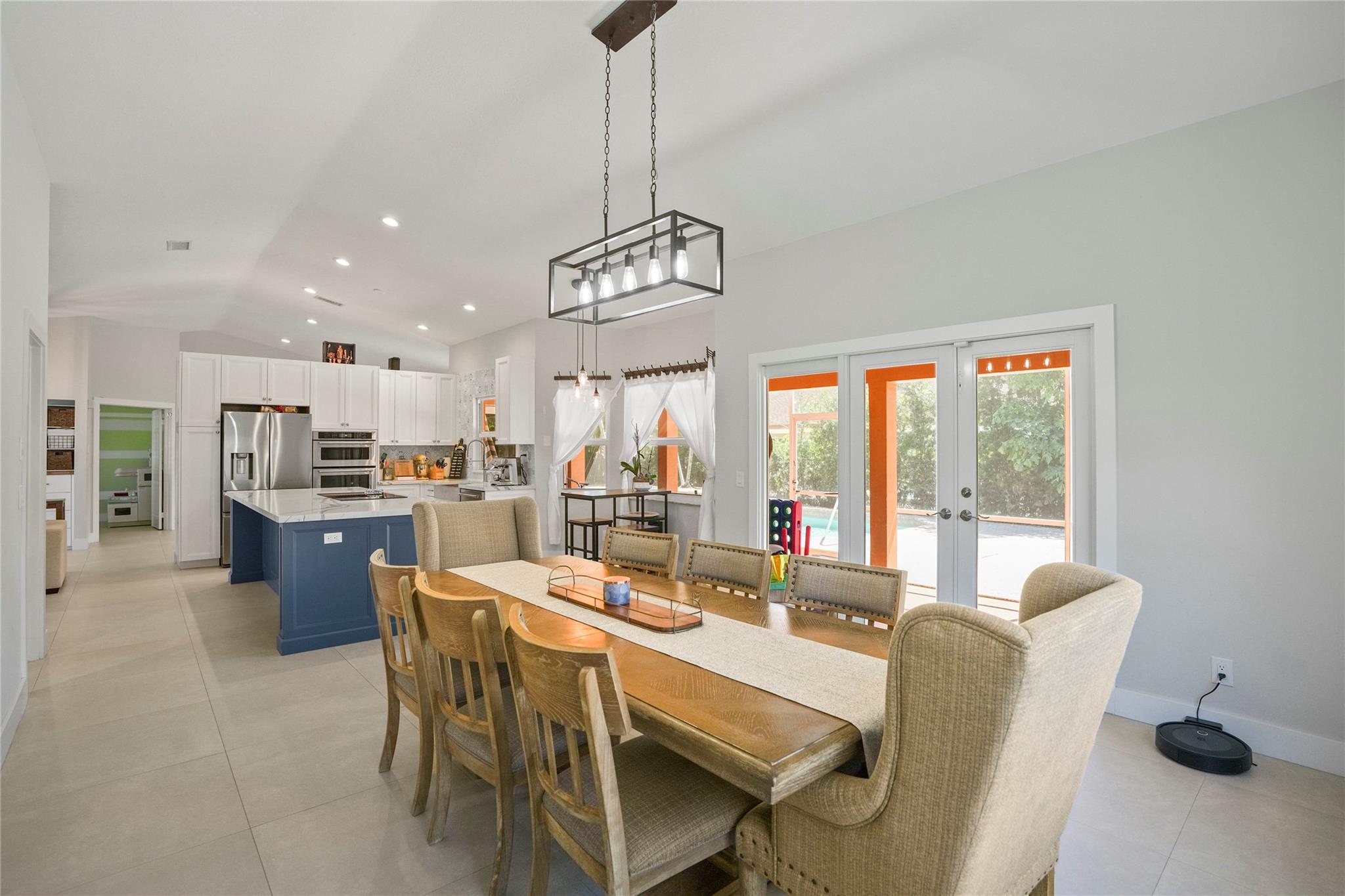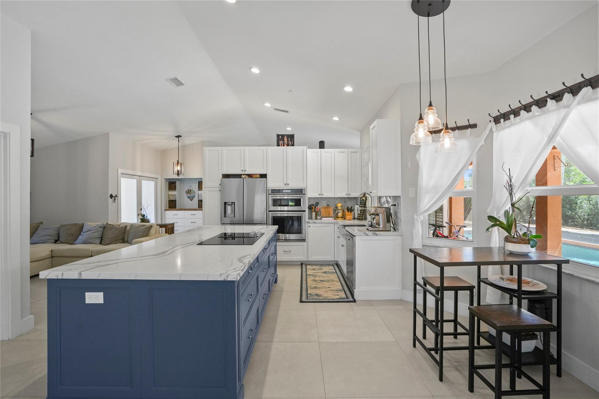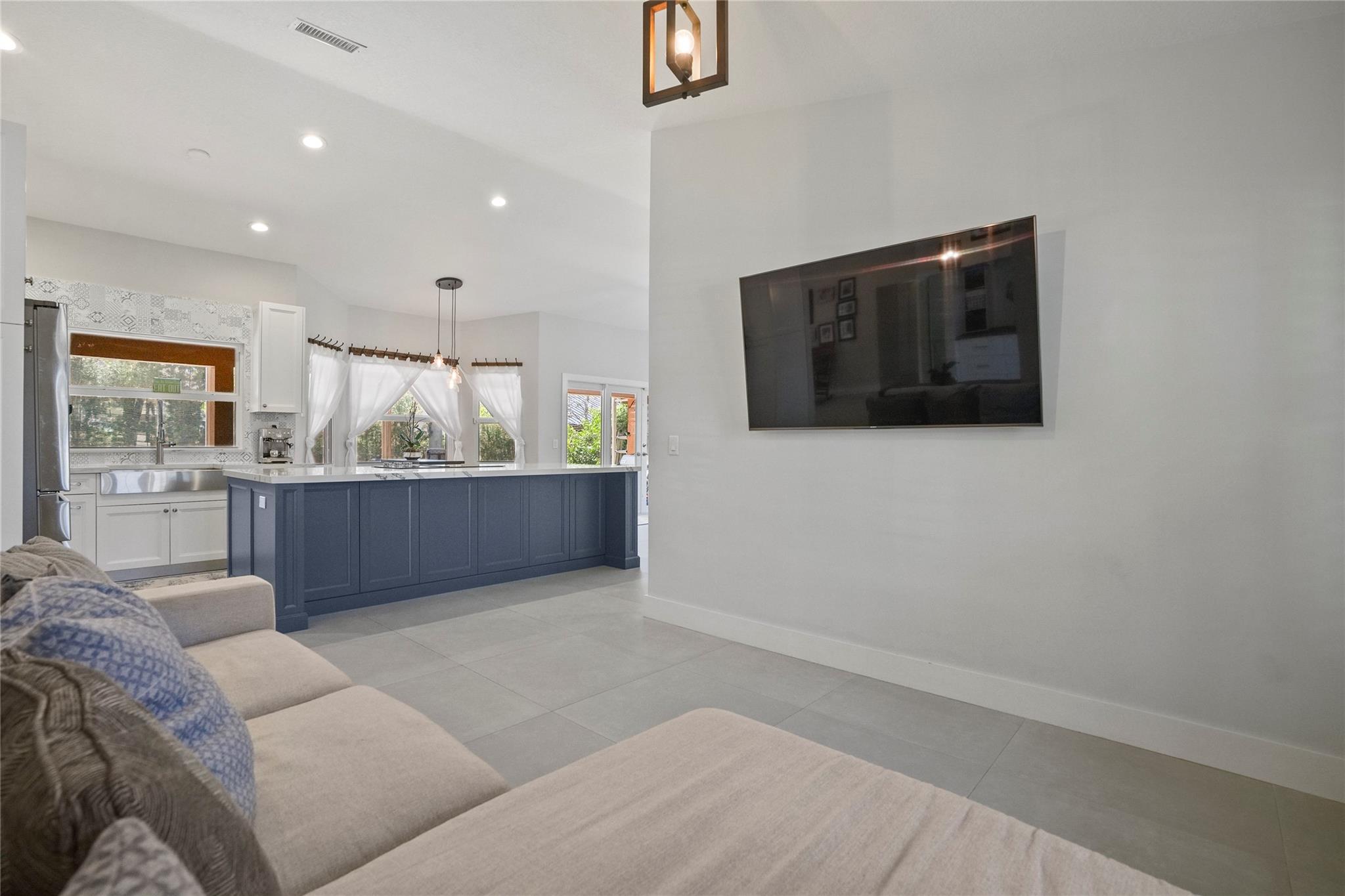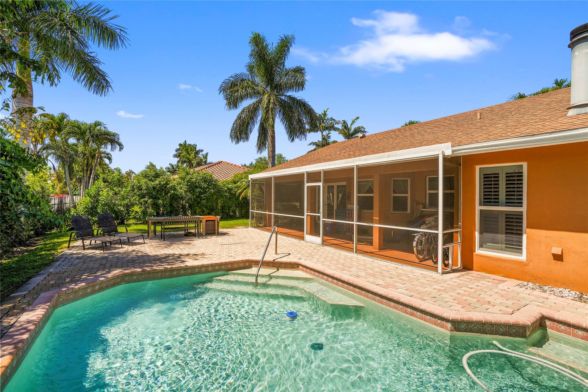 This modern style 3-bed, 2-bath ranch in Pasadena Estates sits on an oversized 1/3+ acre corner lot. Enjoy an open layout with vaulted ceilings, large-format tile, and northern exposure. It features formal dining, a living room with a fireplace, and a family room. The new farmhouse kitchen boasts white shaker cabinets, a blue island with a cooktop, quartz countertops, and stainless steel appliances. The master suite offers a walk-in closet and new bath. Two spacious bedrooms share an updated cabana bath. Outside, a screened patio overlooks a tropical pool, paver sun deck, and large fenced yard. Additional features include a large laundry room, impact windows/doors, new AC, newer fencing, and a 2015 roof. Top-rated schools are nearby
