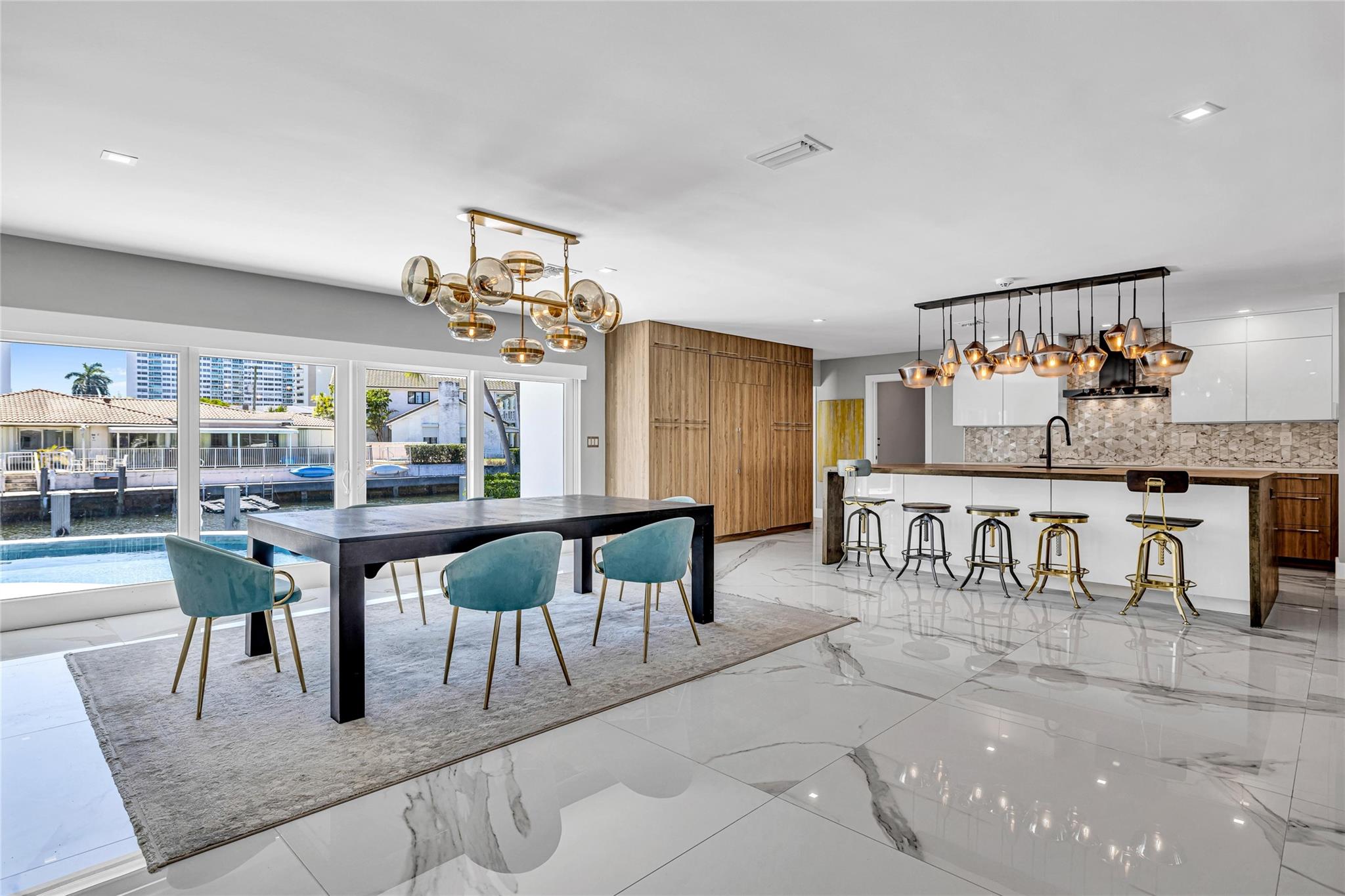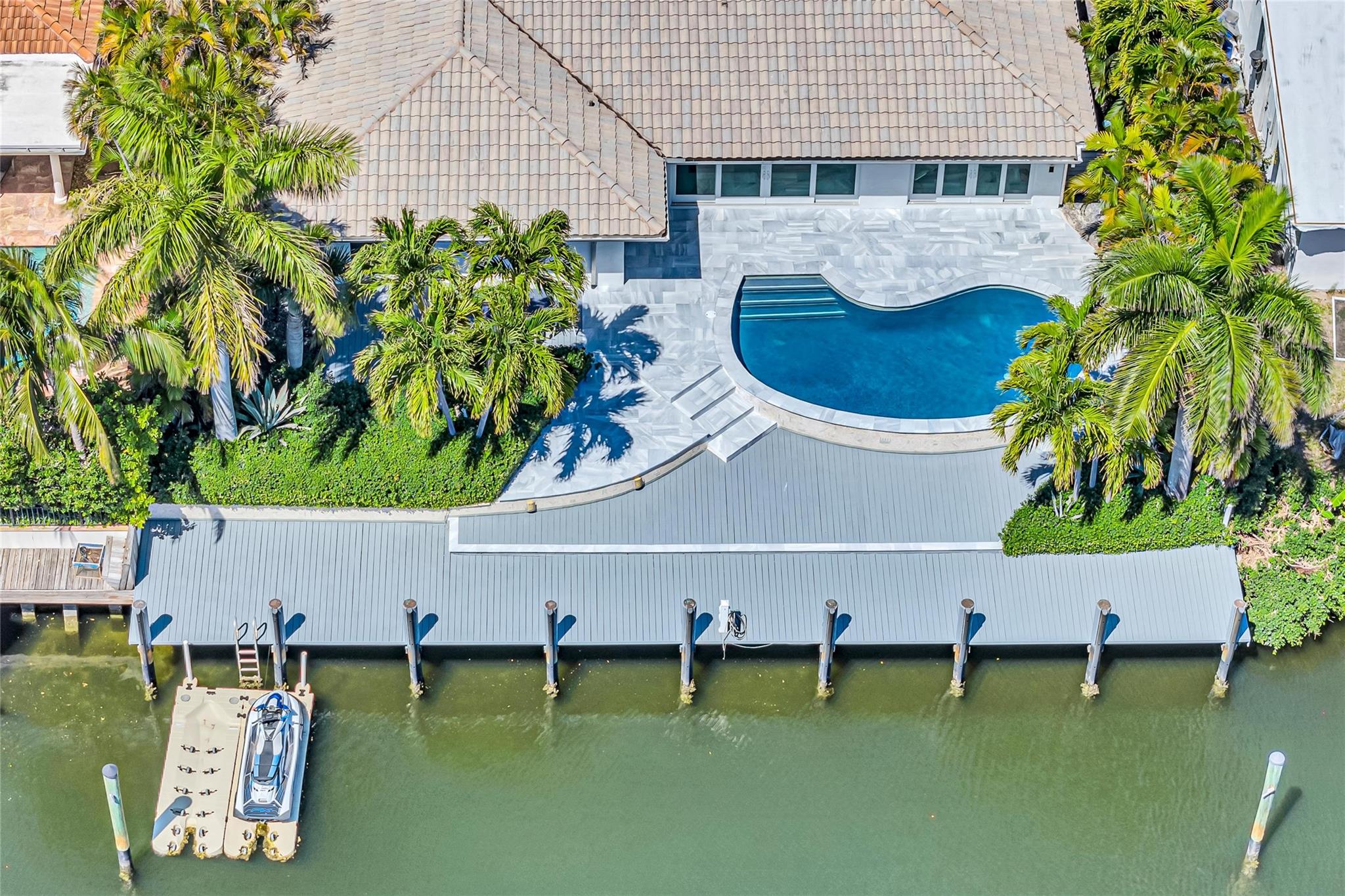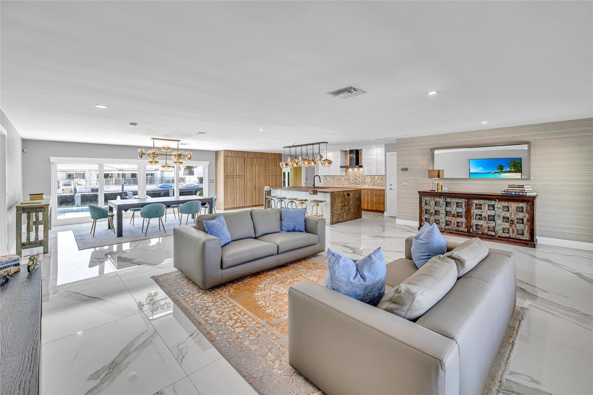 Outstanding waterfront home blocks to the beach in gated Bermuda Riviera. Modern interiors blend seamlessly with the outdoors through wide, sliding glass to a tiered patio and dock surrounding the pool. Designed for entertaining, the kitchen features a long center island, modern appliances and ample storage. The split plan allows each bedroom to enjoy privacy. The primary suite is a quiet retreat with sliders out to the pool, a massive walk-in closet and a 13 x 18 foot bathroom featuring a multi-spray shower. All three baths are updated in modern finishes. 16 foot squares of porcelain flooring is consistent throughout the house. The oversized garage has twin bays with extra wide doors. Multiple dining and shopping options are located within minutes of the property. Home Warranty Included