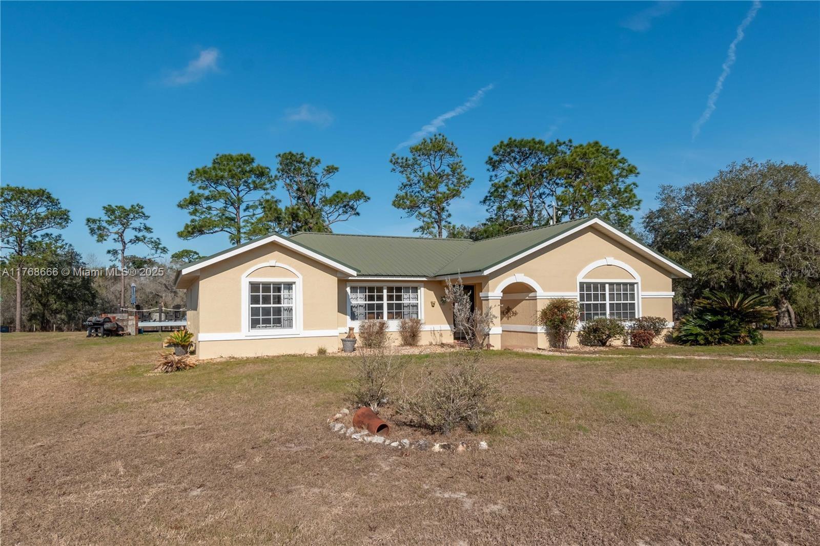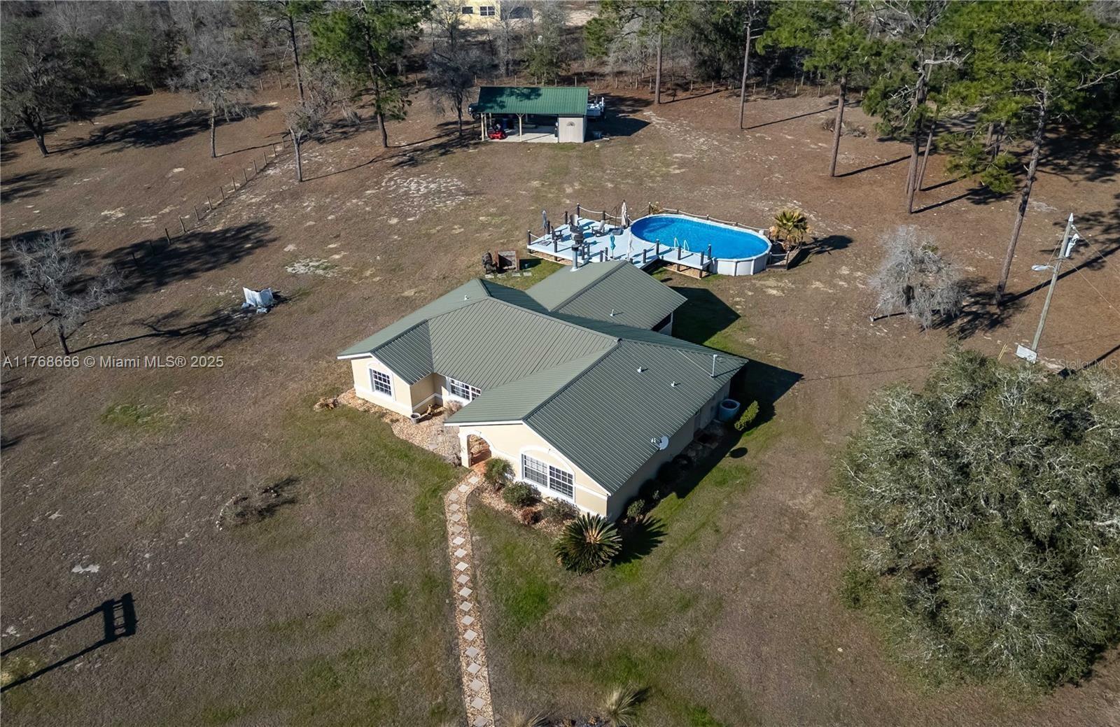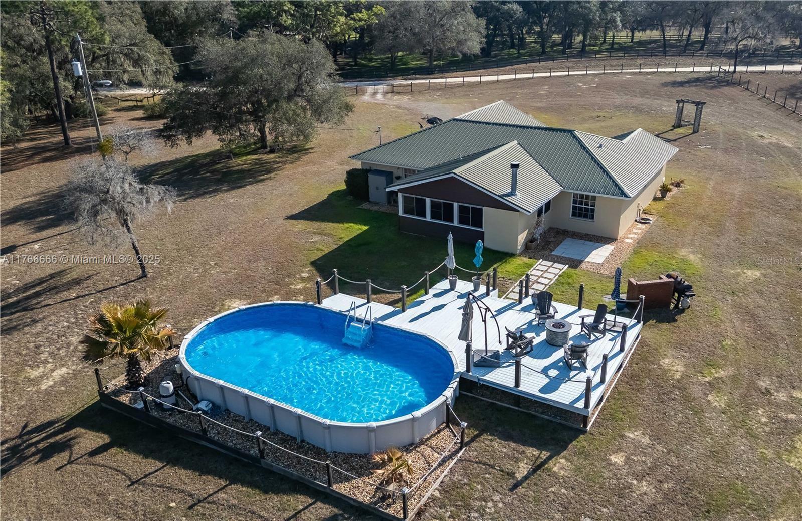 Fox Grove Farms neighborhood, this charming 3/2 home offers the perfect balance of privacy and rural charm—all while being just a short drive from Ocala, Gainesville, and Dunnellon! Set on a corner lot with 5.3 acres of fenced and gated land zoned Agricultural/Rural Residential, this property is well-suited for those seeking a peaceful retreat with the potential for a mini horse farm. Backyard provides a a cozy gas-burning fireplace, ground pool and a raised pool deck. Established on the property is a pole barn with a storage area/workshop– option to fully convert this estate into a functioning horse farm. Fox Grove Farms is a quiet equestrian-friendly neighborhood that is perfect for riding on or off property. Just minutes away for horseback riding, hiking and State Park.