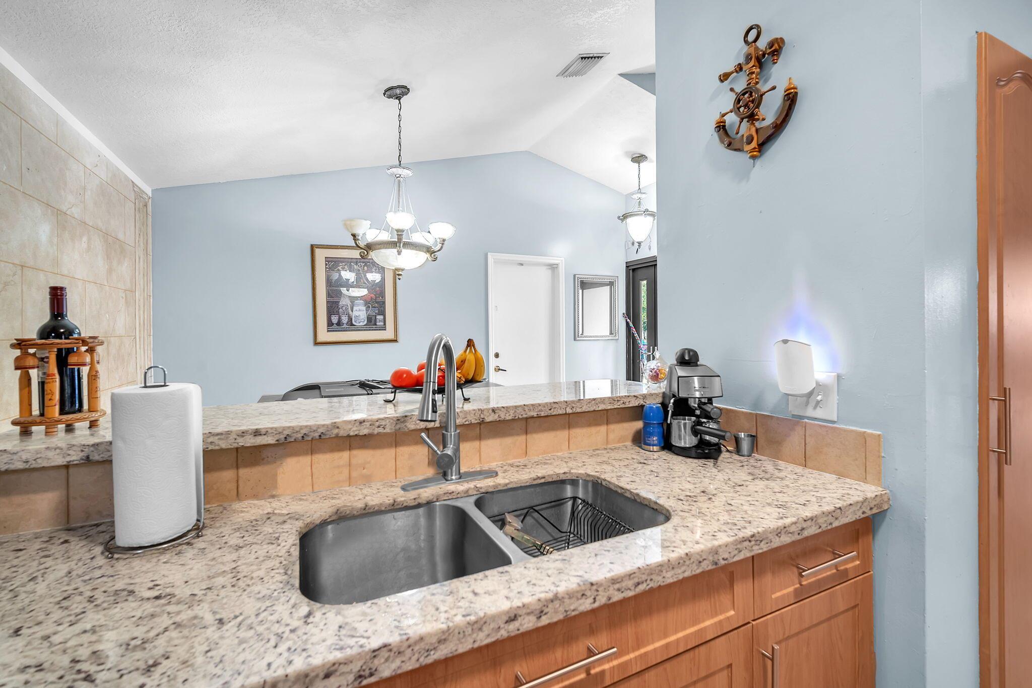 Beautiful 2-bedroom, 2-bathroom home with a bonus den, offering versatility for an office or extra bedroom. The home features upgraded granite countertops, stylish fixtures, and tile flooring throughout. The kitchen is equipped with stainless steel appliances. The spacious living room boasts a cathedral ceiling, creating a bright and open feel. Enjoy updated bathrooms and an indoor laundry area. The fenced-in yard is perfect for privacy, complete with mature fruit trees for added charm