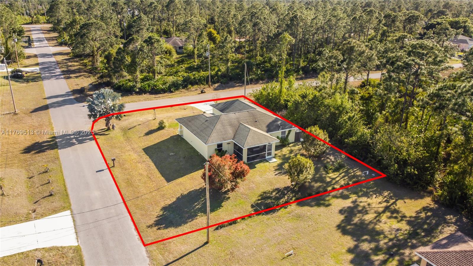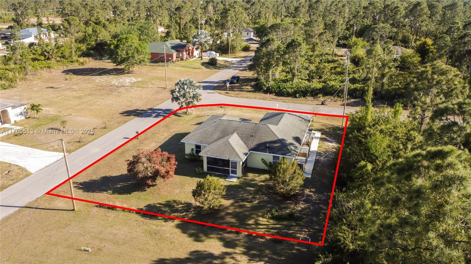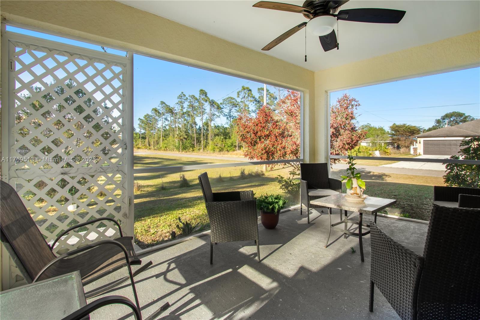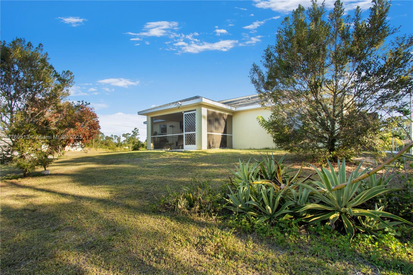 Well-maintained 3BR/2BA single-family home on an oversized corner lot in Lehigh Acres with NO HOA. This property features a split-bedroom floor plan, high vaulted ceilings, open-concept kitchen with breakfast bar, and dedicated laundry room. The main living area offers great flow into the dining space and family room. Enjoy a screened-in covered lanai overlooking a spacious backyard with mature landscaping — ideal for outdoor living or a future pool. Lot provides excellent privacy with no rear neighbors. 2-car garage and extended driveway allow for extra parking. Information is believed to be accurate, but should be independently verified by the buyer's agent. Seller Motivated