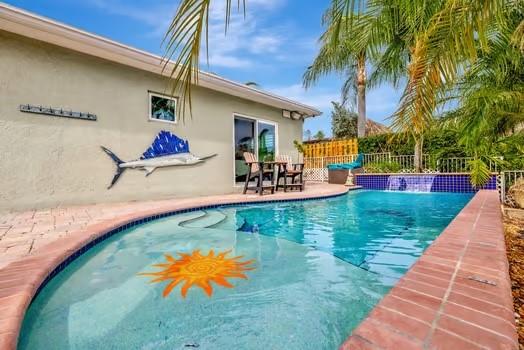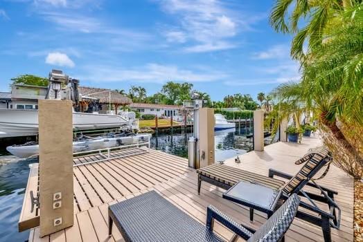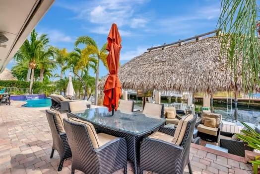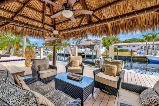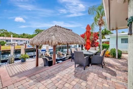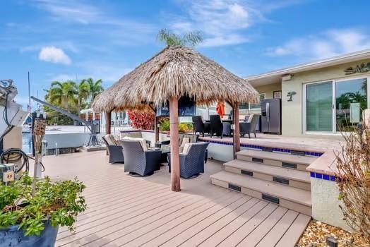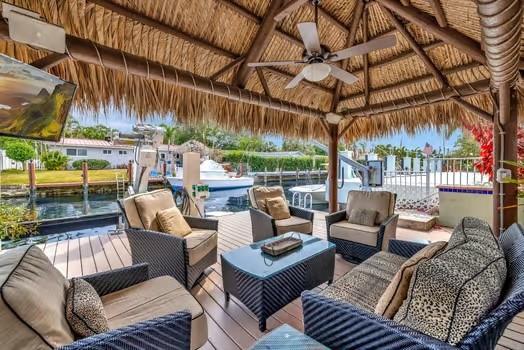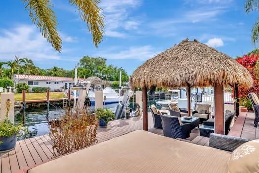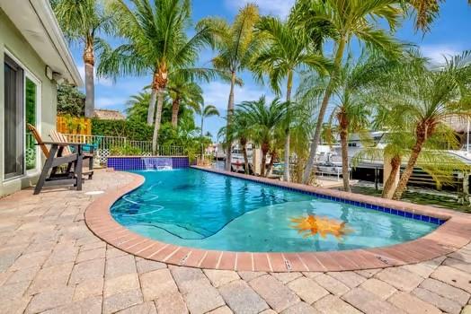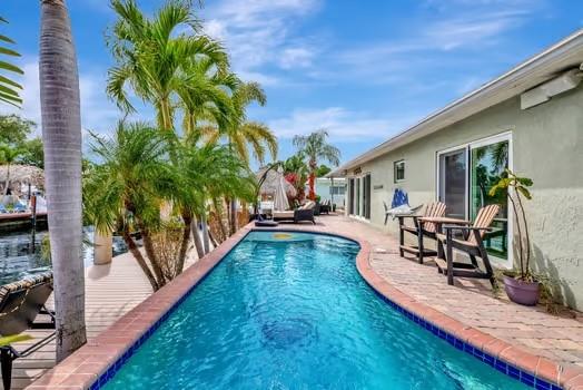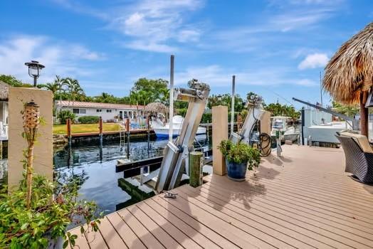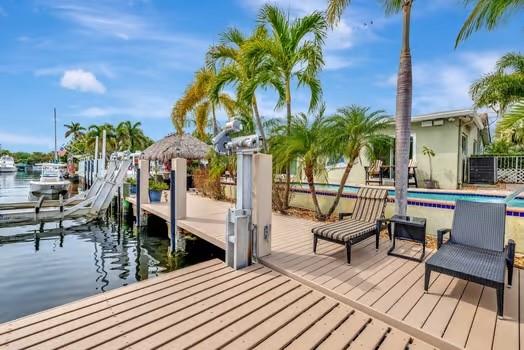 Paradise awaits! Discover your new waterfront home in Pompano Beach, featuring NO FIXED BRIDGES and 77 feet of water frontage with a composite dock and direct ocean access. Boating enthusiasts will love the remote-controlled 25,000 lb boat lift and submersible jet ski lift. Step into your private resort-style backyard, complete with a heated pool, outdoor kitchen, and a luxurious tiki hut equipped with lighting, surround sound, cable, and a ceiling fan. Inside, this beautifully designed home offers 3 bedrooms, 2 bathrooms, a spacious interior laundry room, and a attached garage. The open floor plan includes two living areas and an oversized, remodeled kitchen—perfect for entertaining. All of this is just blocks from the beach, top-rated restaurants, shopping, and private schools.