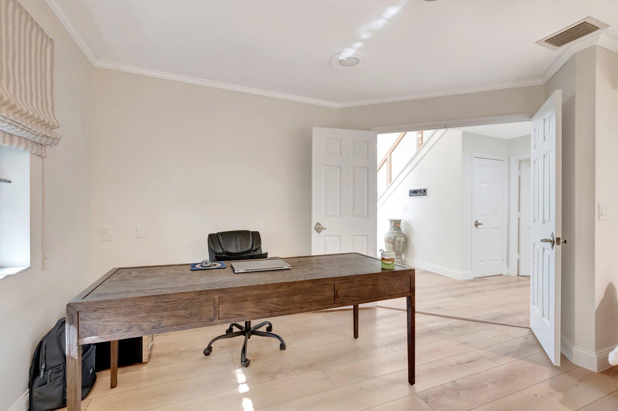 Step into this light-filled, newly renovated residence where timeless style meets modern comfort. The open floor plan and soaring ceilings create a grand yet welcoming ambiance, and the expansive windows draw you to the outdoor oasis, perfect for everyday living or elegant entertaining.The expansive primary suite is thoughtfully situated on the main floor and offers a true retreat, complete with a beautifully remodeled spa-inspired bathroom, dual walk-in closets, and generous additional storage. Also on the main level is a flexible space ideal as a den, office, or guest bedroom, paired with another fully updated bathroom for added convenience.