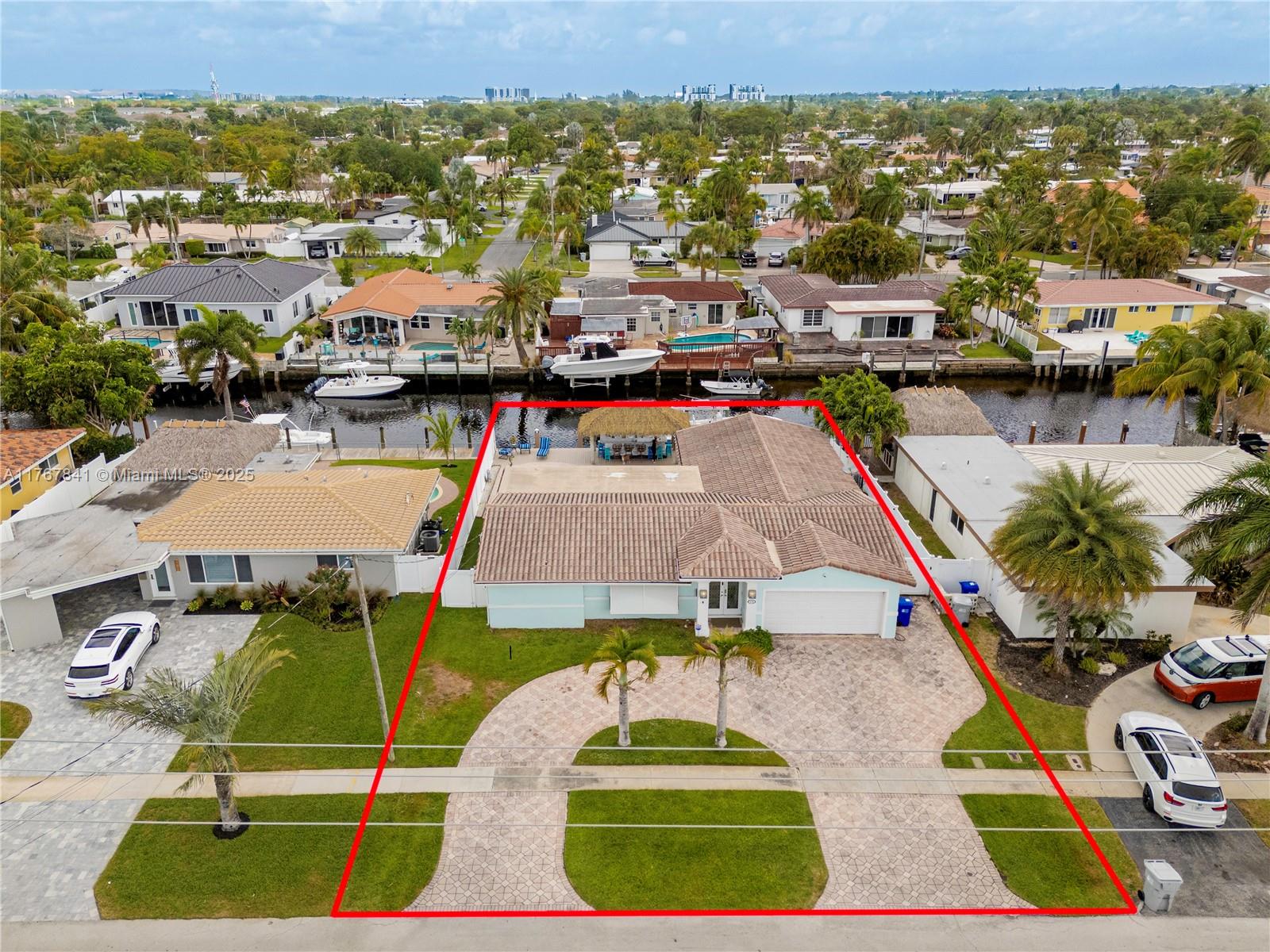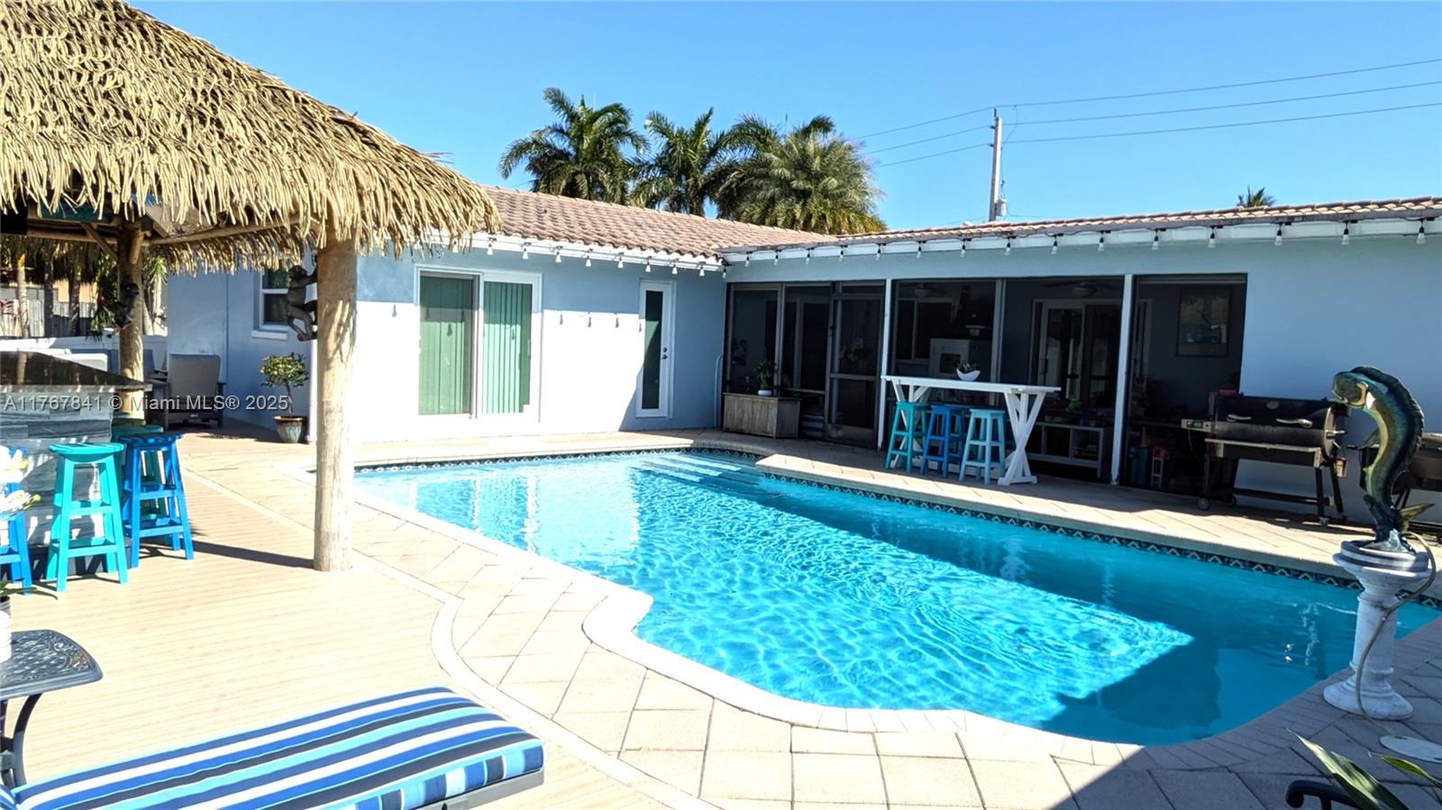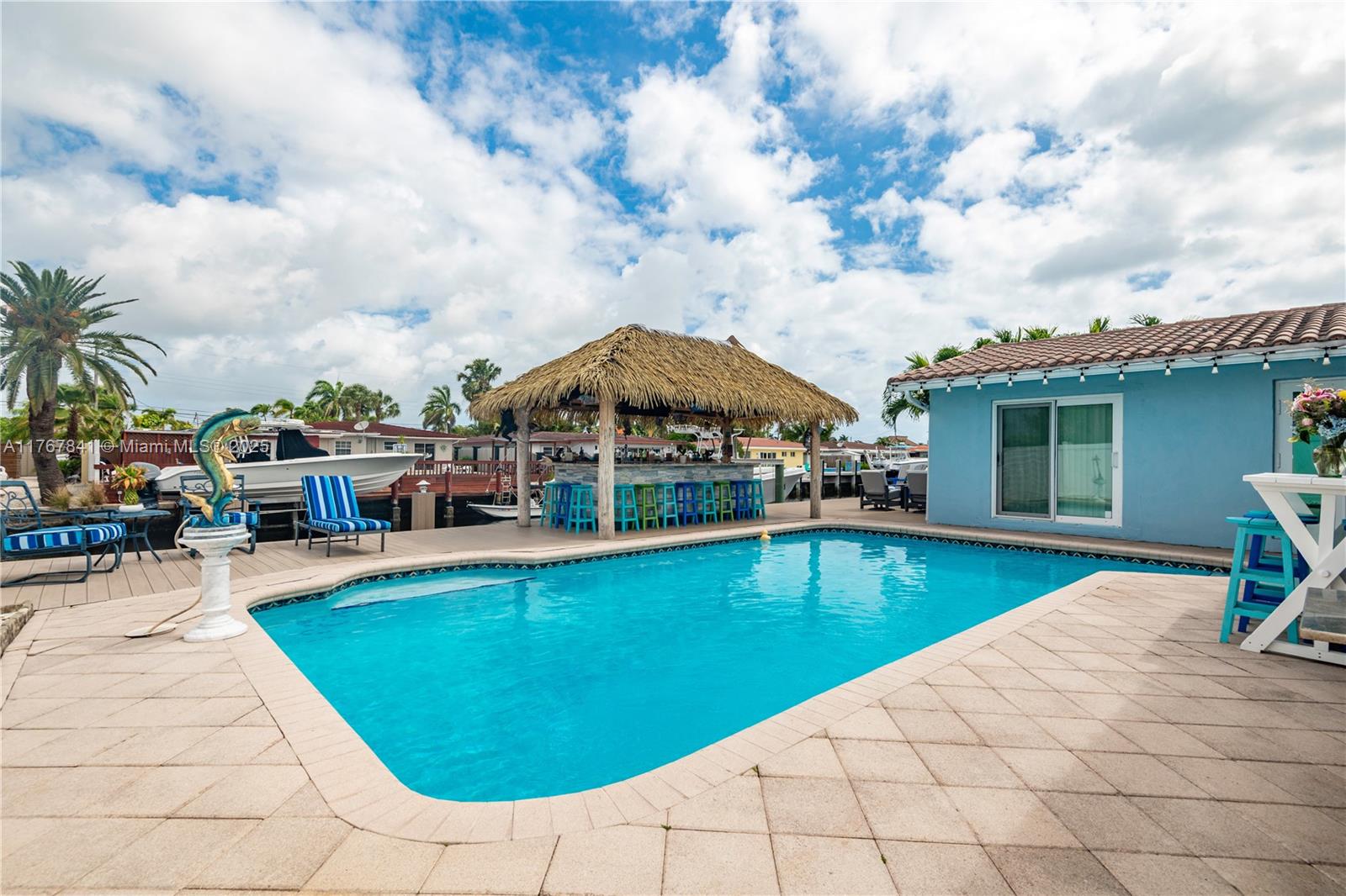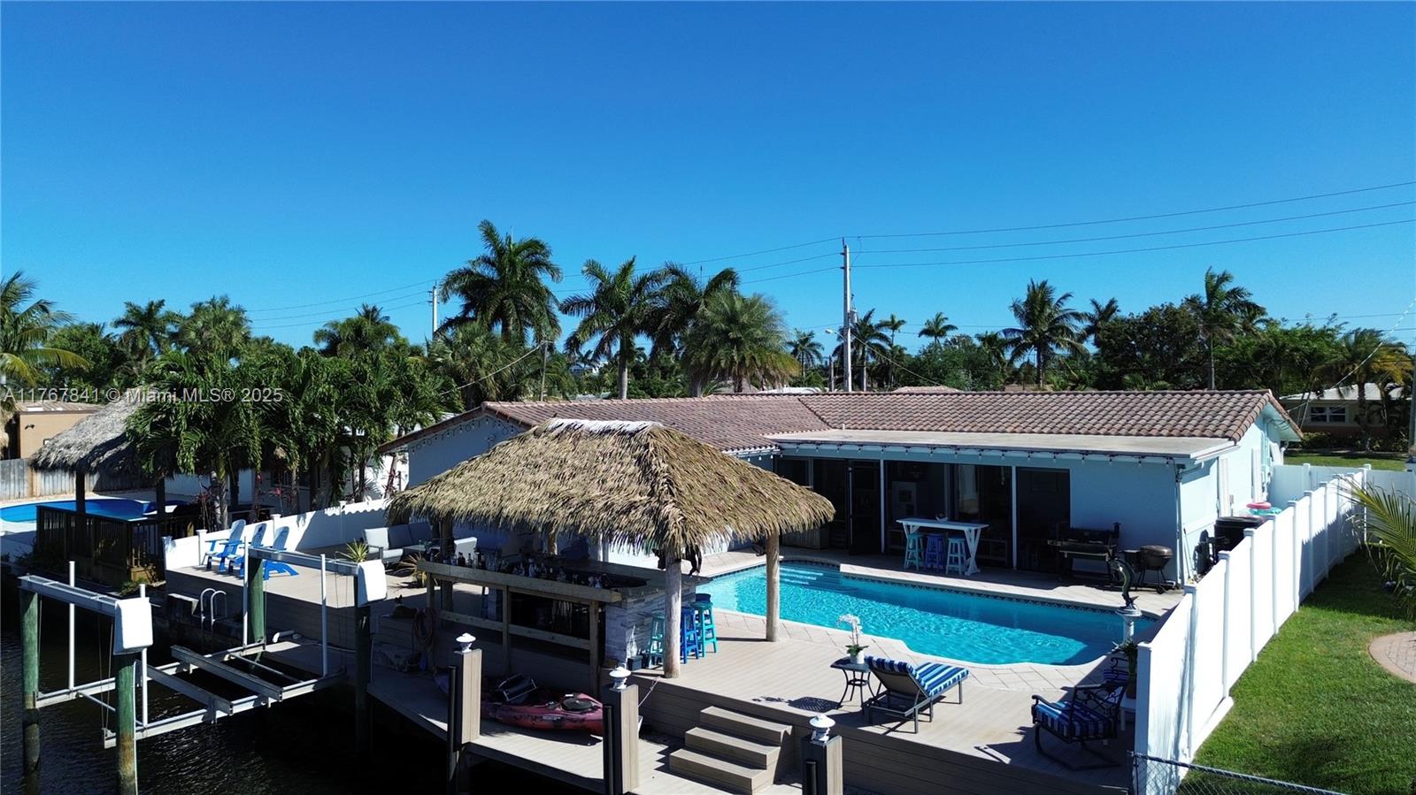 Resort-style living in this waterfront property. Bring your boat to this ocean access, split floor plan home. Complete hurricane windows, doors, and garage door. 3-bedroom, 2-bathroom gem includes a heated pool. 2-car garage is air-conditioned and carpeted & auto garage door opener. NO CAST IRON PIPES, build with PVC. Backyard paradise, complete with a TIKI Bar featuring refrigerators, ice maker, & sink. Enjoy ample room for entertaining under the synthetic palm roof. Take advantage of the $10,000lb four-post boat lift, second bridge clearance same as Federal Highway bridge. The large primary bedroom and bath include a separate shower, whirlpool tub, and walk-in closet. Each bedroom has a walk-in closet. EV charger. East Pompano Beach close to beaches, I-95, shopping & restaurants