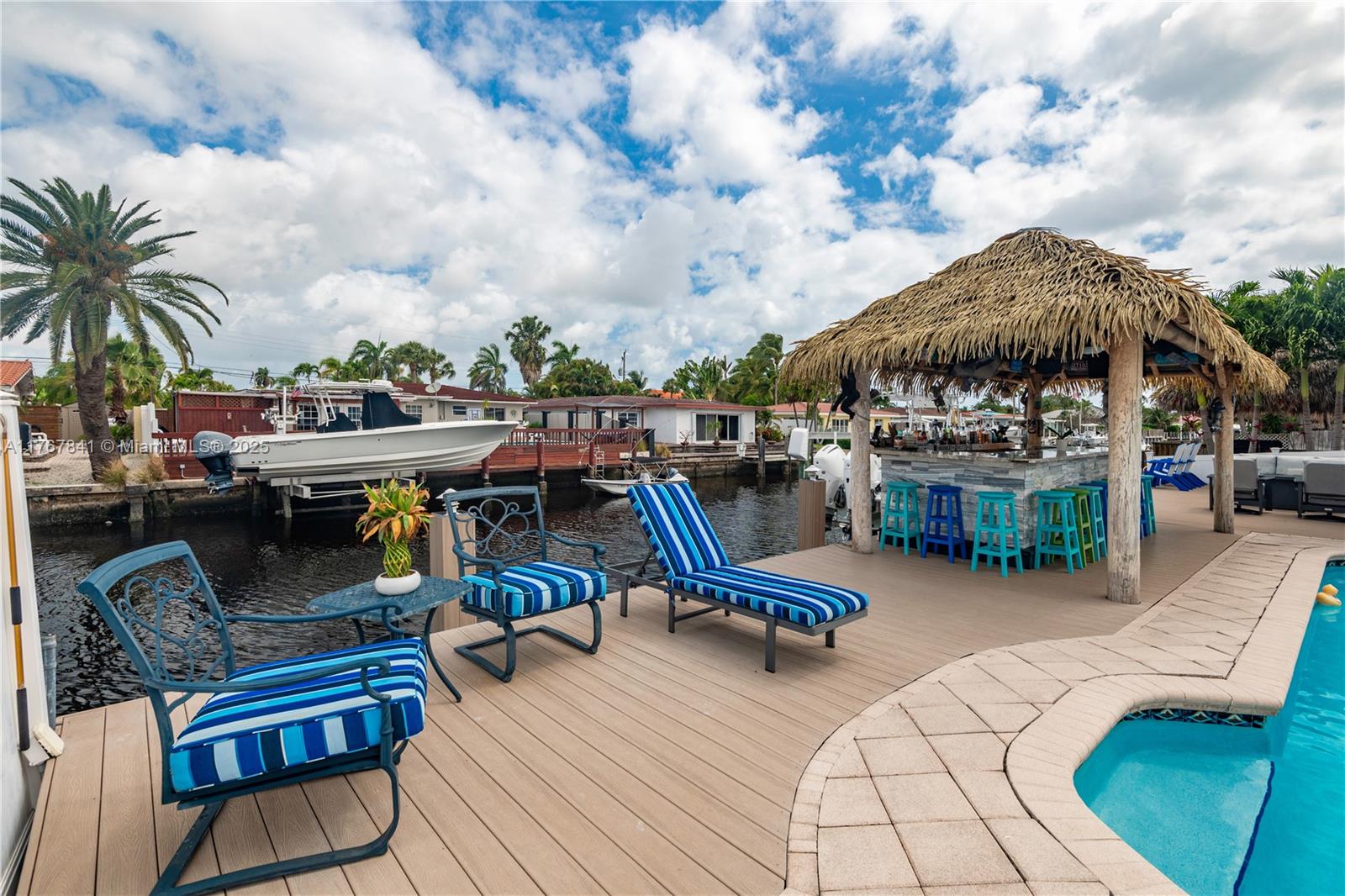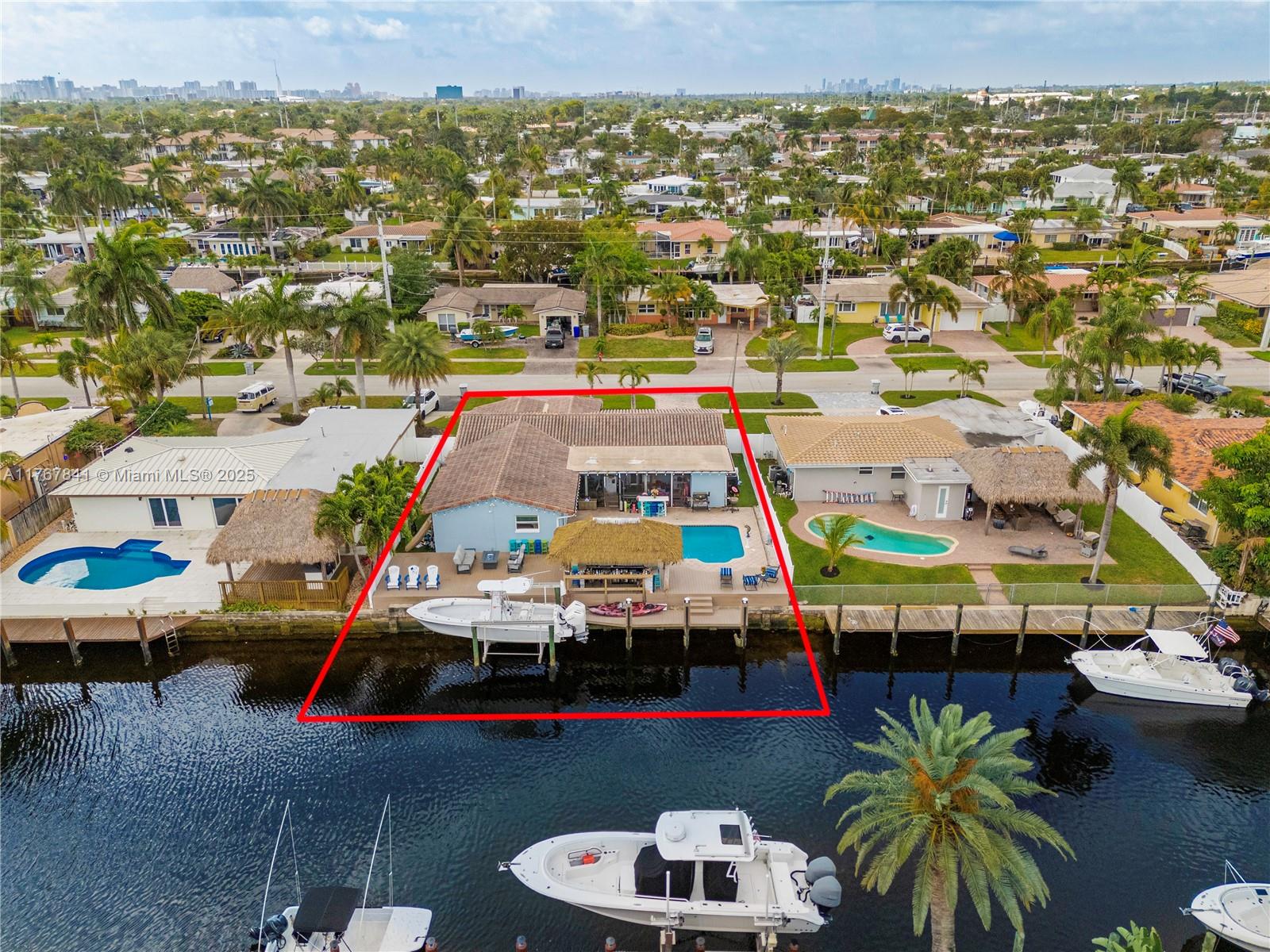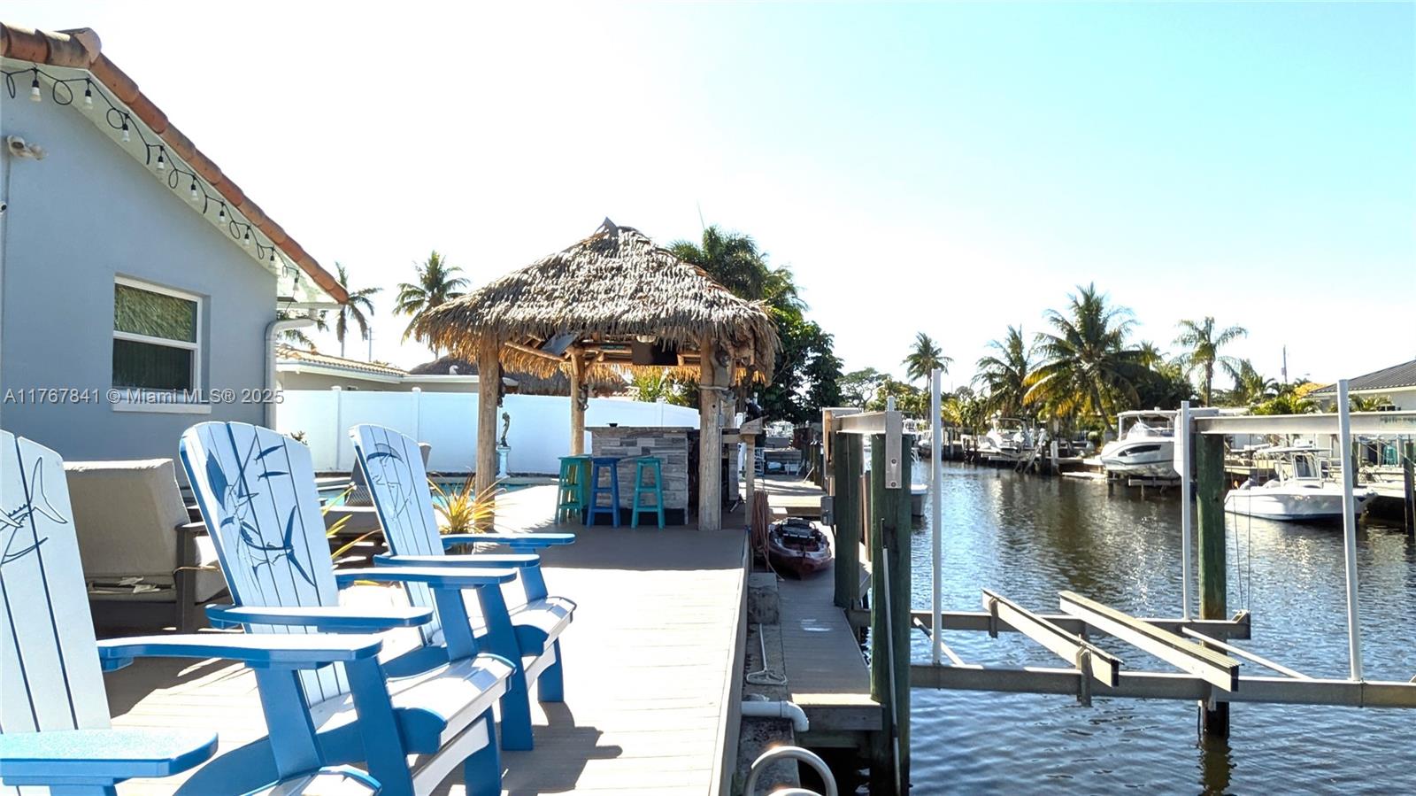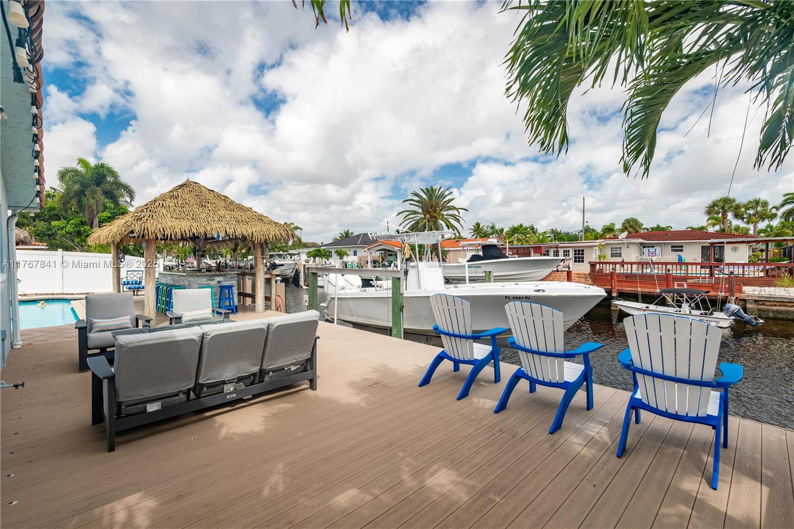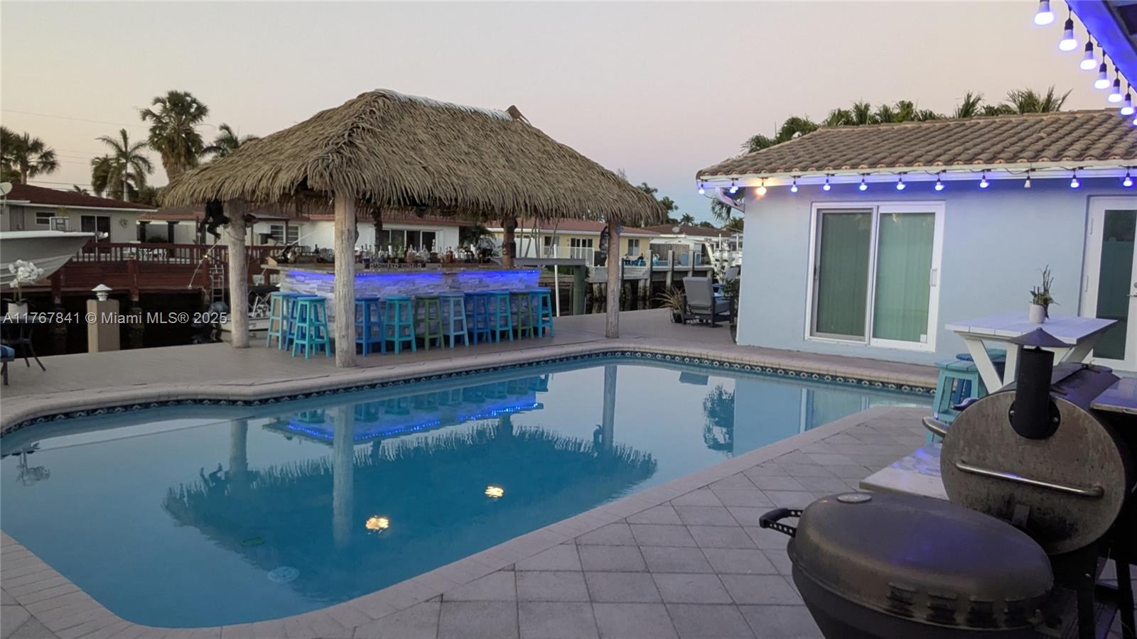 Resort-style living in this waterfront property. Bring your boat to this ocean access, split floor plan home. Complete hurricane windows, doors, and garage door. 3-bedroom, 2-bathroom gem includes a heated pool. 2-car garage is air-conditioned and carpeted & auto garage door opener. NO CAST IRON PIPES, build with PVC. Backyard paradise, complete with a TIKI Bar featuring refrigerators, ice maker, & sink. Enjoy ample room for entertaining under the synthetic palm roof. Take advantage of the $10,000lb four-post boat lift, second bridge clearance same as Federal Highway bridge. The large primary bedroom and bath include a separate shower, whirlpool tub, and walk-in closet. Each bedroom has a walk-in closet. EV charger. East Pompano Beach close to beaches, I-95, shopping & restaurants