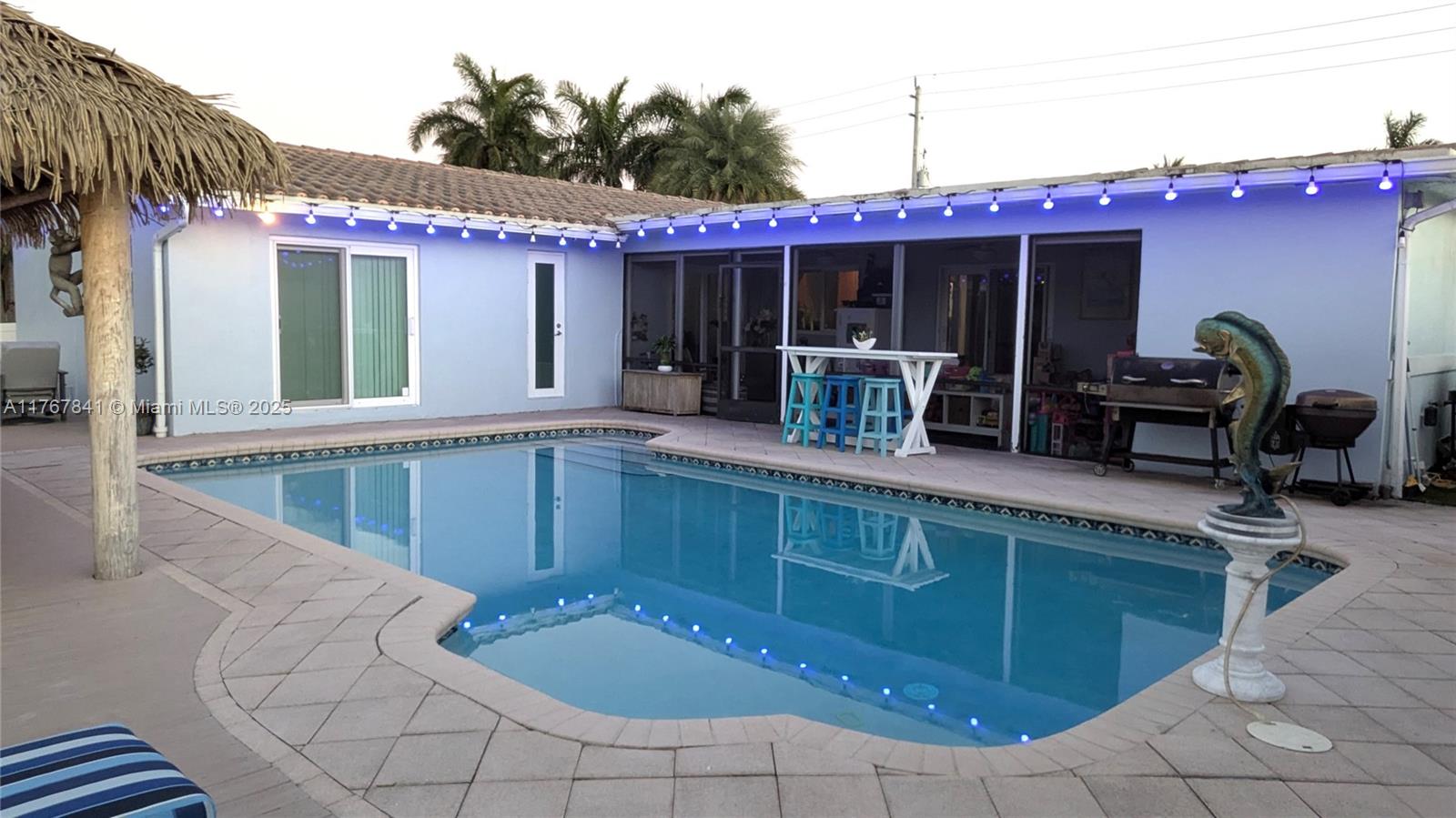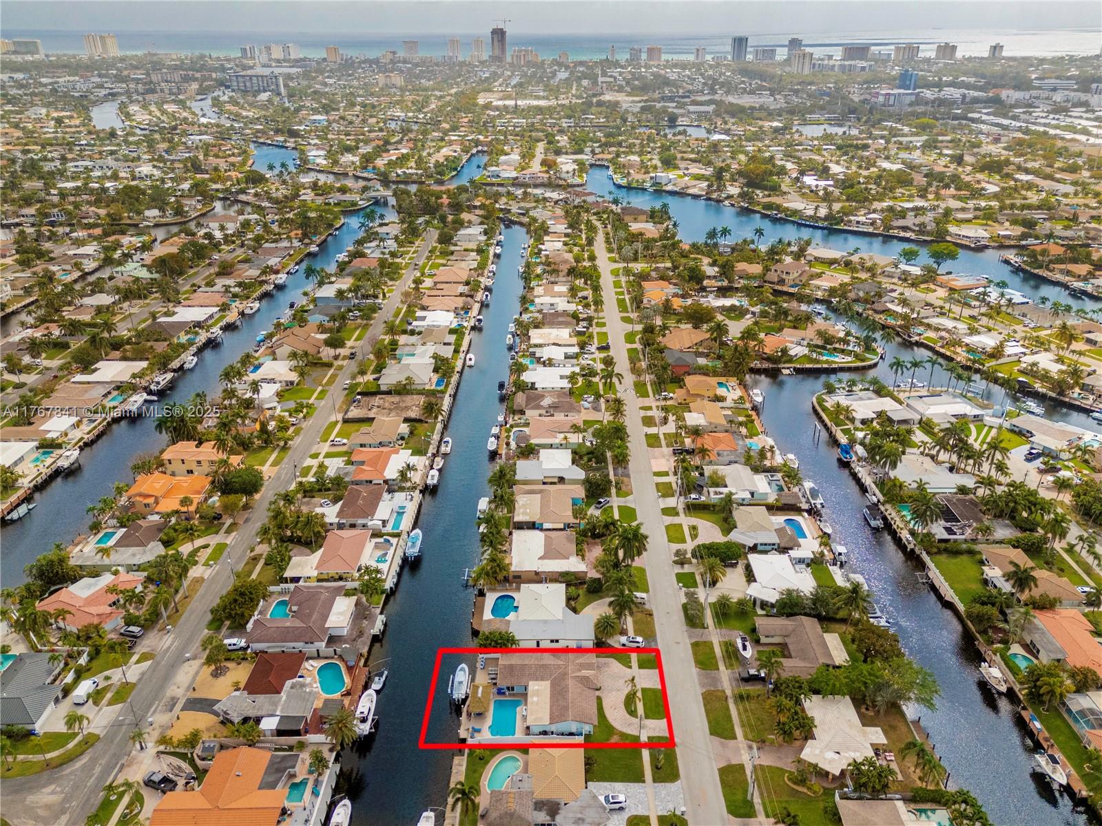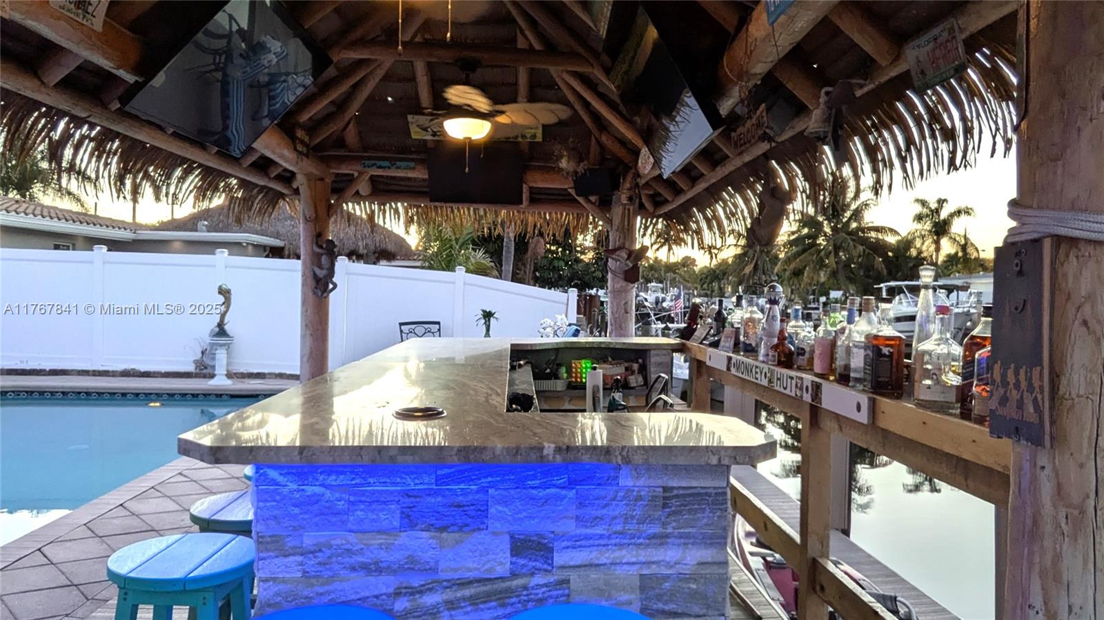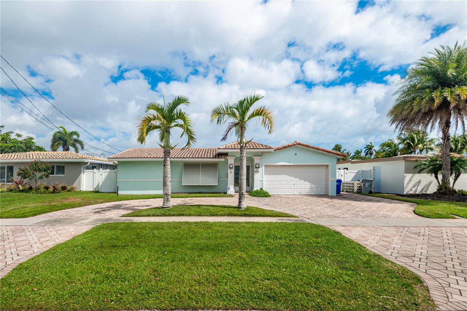 Resort-style living in this waterfront property. Bring your boat to this ocean access, split floor plan home. Complete hurricane windows, doors, and garage door. 3-bedroom, 2-bathroom gem includes a heated pool. 2-car garage is air-conditioned and carpeted & auto garage door opener. NO CAST IRON PIPES, build with PVC. Backyard paradise, complete with a TIKI Bar featuring refrigerators, ice maker, & sink. Enjoy ample room for entertaining under the synthetic palm roof. Take advantage of the $10,000lb four-post boat lift, second bridge clearance same as Federal Highway bridge. The large primary bedroom and bath include a separate shower, whirlpool tub, and walk-in closet. Each bedroom has a walk-in closet. EV charger. East Pompano Beach close to beaches, I-95, shopping & restaurants