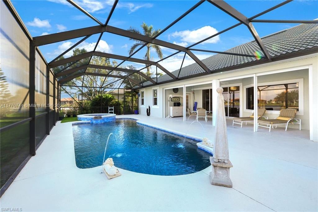 Luxury lakefront pool home with golf course views on a private pie-shaped lot at the end of a peaceful cul-de-sac. Remihalo whole-house filtration with UV in the ducts to prevent mold, bacteria & dust. The windows in the dining and piano room are NOT impact resistant but have electric storm shutters for protection and an electric shutter on the patio to easily store furniture. The rest of the home has impact-resistant windows PLUS accordion shutters for extra protection. Generator included and new security lights around the perimeter of the home. LED lighting & floored attic space for additional storage. Mature Mango, avocado, key lime & banana trees. Updated irrigation system. Low HOA Fees. Purchase with confidence knowing a 1-year home warranty is included.