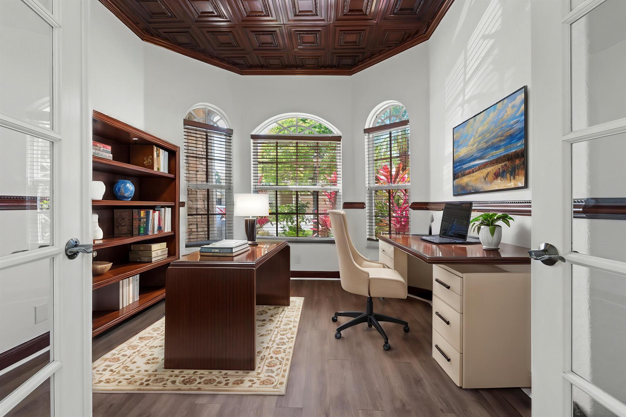 Welcome to a stunning masterpiece in the prestigious Versailles community of Wellington! This residence is a true gem, offering an exquisite blend of elegance, comfort, and luxurious living. With 5 bedrooms, a spacious office/den, and an expansive upstairs loft, there's room for everyone to thrive.The home boasts breathtaking volume ceilings adorned with intricate tin details, while the hardwood flooring and high-quality granite and cabinetry add warmth and sophistication throughout. The gourmet kitchen is a chef's dream, featuring a gas range, double wall ovens, a wood-paneled refrigerator, and 42'' custom wood cabinetry perfect for whipping up culinary creations that delight the senses.Impact windows & doors throughout.Whole home generator! Roof certified for 10 more years.