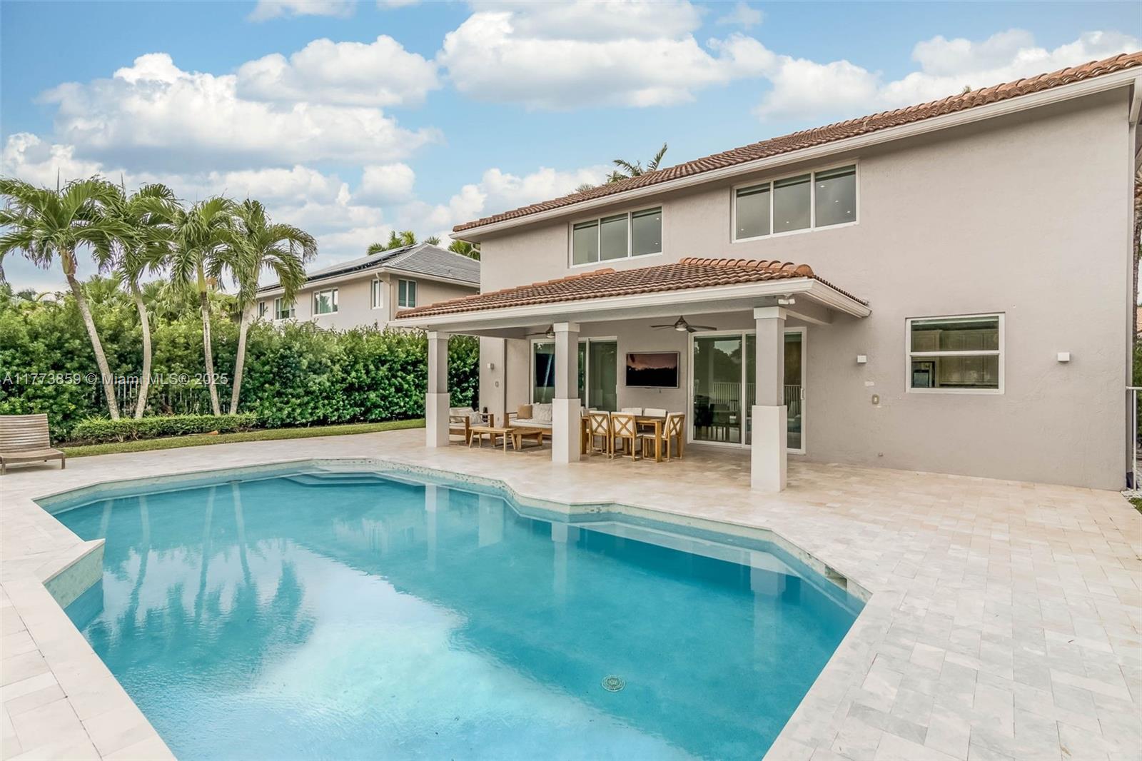 IMPACT WINDOWS & DOORS throughout, this home blends luxury & security. Beautiful Lake home offers an impressive sense of space with soaring ceilings and expansive living areas, designed for both everyday comfort and effortless entertaining. The open-concept kitchen flows seamlessly into the spacious family room, ideal for gatherings large or small. Enjoy the convenience of a full bedroom and bath on the first floor. Upstairs, sleek glass stair rails and wood flooring add a touch of elegance throughout. The expansive primary suite is a true retreat, featuring a serene sitting area and spa-inspired bathroom, all overlooking panoramic lake views. Step outside to your private oasis: a covered patio, sparkling Salt pool, and marble deck await, set against the tranquil lake backdrop.