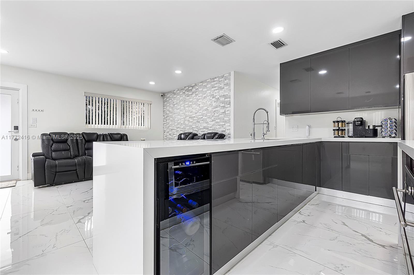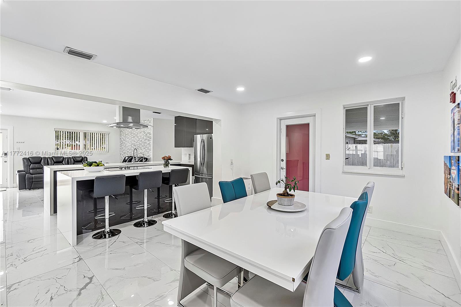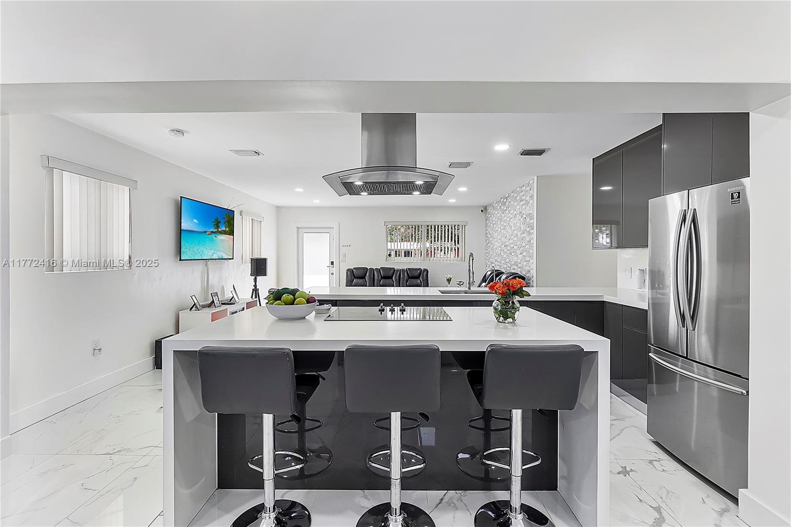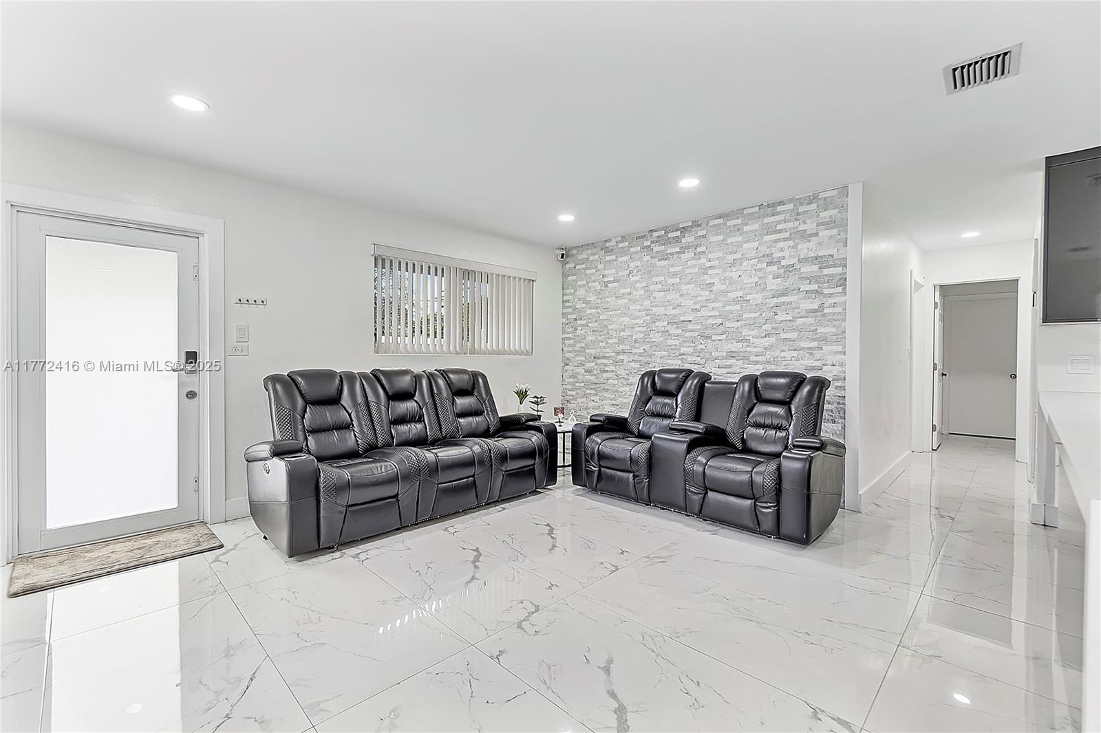 Fully renovated 3-bedroom, 2-bathroom home in the heart of Hollywood, The open concept living space is highlighted by a jaw-dropping quartz waterfall kitchen island, elegant soft close cabinetry, a built-in wine cooler, and stainless steel appliances, making it a dream for both cooking and entertaining. With Calacatta porcelain tile throughout the main living areas and bathrooms, paired with LED recessed lighting, Impact windows, and doors provide security and energy efficiency, no cast iron pipes, Titan tankless water heater, A/C unit, smart door look/unlock monitoring system, all renovation and update done late 2021 including the replacement of the roof, plenty room for pool. This home is truly move-in ready