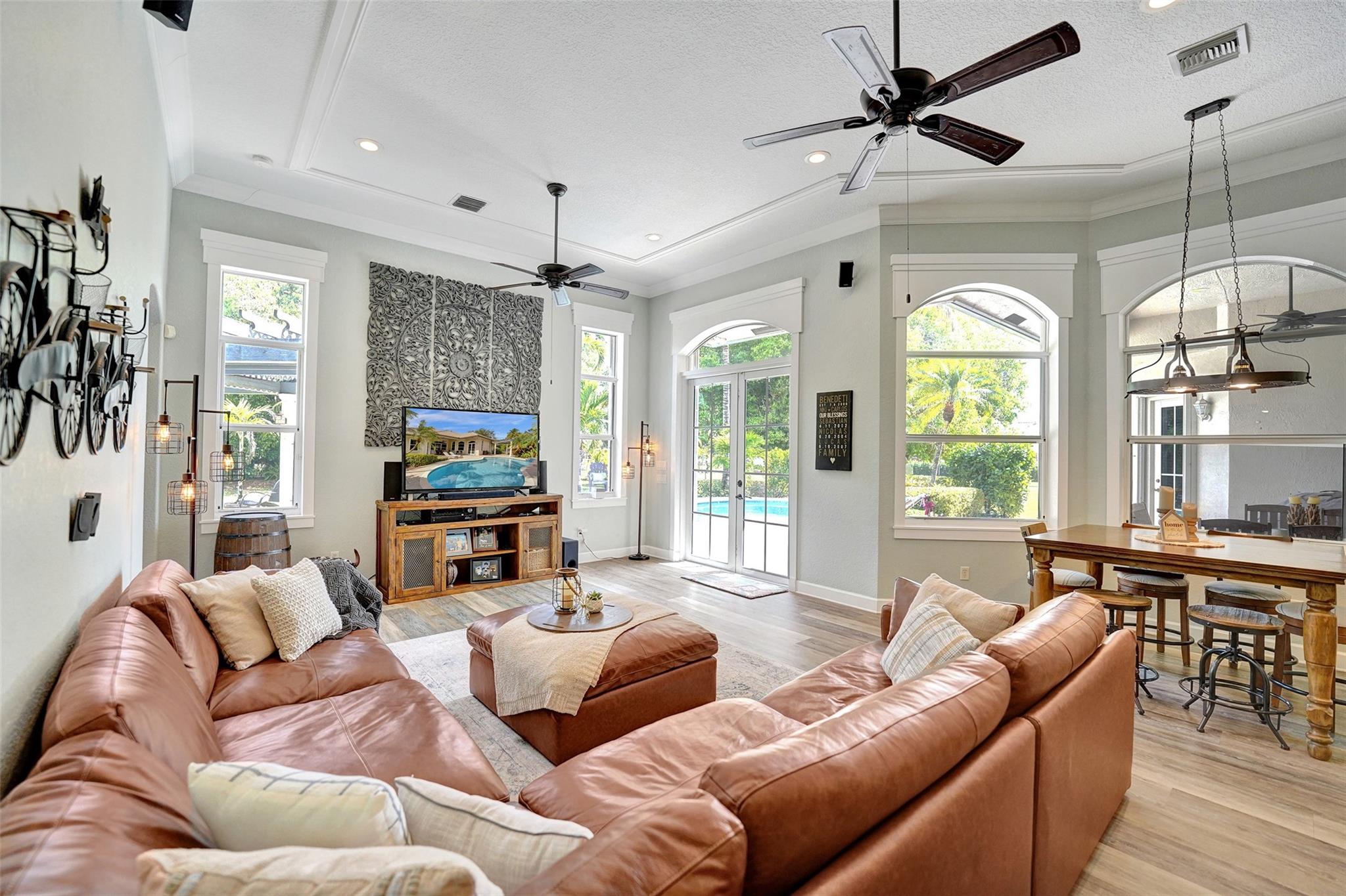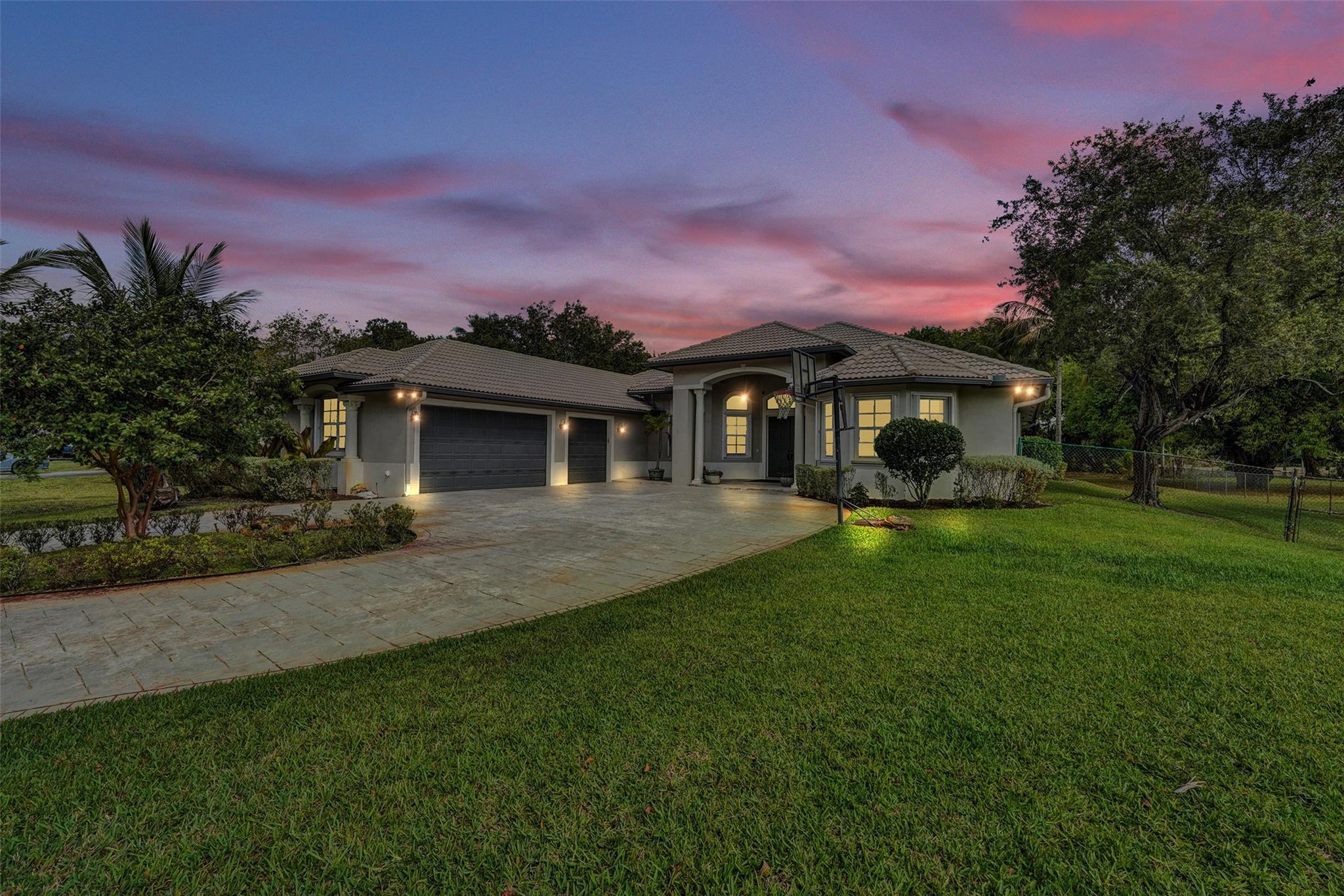 Tropical Paradise in this charming estate pool home with over $200K in upgrades! It's nestled in the sought after West Davie community of custom homes on almost one full acre lot. Step into a meticulously clean & bright "triple split" floor plan that boasts 5 true bedrooms, plus office area, & 3 full baths. Super spacious chef's kitchen featuring crisp white cabinetry with stylish backsplash & SS appliances. Luxury vinyl flooring thru out! Designers touch with soaring ceilings, recessed lighting, textured walls, decorative crown & window trim finishes. Your own tropical oasis awaits with a covered patio, pergola, & tranquil pool w/ waterfall with lush landscaping & mature trees. Conveniently fenced yard for boat/RV parking. Large circular driveway w/ 3 car garage. Top schools. No HOA