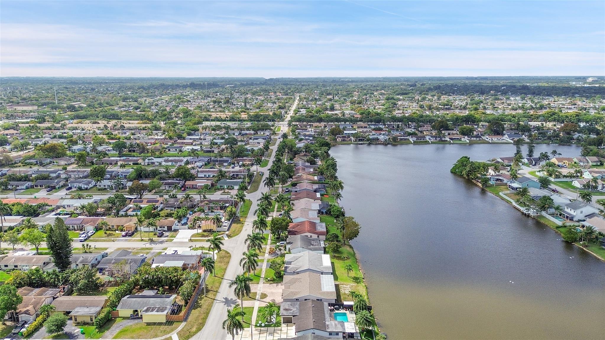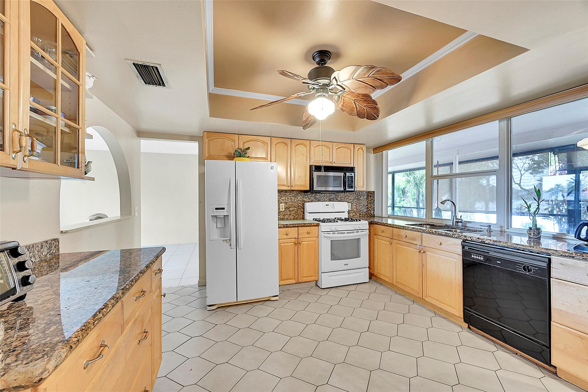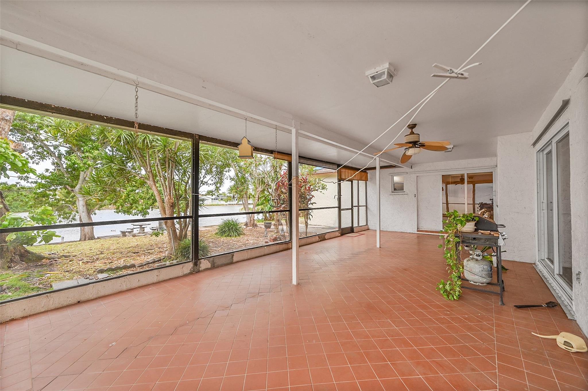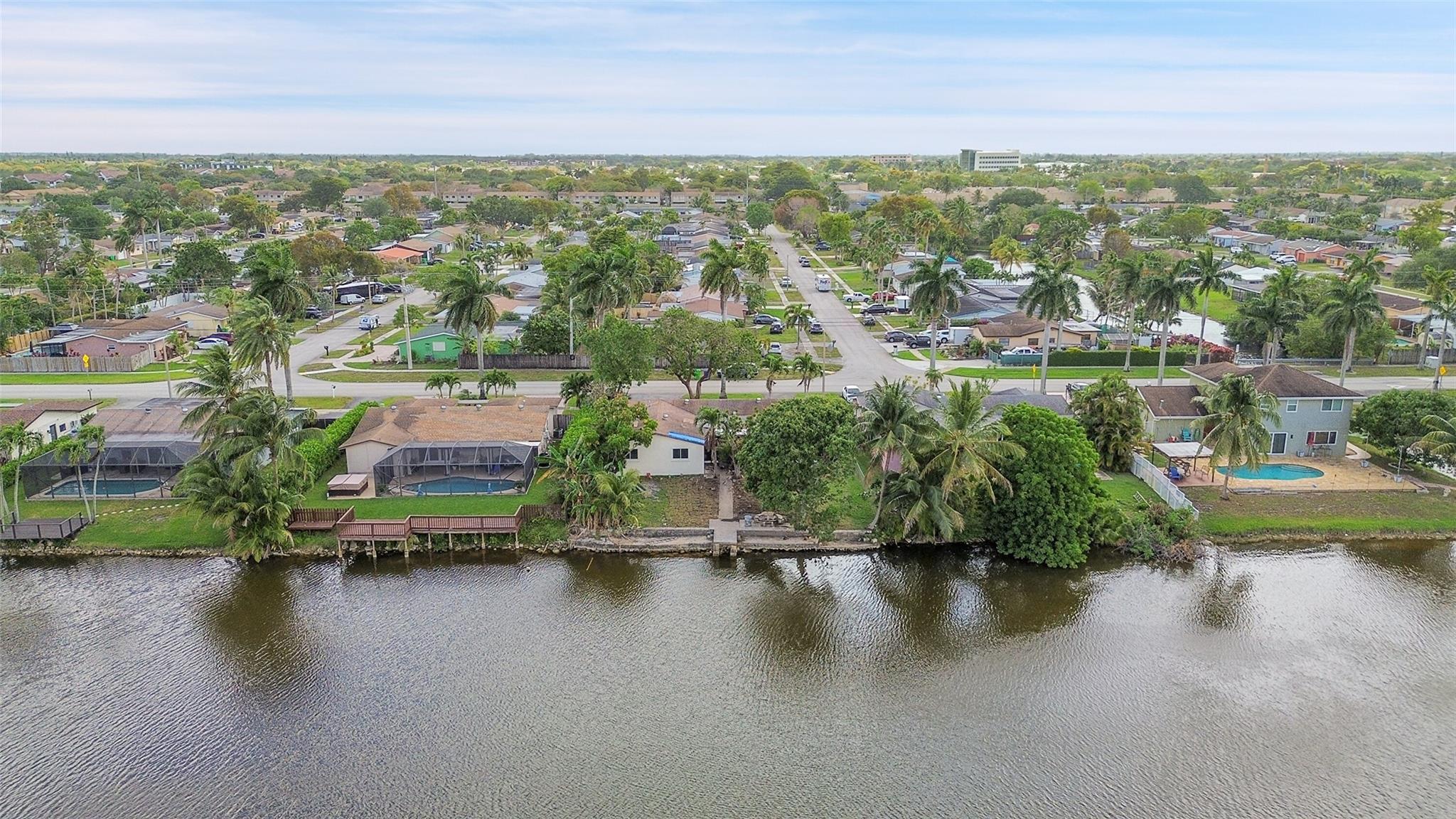 Gorgeous water view from this 3 Bedroom/ 2 Bathroom house with 2-car garage on the wide canal in Sunrise Golf Village. No HOA! Kitchen has Granite countertops, wood cabinetry, and a gas range. Neutral tile flooring throughout with carpet in the master bedroom. Gas water heater. Central AC 2021. New sprinkler pump which is fed off the canal. Split bedroom plan. Combination of hurricane panels and a few Impact windows. Huge screened in back patio with insulated roof and gutters. Circle driveway. Big back yard with plenty of room for a pool.