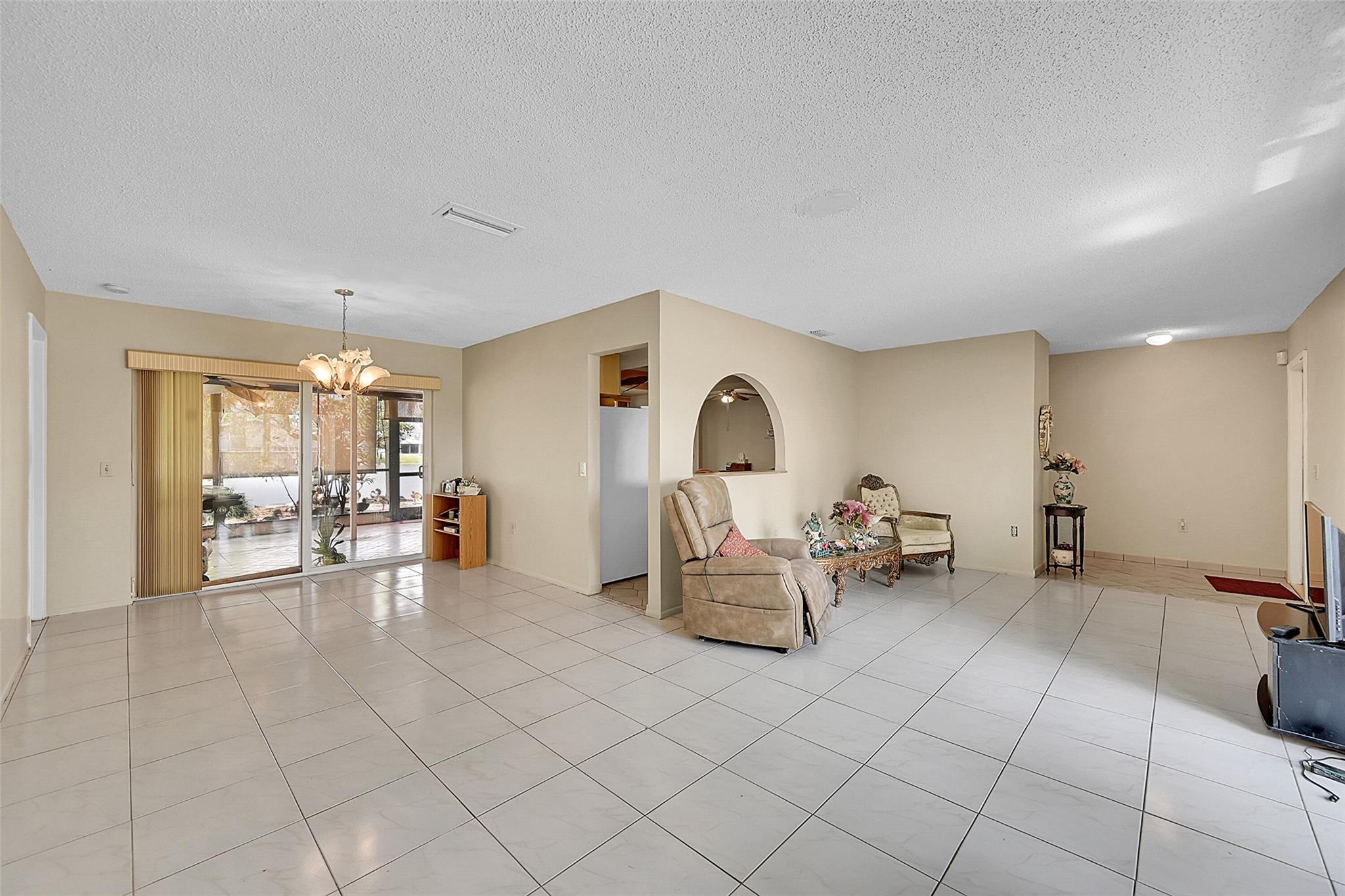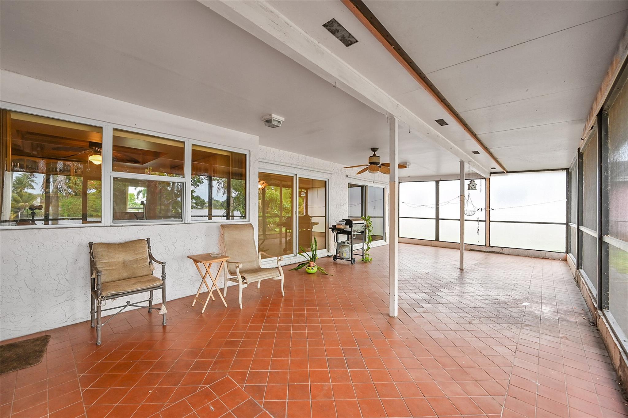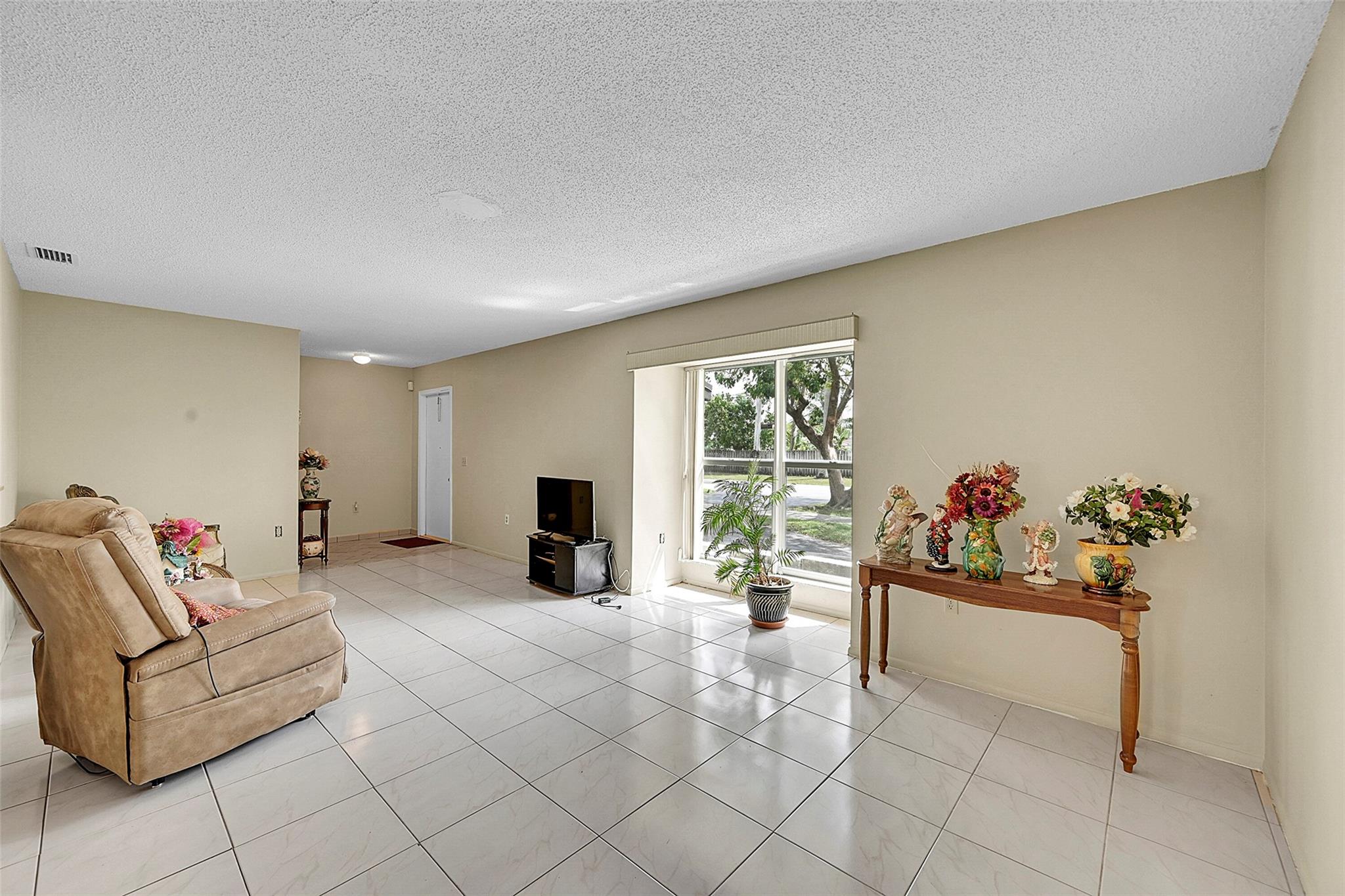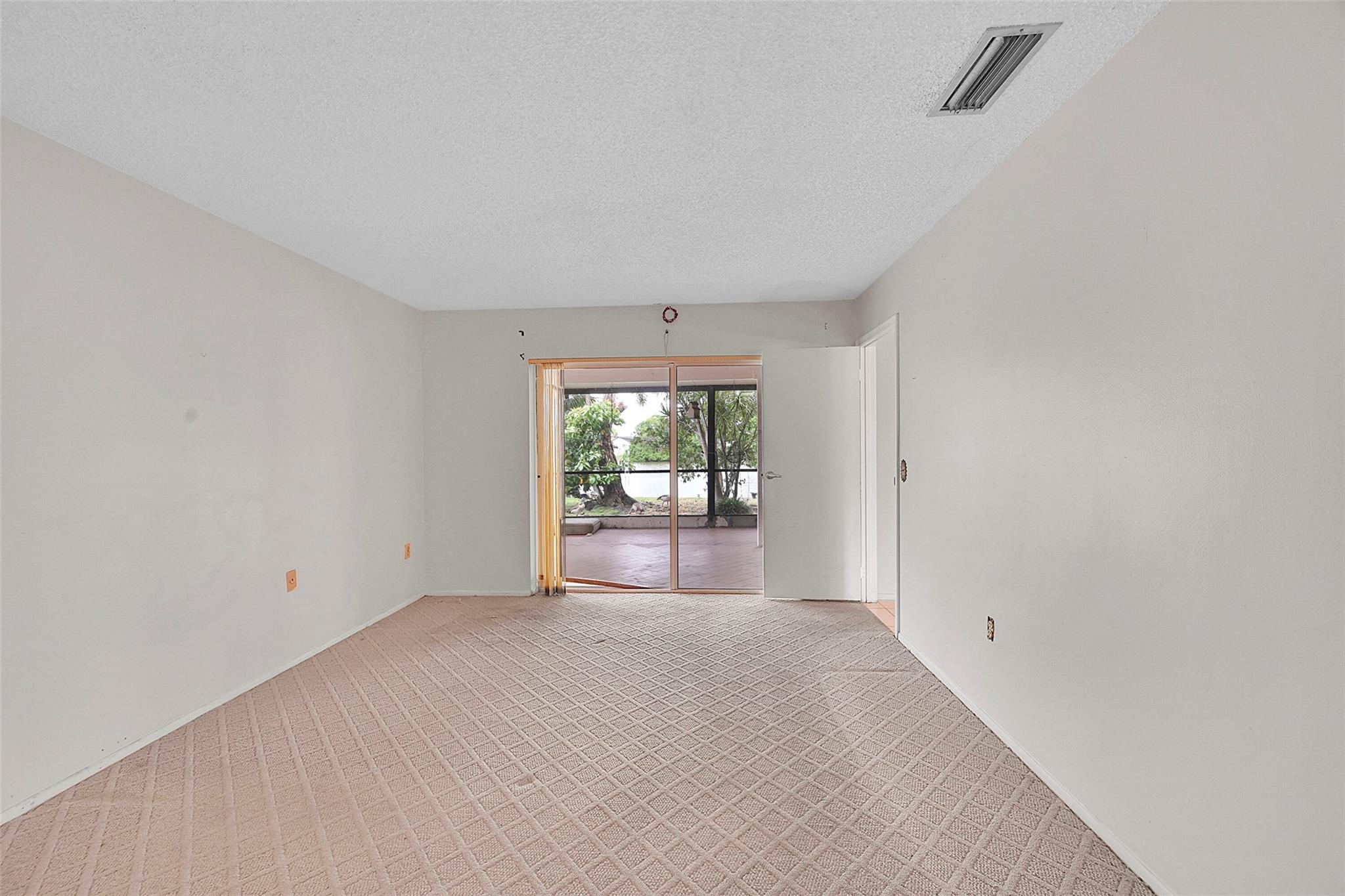 Gorgeous water view from this 3 Bedroom/ 2 Bathroom house with 2-car garage on the wide canal in Sunrise Golf Village. No HOA! Kitchen has Granite countertops, wood cabinetry, and a gas range. Neutral tile flooring throughout with carpet in the master bedroom. Gas water heater. Central AC 2021. New sprinkler pump which is fed off the canal. Split bedroom plan. Combination of hurricane panels and a few Impact windows. Huge screened in back patio with insulated roof and gutters. Circle driveway. Big back yard with plenty of room for a pool.