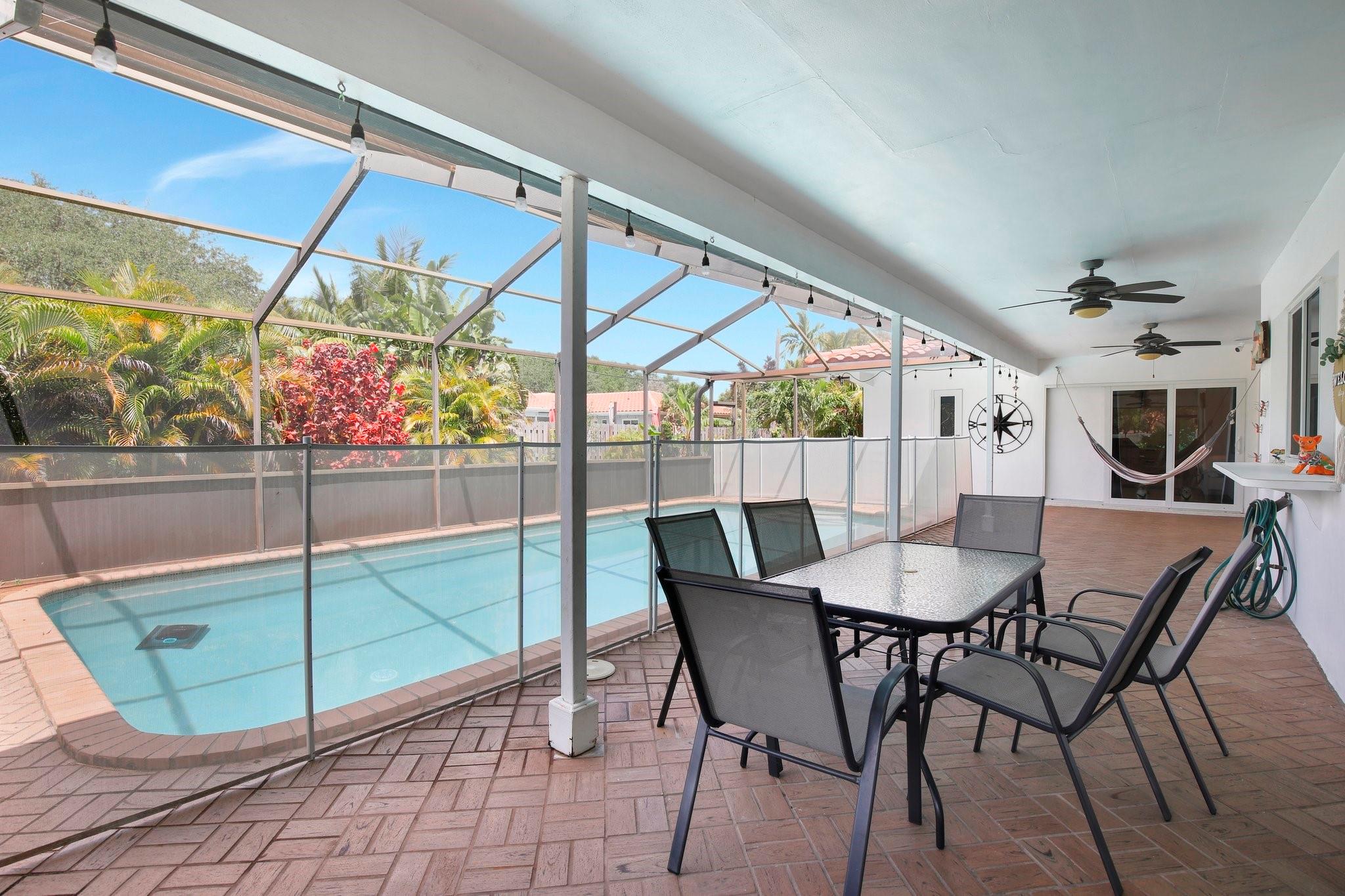 Mid century style pool home with fabulous upgrades such as gorgeous terrazzo floors, impact glass windows and doors, newer A/C and water heater, newly renovated bathrooms, freshly painted interior and exterior and much more! The open concept kitchen and living area is perfect for indoor outdoor entertaining on your tranquil screen enclosed pool deck. Spacious bedrooms with lots of closet storage throughout. This home sits on a huge fenced in corner lot with over 15,000 sq feet filled with fruit trees and peaceful views of the green park across the street. The side yard is ready for your RV, boat and toys, with concrete pad and hookups along with a 2 Car garage with new floor and a new storage rack. No HOA. Roof was replaced 11/20/2009.
