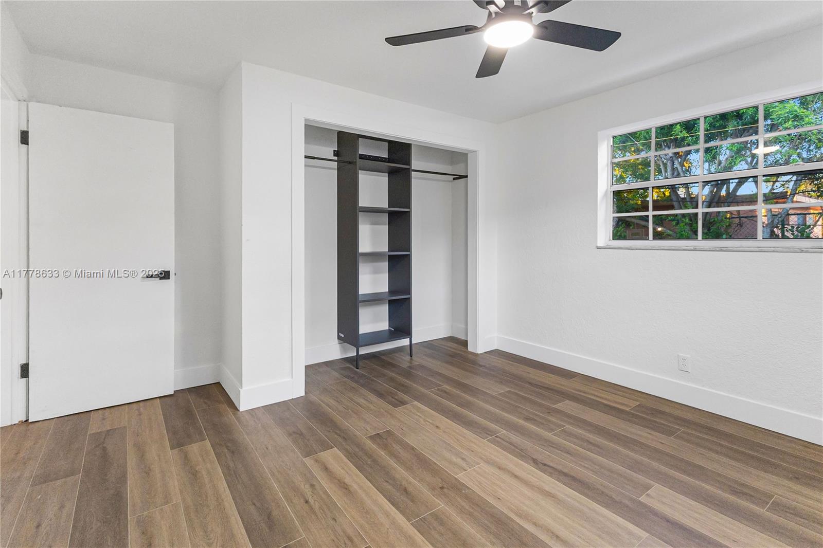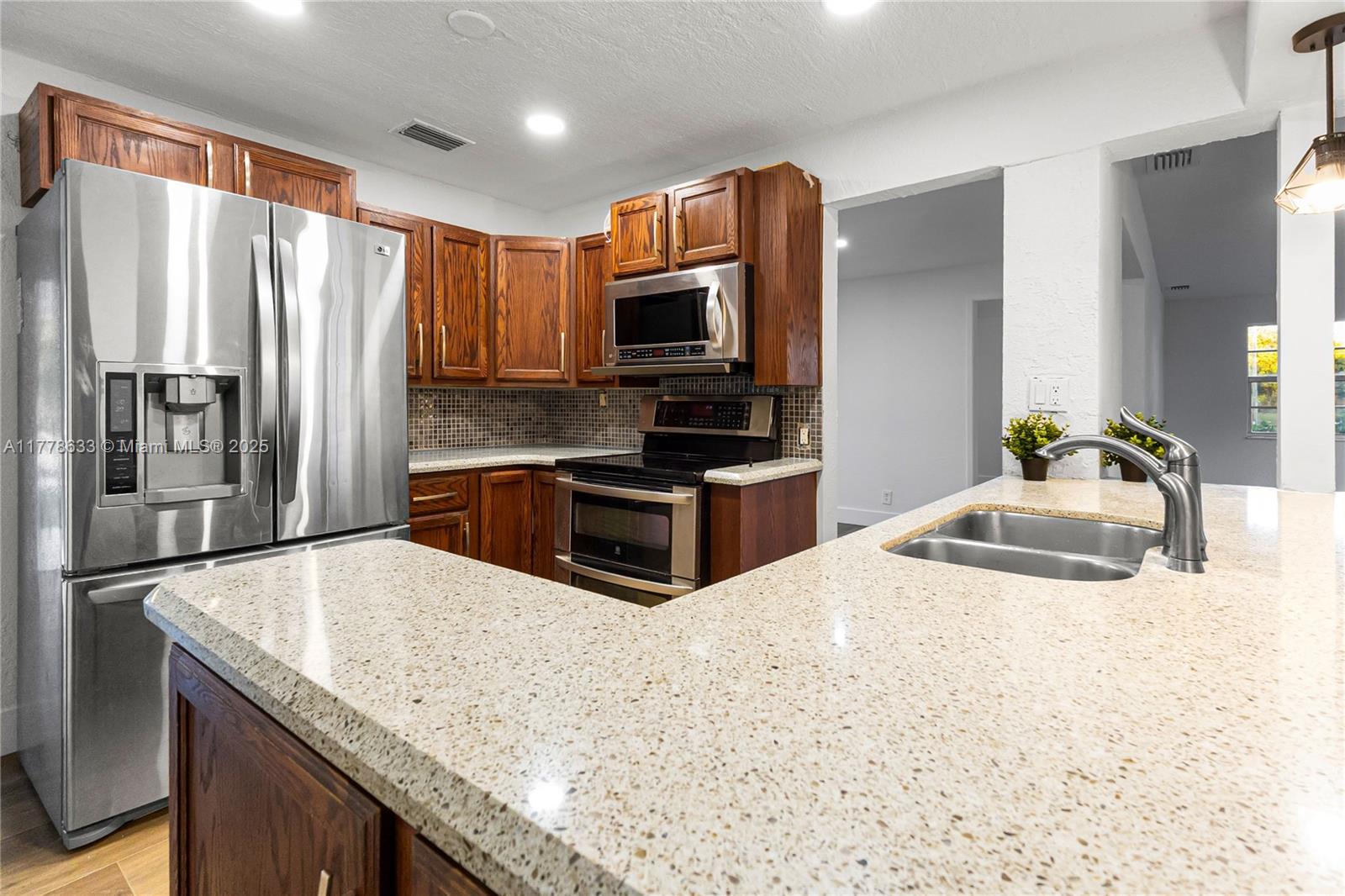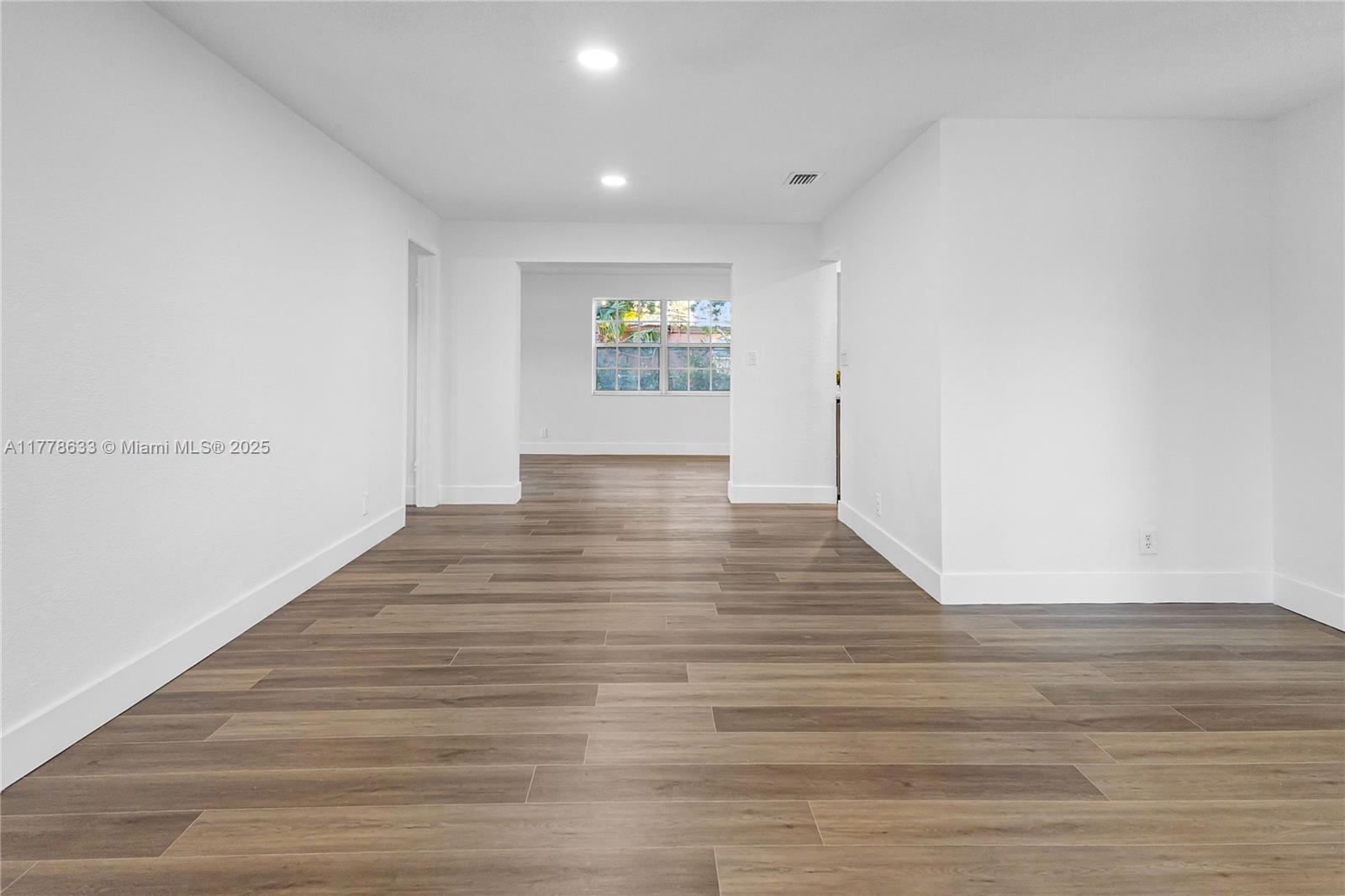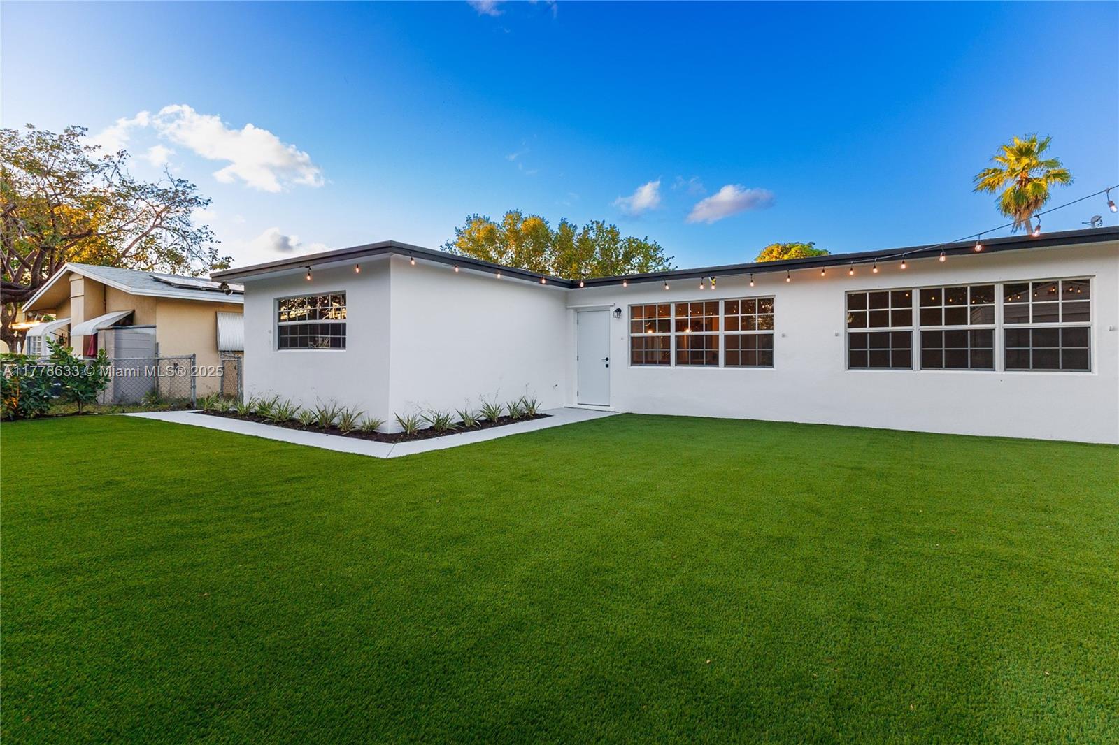 This beautifully renovated 3-bedroom, 2-bathroom home offers a stylish and functional layout with a split floor plan for added privacy. The interior is freshly painted and has been fully updated, featuring sleek vinyl flooring throughout. The kitchen features granite countertops with stainless steel appliances. Both bathrooms have been completely renovated, custom closet spaces with built-in shelving and glass doors provide ample storage while keeping things organized and visually appealing. Recessed lighting throughout the home creates a bright and welcoming atmosphere. The exterior of the home has also been freshly painted. The backyard is an entertainer's dream featuring turf throughout with Clusia plants planted along the perimeter, which will grow up to 10 feet tall.