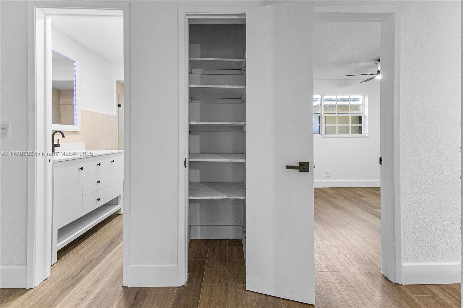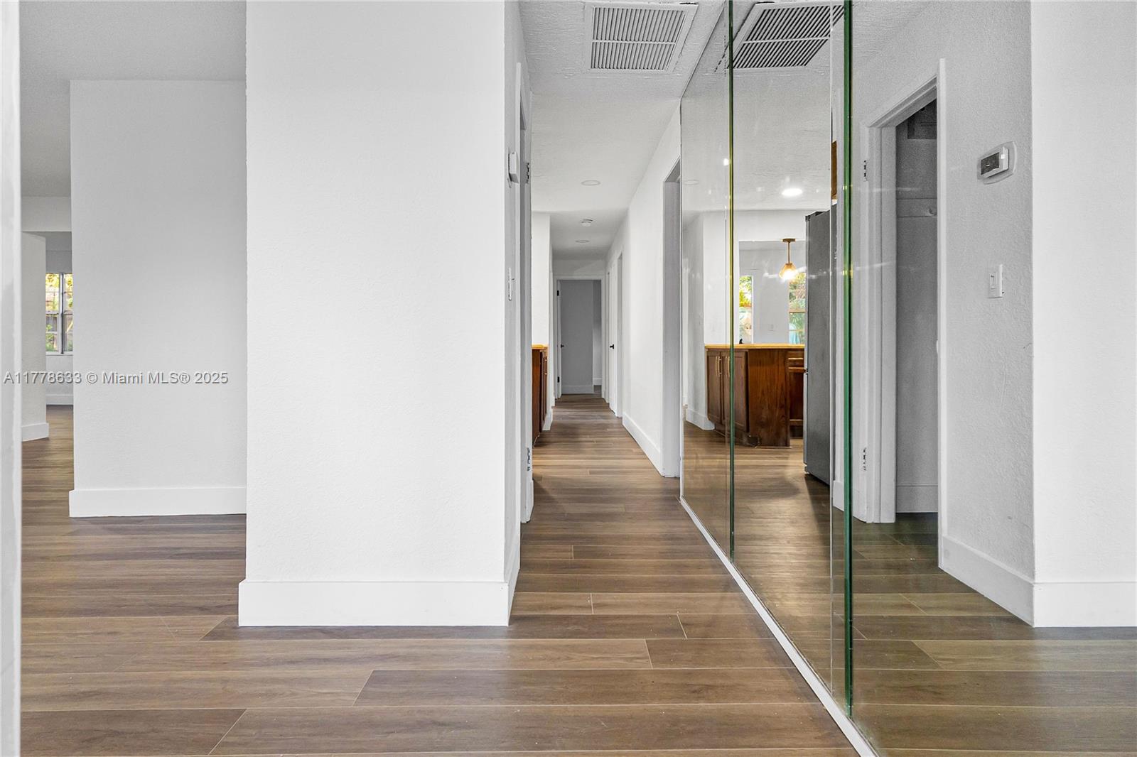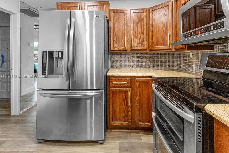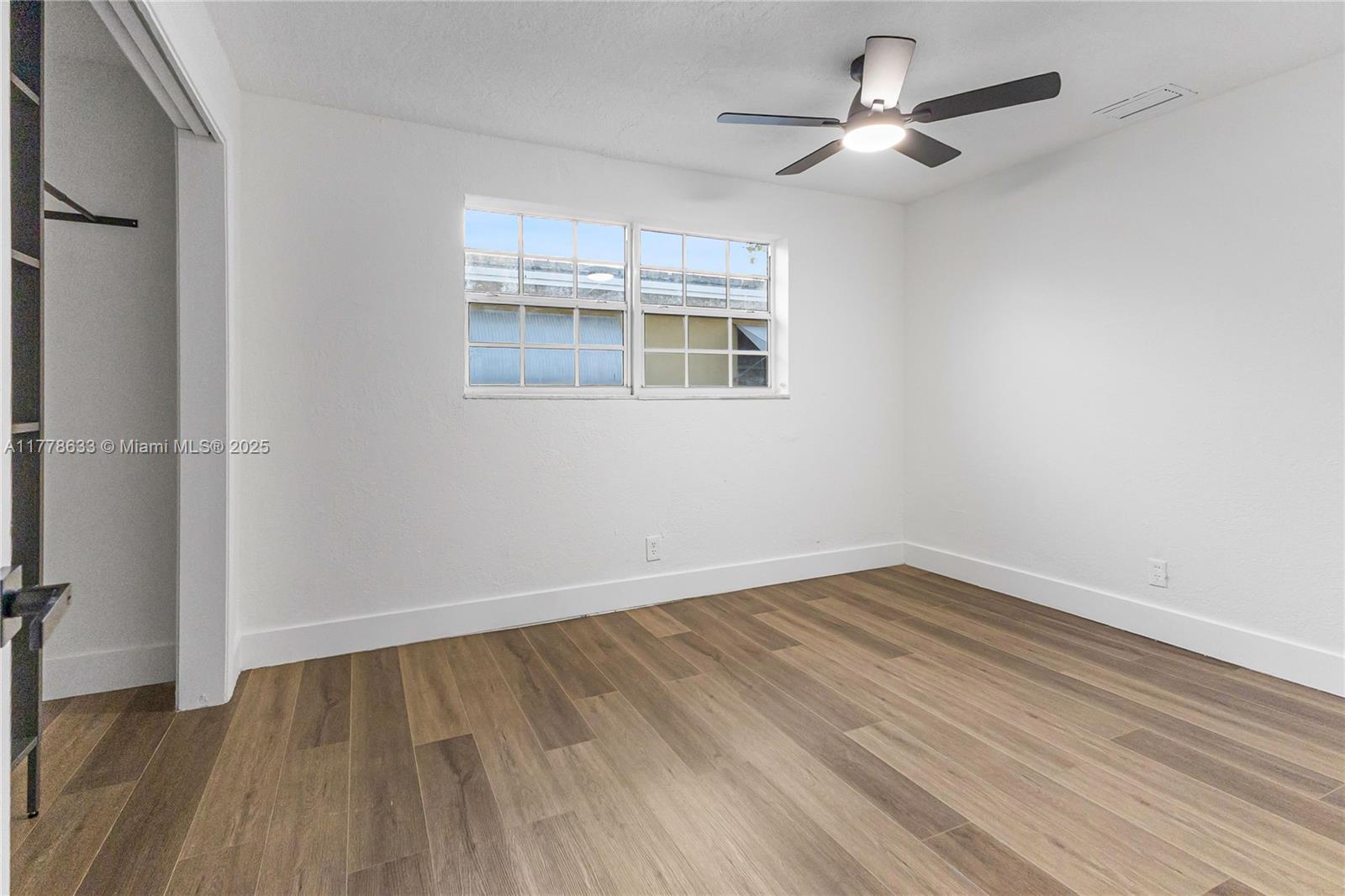 This beautifully renovated 3-bedroom, 2-bathroom home offers a stylish and functional layout with a split floor plan for added privacy. The interior is freshly painted and has been fully updated, featuring sleek vinyl flooring throughout. The kitchen features granite countertops with stainless steel appliances. Both bathrooms have been completely renovated, custom closet spaces with built-in shelving and glass doors provide ample storage while keeping things organized and visually appealing. Recessed lighting throughout the home creates a bright and welcoming atmosphere. The exterior of the home has also been freshly painted. The backyard is an entertainer's dream featuring turf throughout with Clusia plants planted along the perimeter, which will grow up to 10 feet tall.