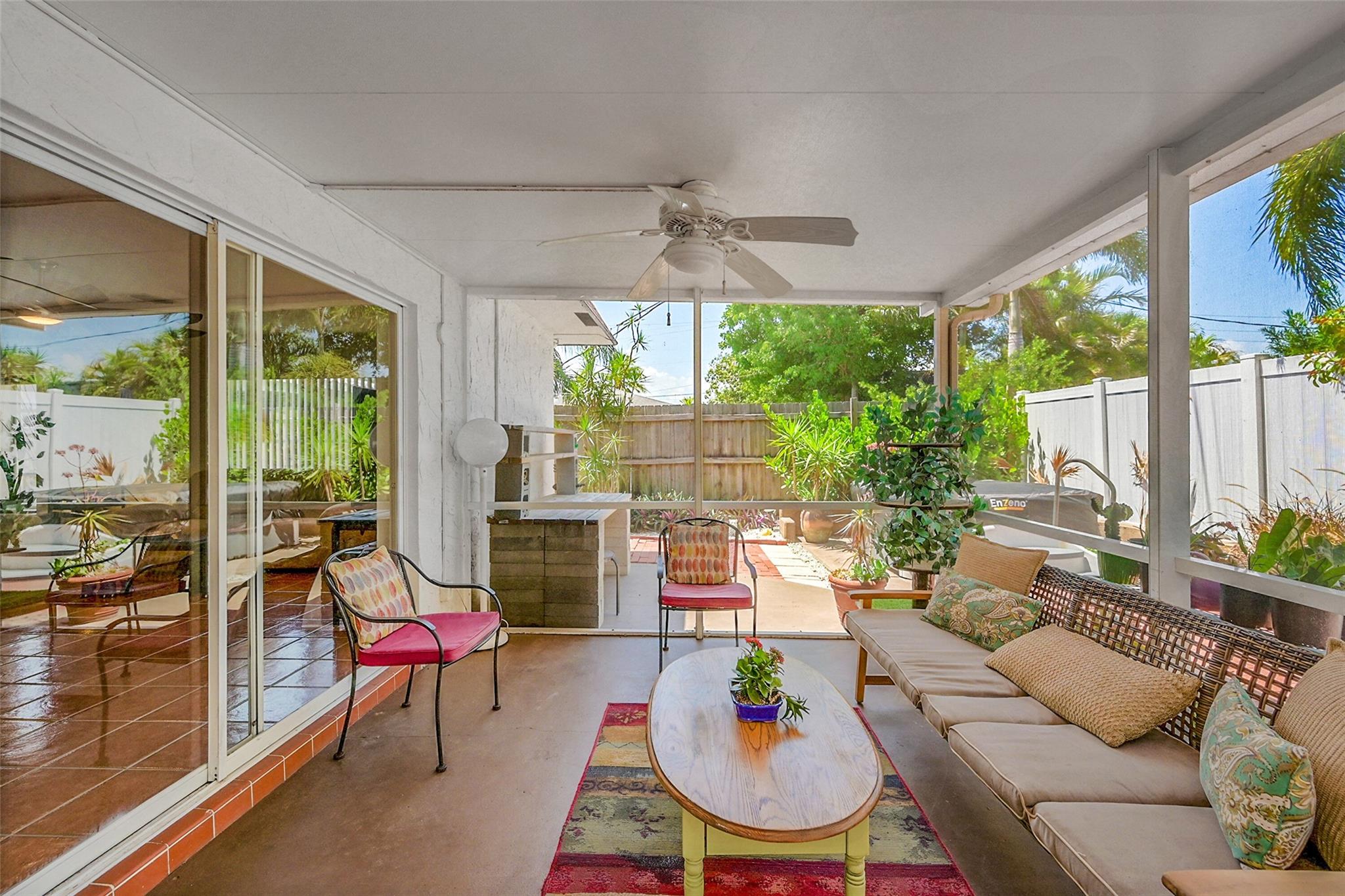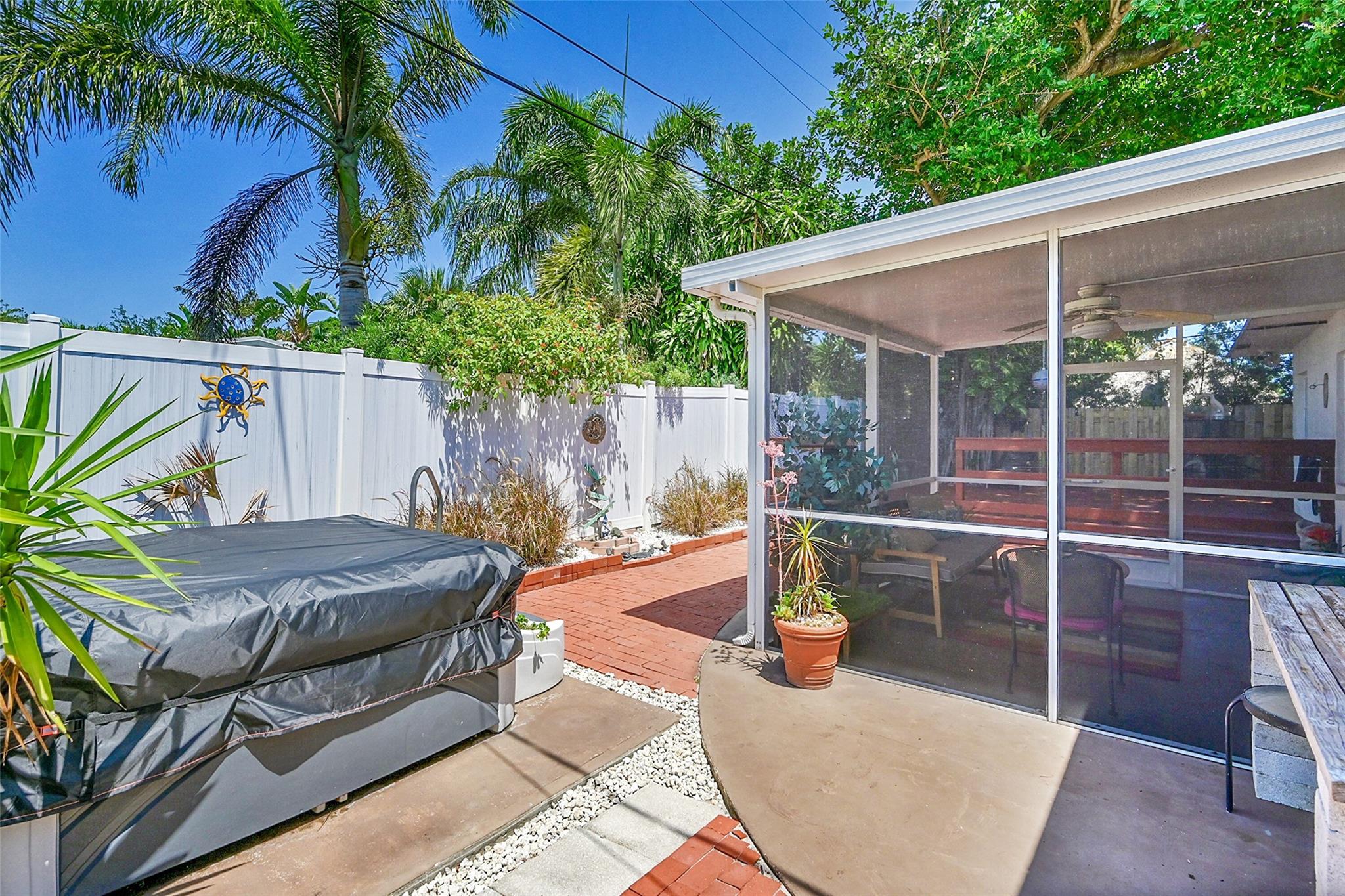 Spacious 2-bedroom, 2-bathroom home east of Federal Highway with nearly 2,000 sq ft under air. Renovated kitchen with granite counters, stainless steel appliances and white shaker cabinetry. Other features include a split floorplan, 2017 ac, updated electrical panel, both bathrooms completely updated, tile throughout, eat-in kitchen, and formal dining room. Easy to convert to a three bedroom home. Enjoy Florida living in the fully fenced tropical backyard with lush landscaping and a jacuzzi. Close to the beach, shopping, and dining.
