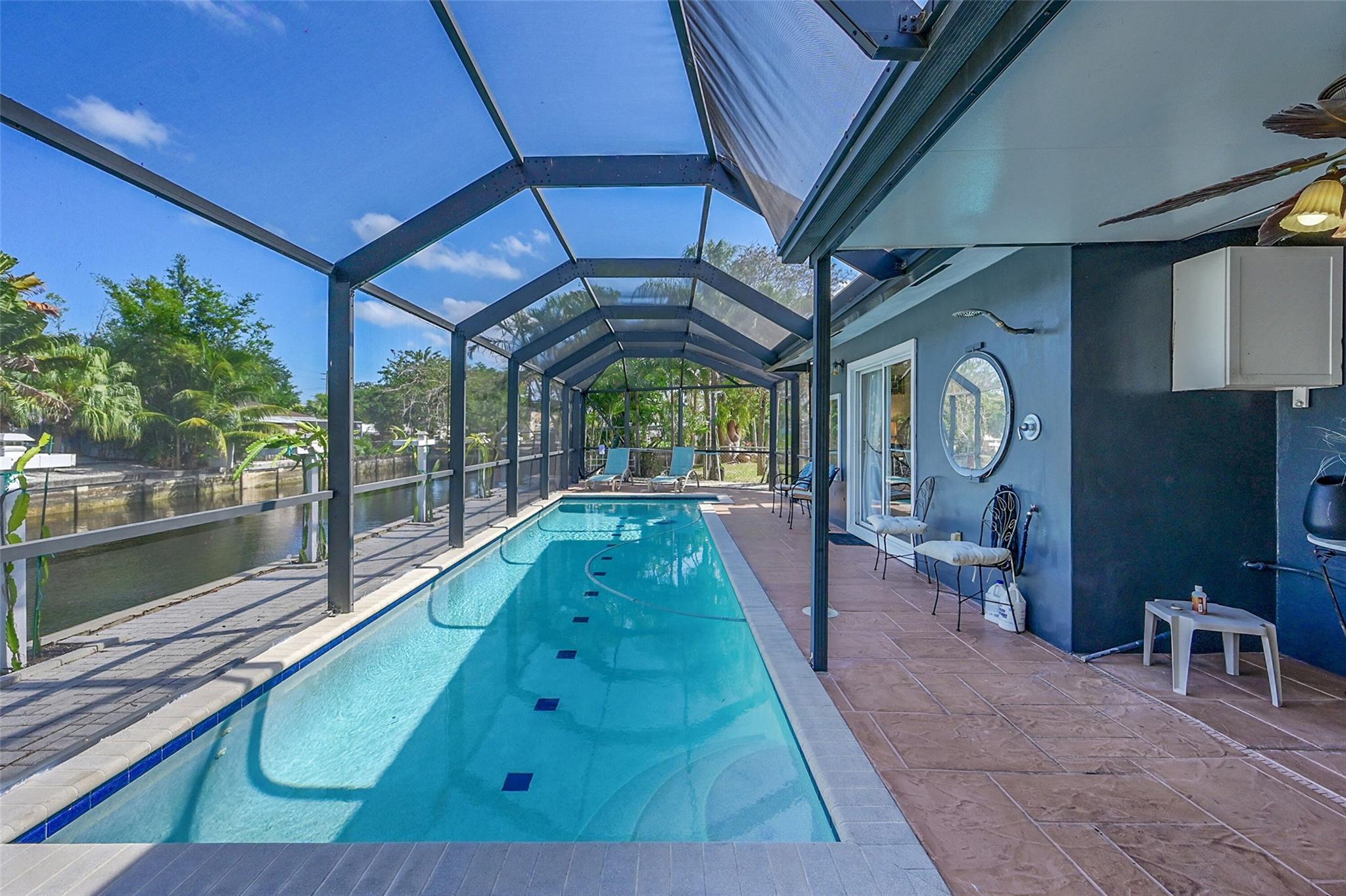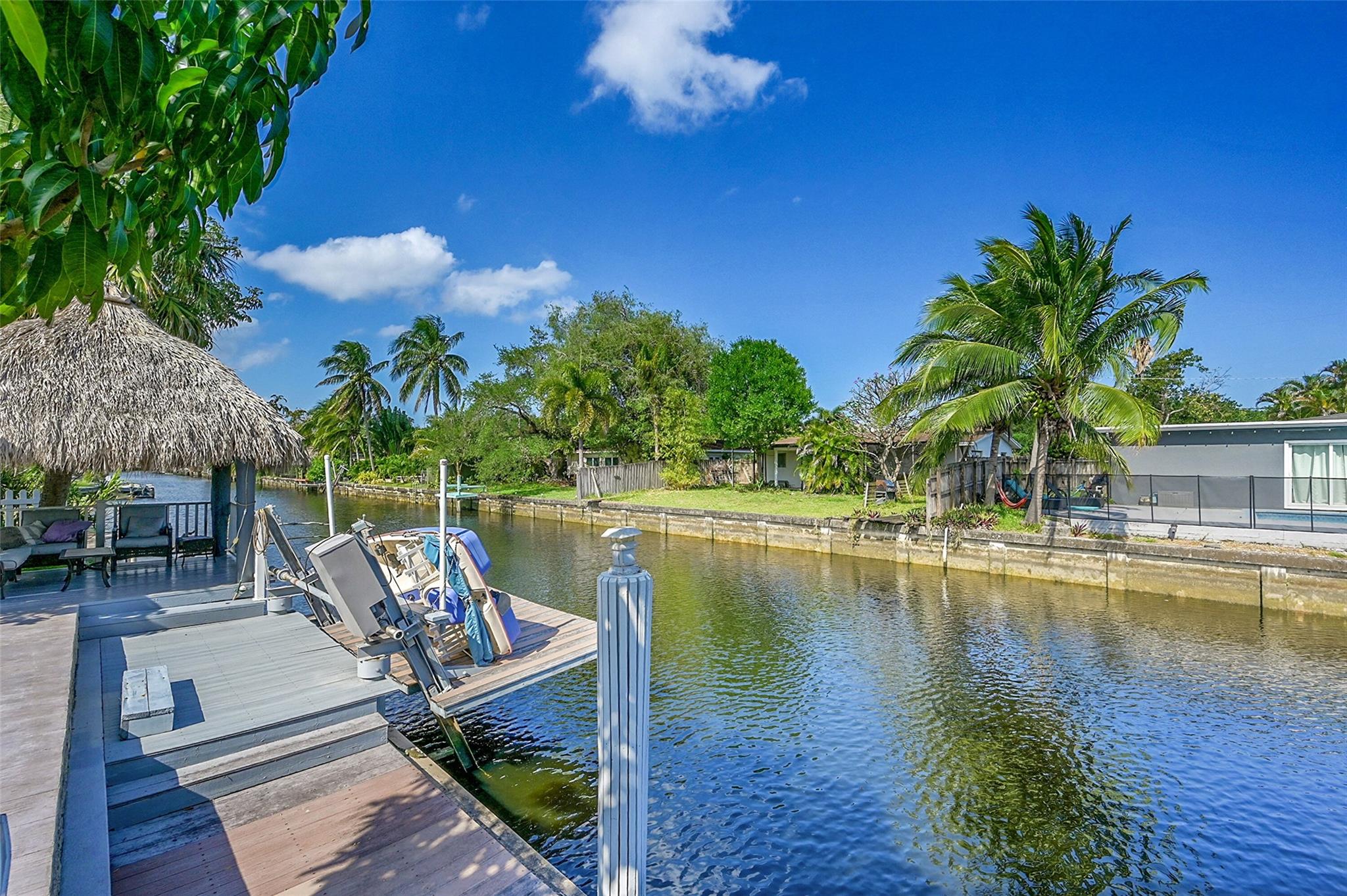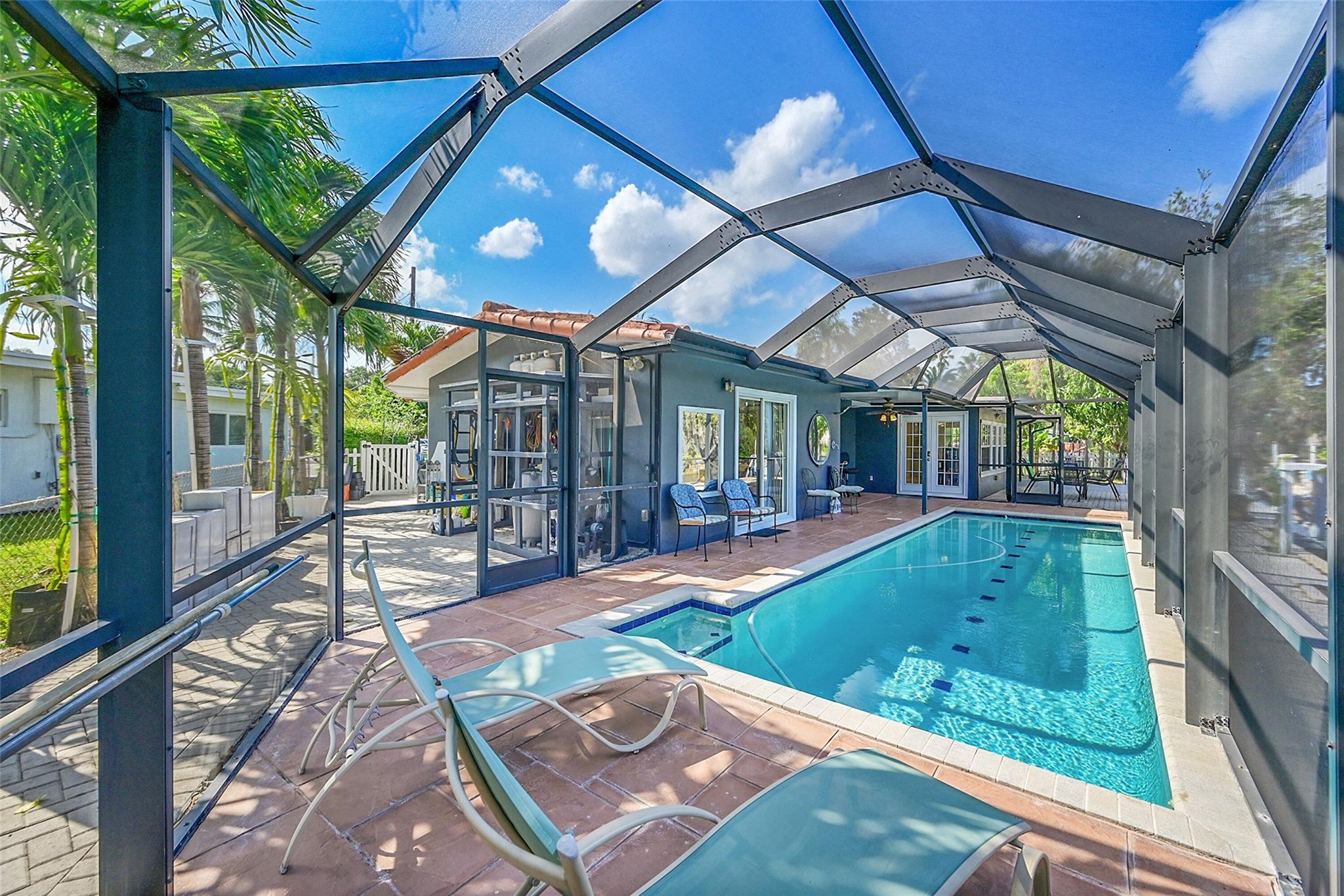 Beautifully updated waterfront home in the highly sought-after Royal Palms neighborhood! This tropical oasis offers over 100’ of ocean-access waterfront with a private dock, boat lift, and custom tiki hut—perfect for boaters and entertainers alike. The saltwater pool, built in 2013, includes a hurricane-rated enclosure for all-season enjoyment. The oversized primary suite, added in 2013, features three closets and a luxurious en-suite bath. The open-concept kitchen with a center island flows into the dining area with stunning views of the canal and pool. Enjoy gorgeous sunrises with ideal southern exposure. A spacious one-car garage & work room provides extra storage and convenience. Prime location close to beaches, shopping, and dining. True must-see!