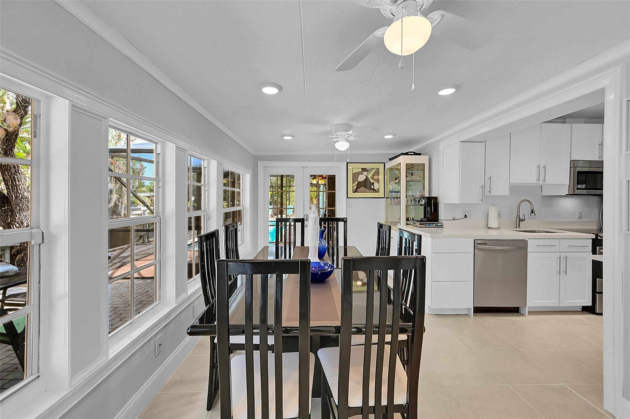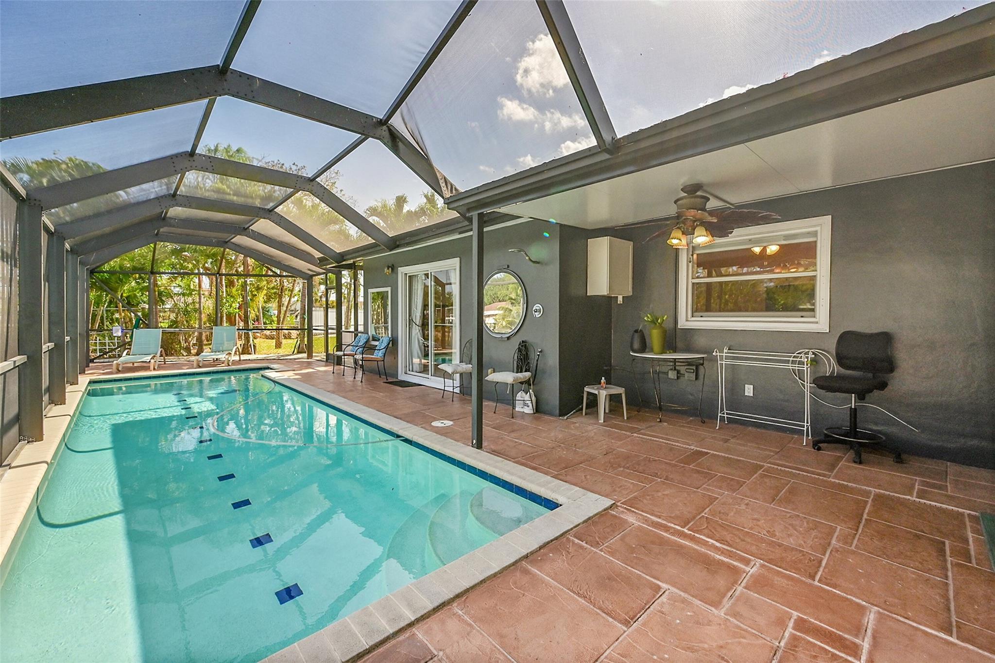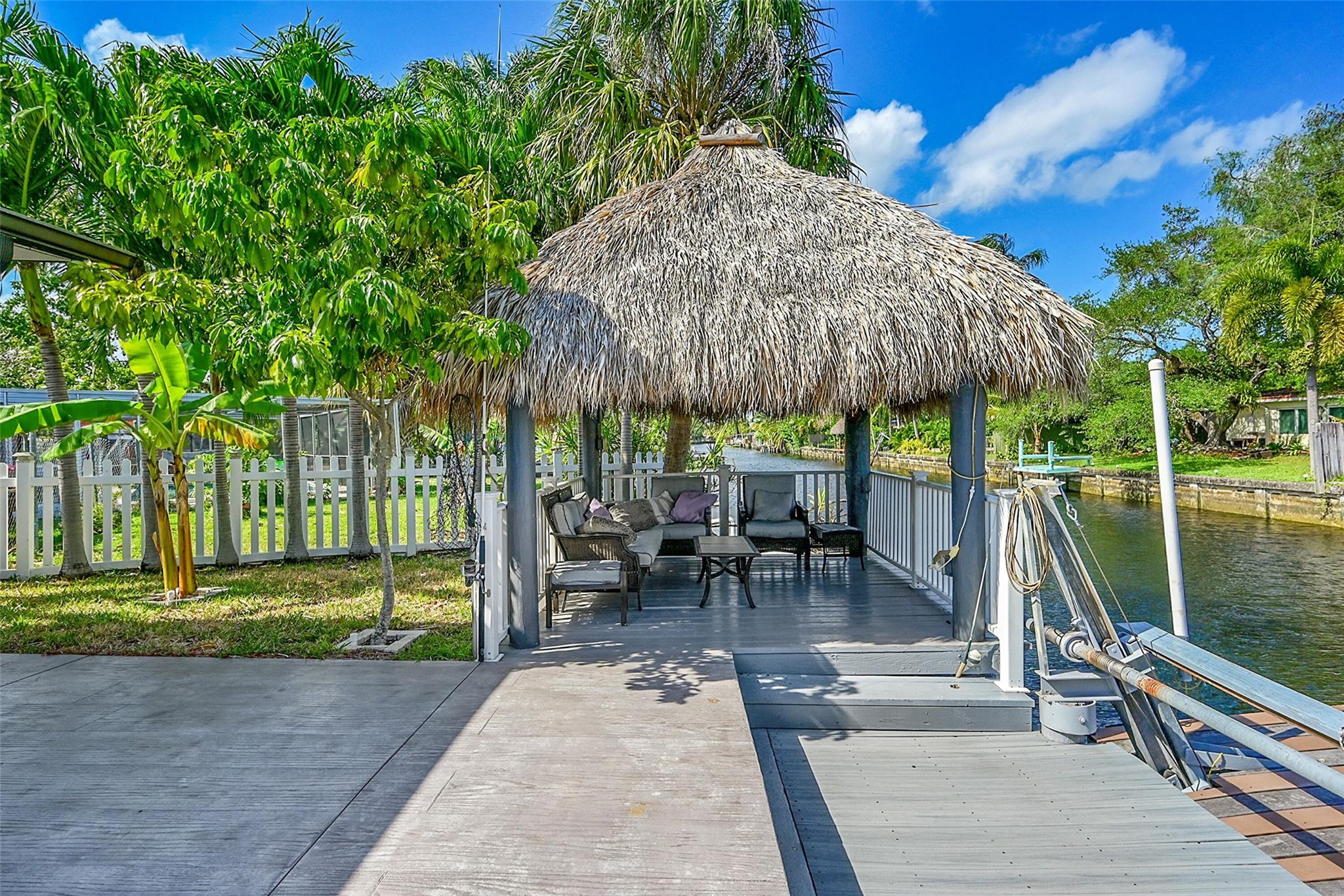 Beautifully updated waterfront home in the highly sought-after Royal Palms neighborhood! This tropical oasis offers over 100’ of ocean-access waterfront with a private dock, boat lift, and custom tiki hut—perfect for boaters and entertainers alike. The saltwater pool, built in 2013, includes a hurricane-rated enclosure for all-season enjoyment. The oversized primary suite, added in 2013, features three closets and a luxurious en-suite bath. The open-concept kitchen with a center island flows into the dining area with stunning views of the canal and pool. Enjoy gorgeous sunrises with ideal southern exposure. A spacious one-car garage & work room provides extra storage and convenience. Prime location close to beaches, shopping, and dining. True must-see!