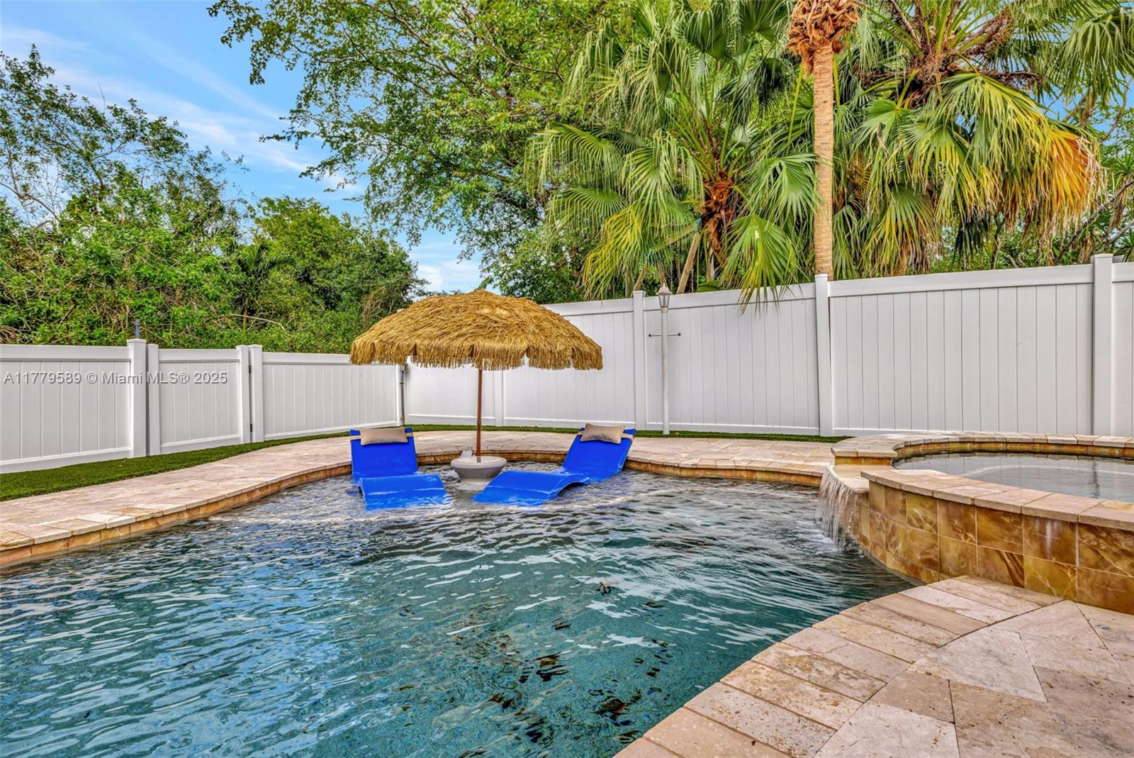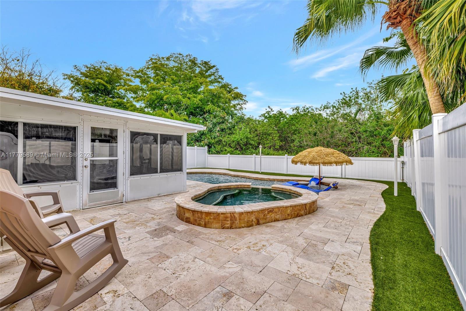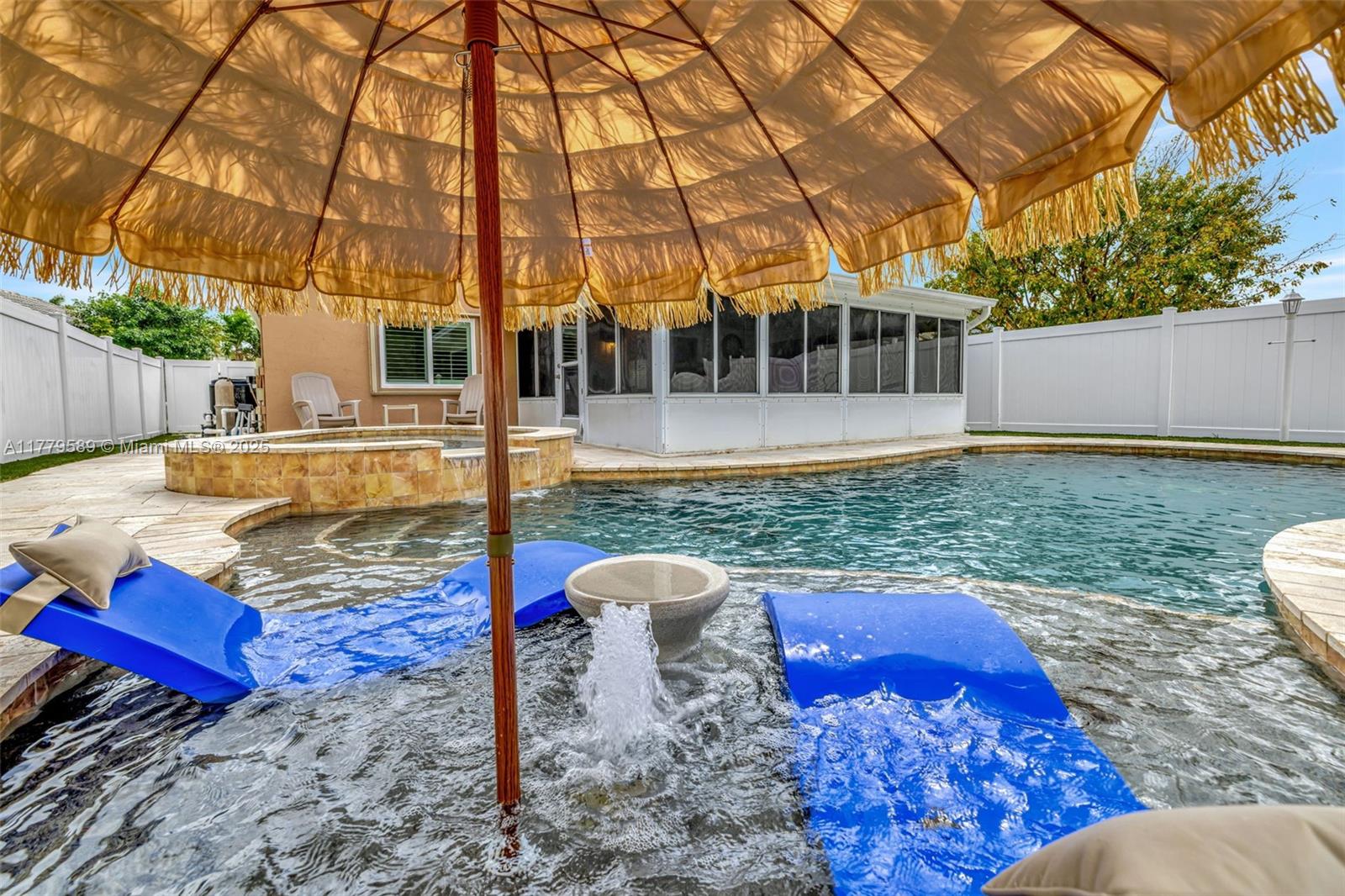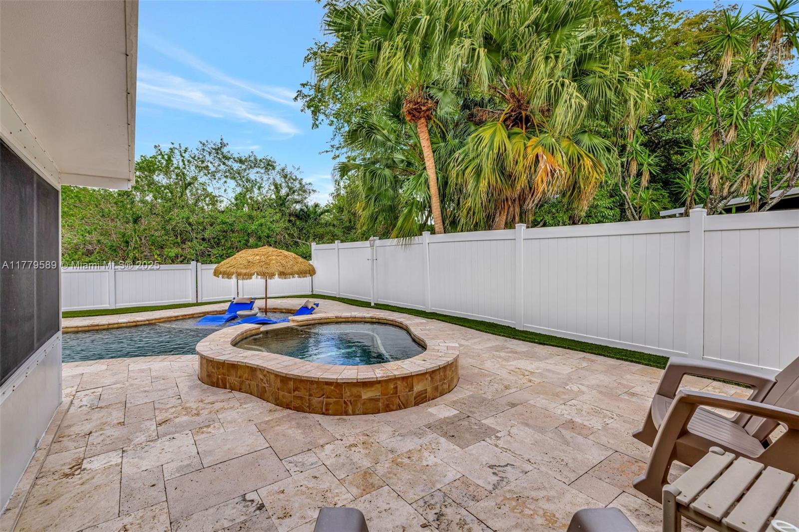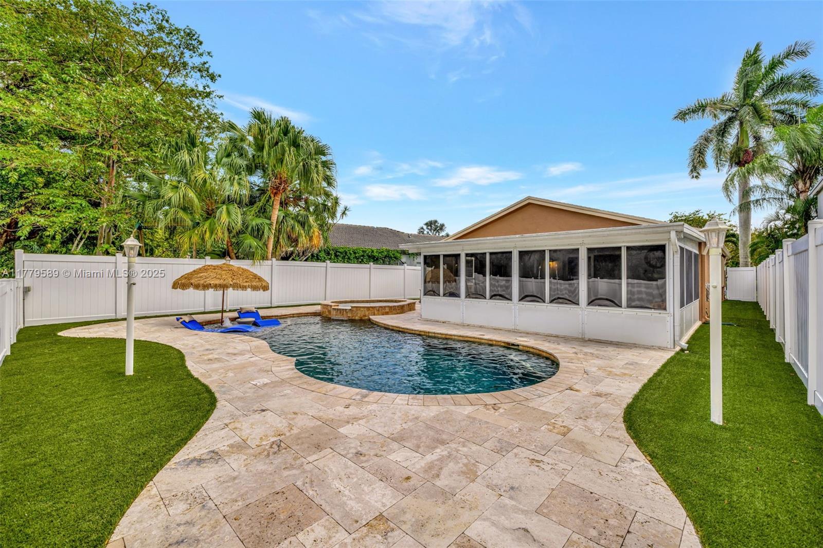 Discover this impeccably maintained 4BR/2BA home featuring a luxurious saltwater heated pool/hot tub. Situated on a premium lot w/no rear neighbors, offering privacy & modern comforts. The 2022 kitchen boasts 42” cabinets, SS appliances, quartz countertops, wood-look tile floors & a marble backsplash. Remodeled baths: Master (2021), 2nd (2020), fresh paint (2023), impact windows/doors (2022), & roof (2018) – both with warranties! Interior highlights include custom built-ins in the master, plantation shutters, & engineered wood floors in main living areas. The backyard Oasis features artificial turf, travertine pavers, screened Florida room w/acrylic windows, tile floors, & a PVC privacy fence. Modern upgrades with thoughtful details for convenience.