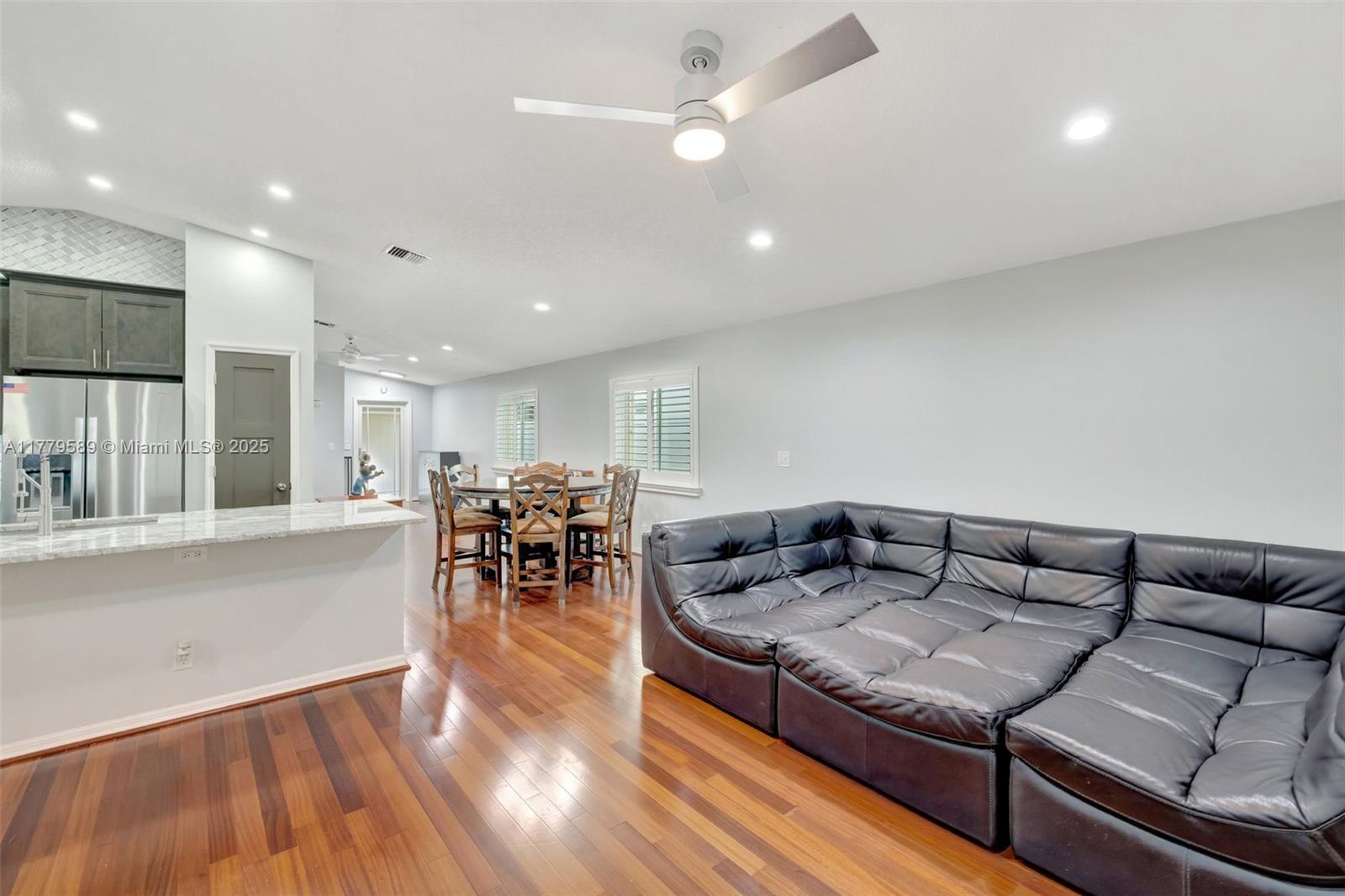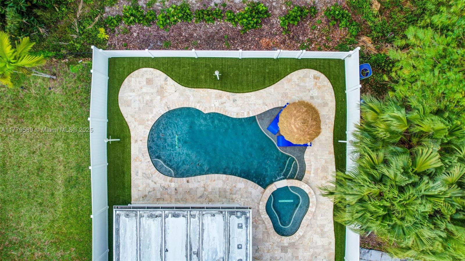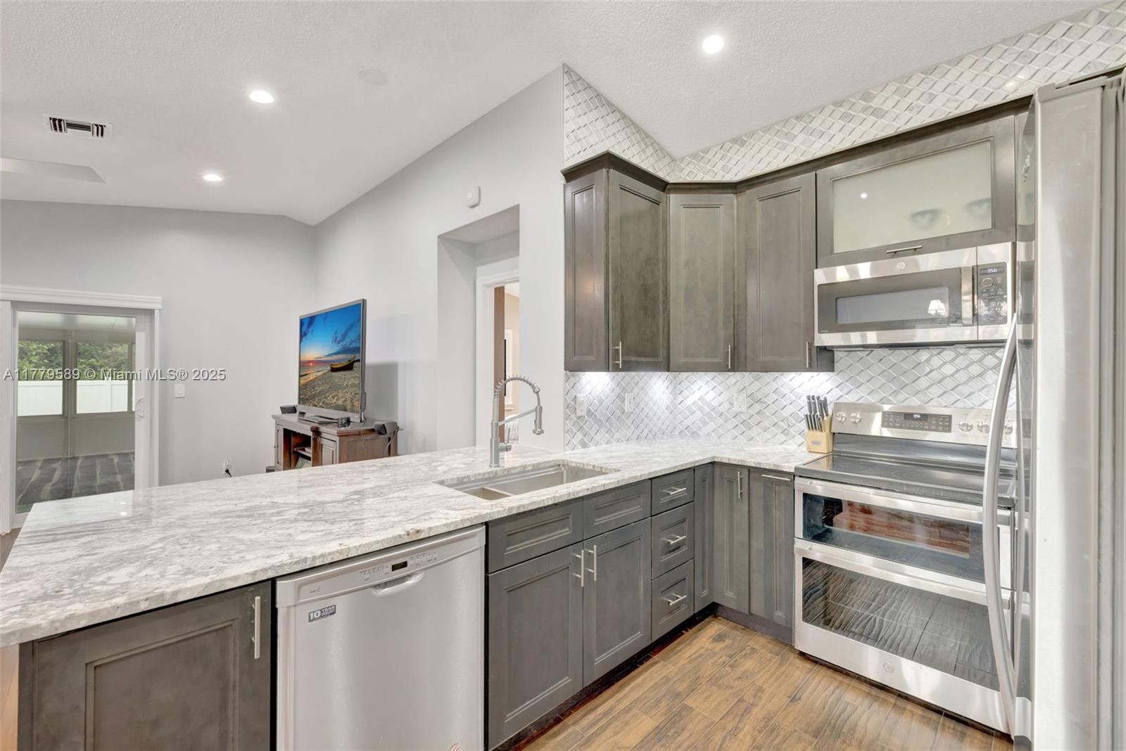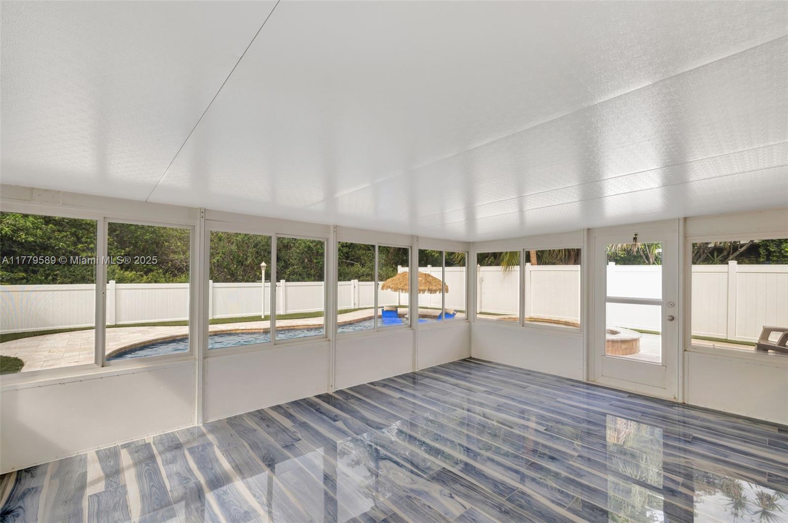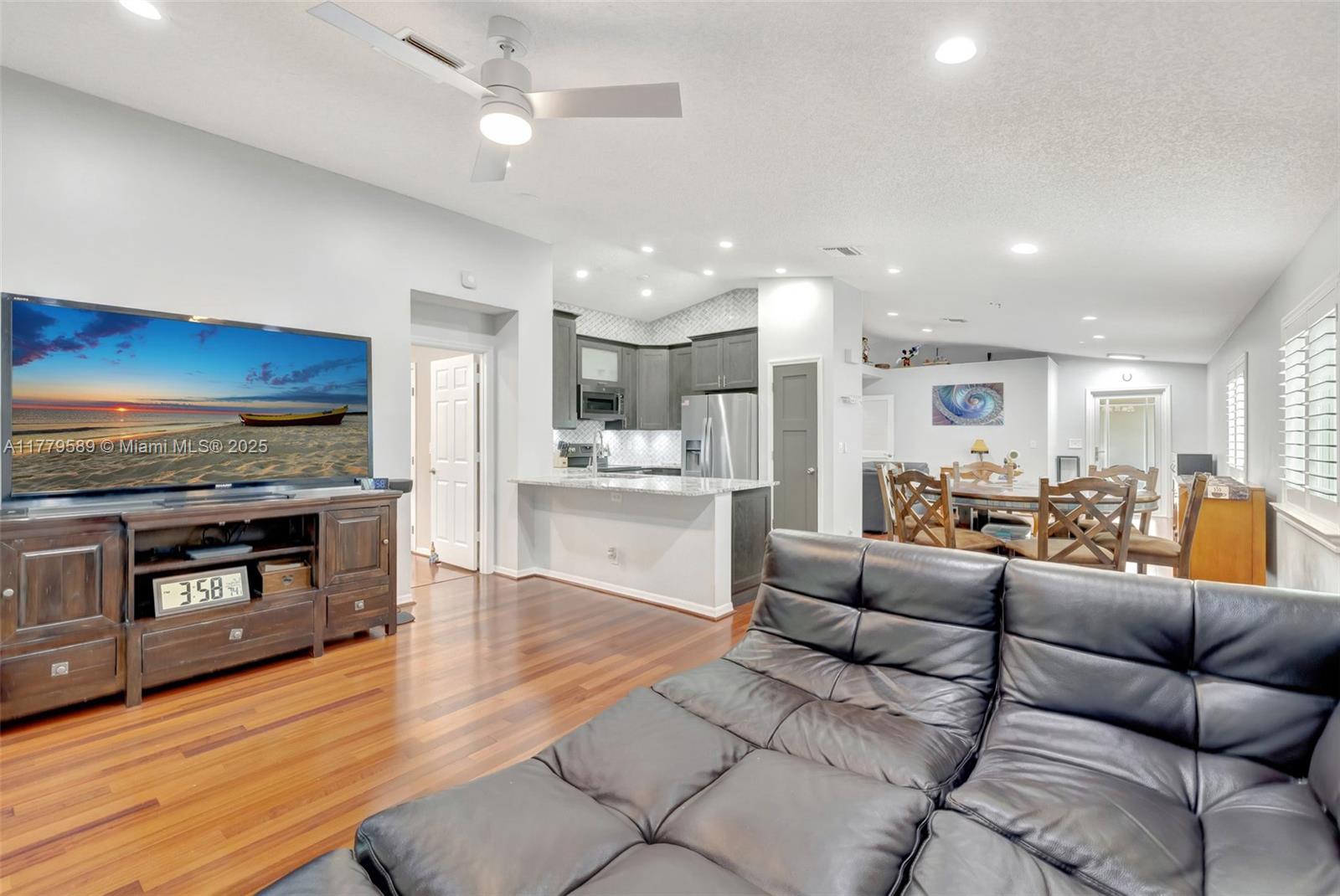 Discover this impeccably maintained 4BR/2BA home featuring a luxurious saltwater heated pool/hot tub. Situated on a premium lot w/no rear neighbors, offering privacy & modern comforts. The 2022 kitchen boasts 42” cabinets, SS appliances, quartz countertops, wood-look tile floors & a marble backsplash. Remodeled baths: Master (2021), 2nd (2020), fresh paint (2023), impact windows/doors (2022), & roof (2018) – both with warranties! Interior highlights include custom built-ins in the master, plantation shutters, & engineered wood floors in main living areas. The backyard Oasis features artificial turf, travertine pavers, screened Florida room w/acrylic windows, tile floors, & a PVC privacy fence. Modern upgrades with thoughtful details for convenience.