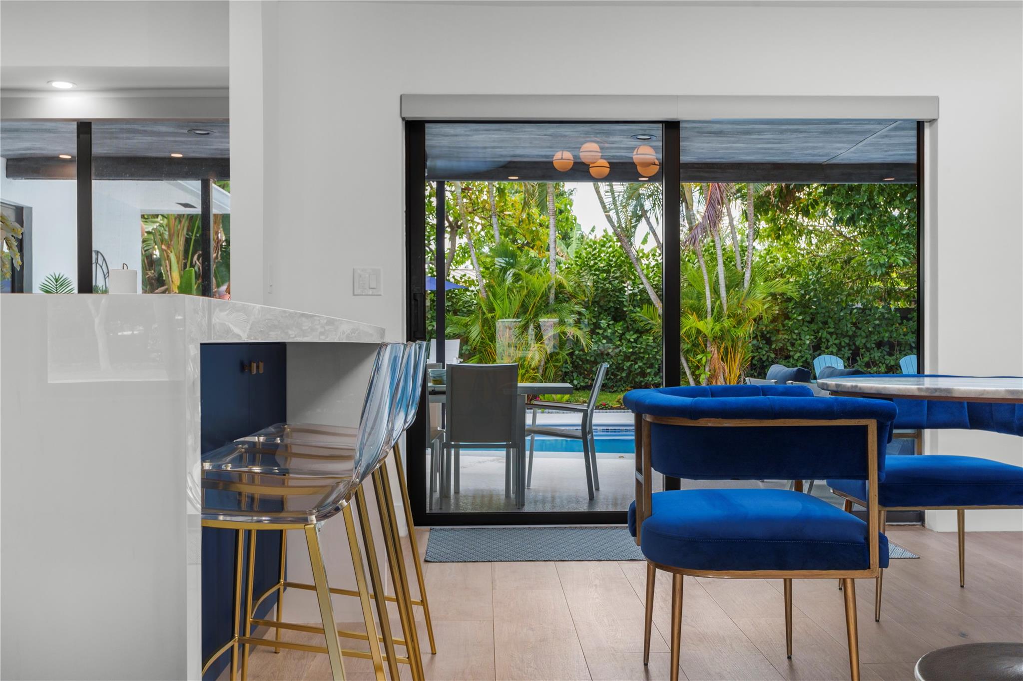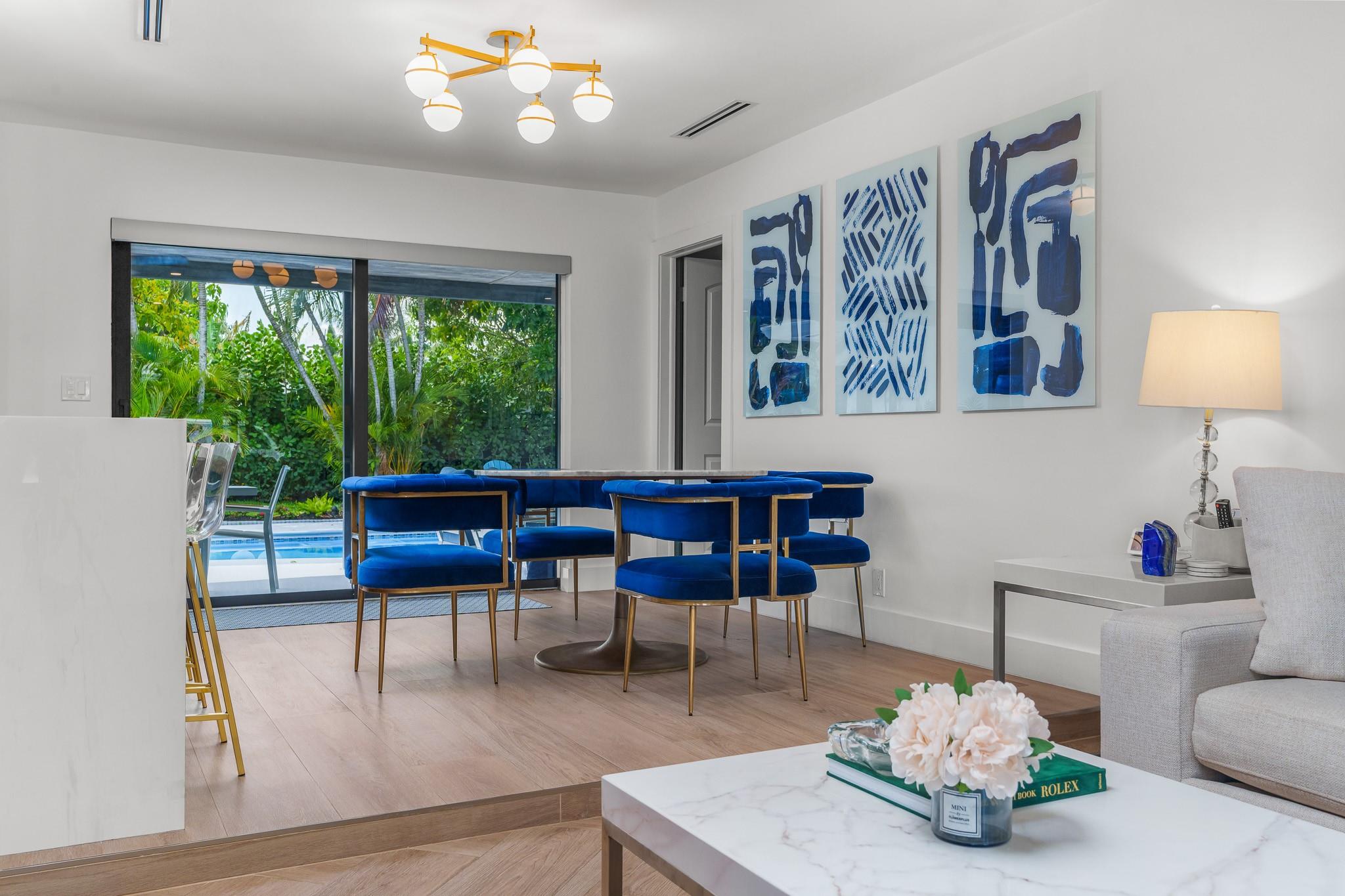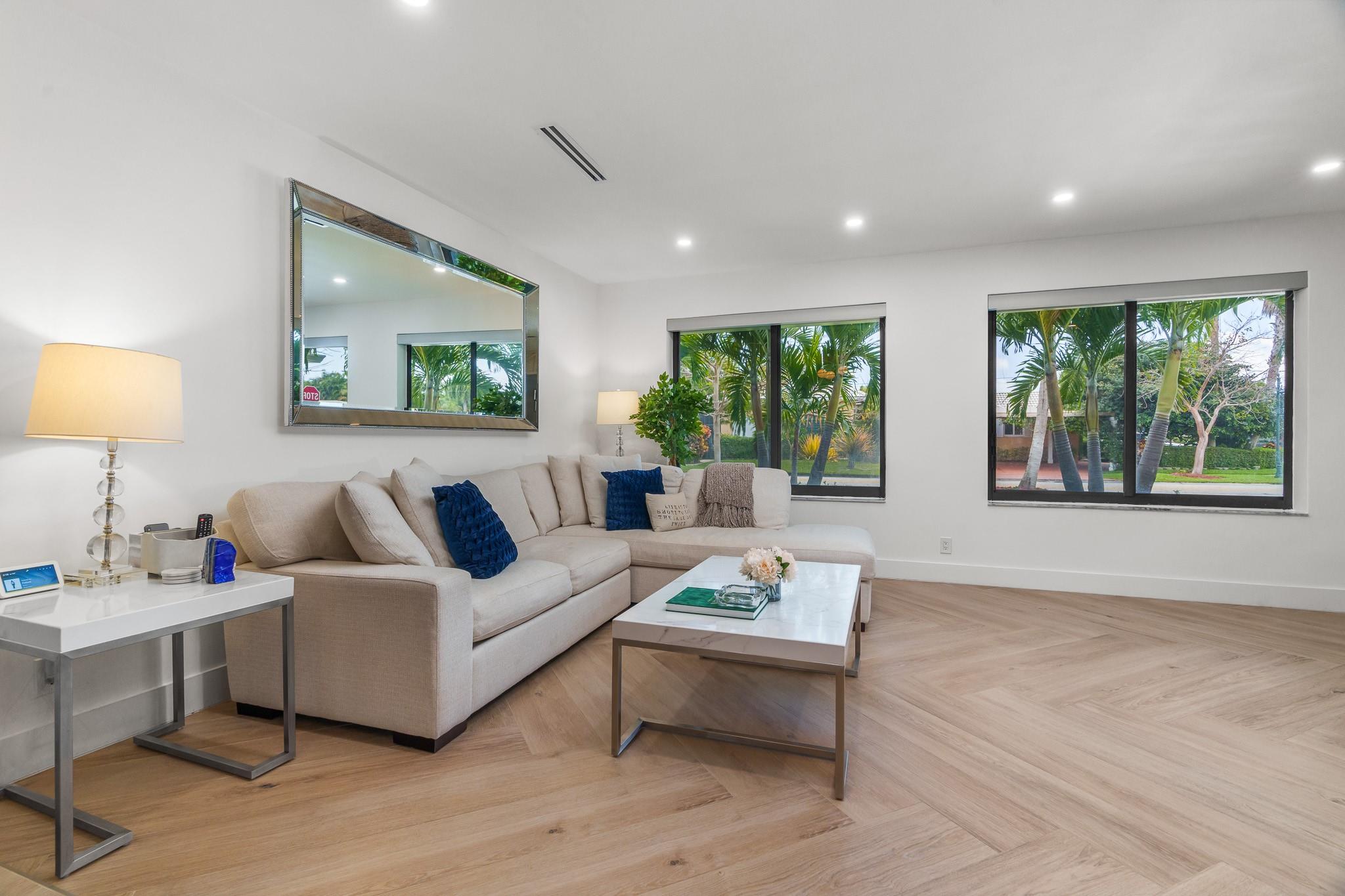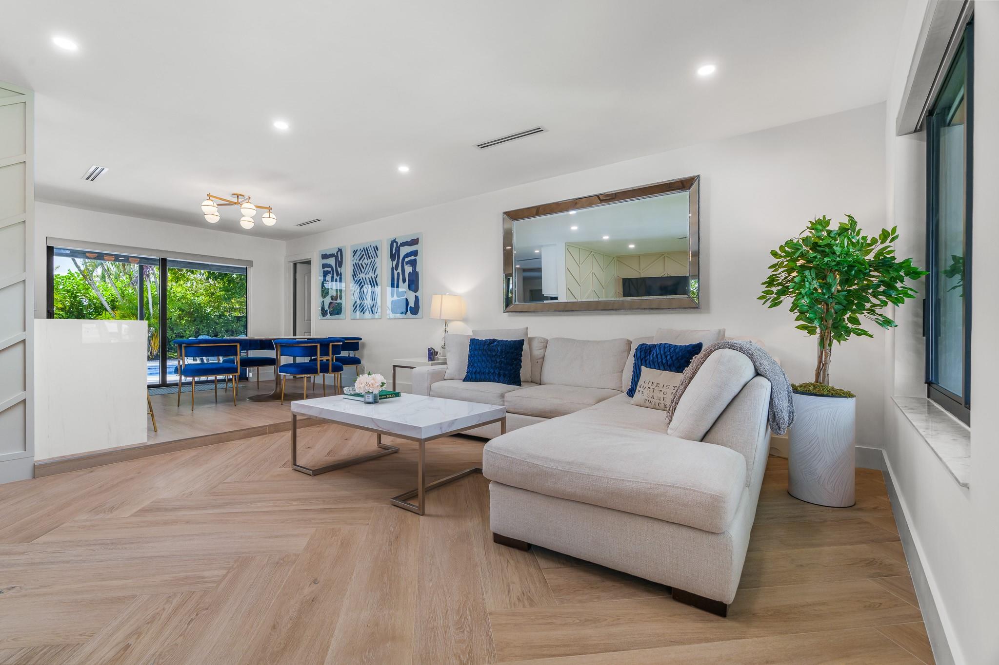 Exquisitely remodeled 3 bedroom, 2.5 bathroom residence showcasing a designer kitchen worthy of a magazine spread, thoughtfully placed tile and wood accent walls for an elegant modern feel, and impact windows/doors throughout. Fresh spa-inspired baths and new interior paint create a pristine, sophisticated ambiance. Outdoors, a brilliant blue resurfaced pool is the focal point from the expansive covered patio and lush tropical yard. New landscaping offers resort-style living, complete with mature fruit trees and new fencing for ultimate privacy. A true turnkey luxury retreat. Roof 2016 / AC 2022