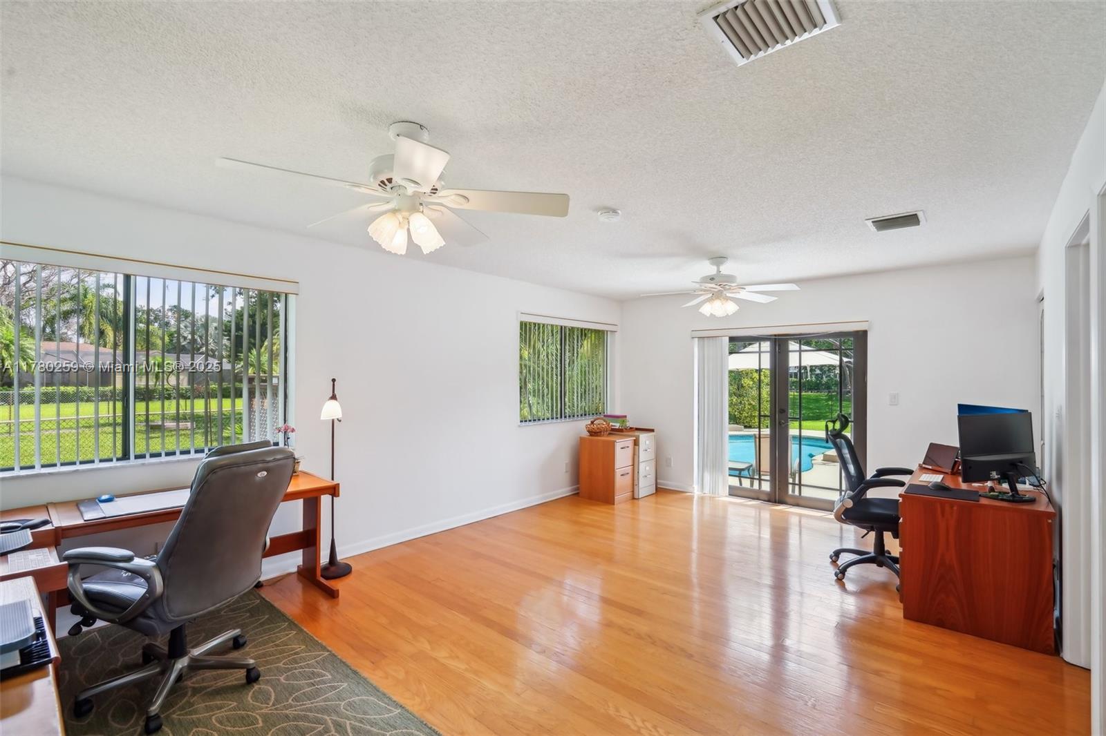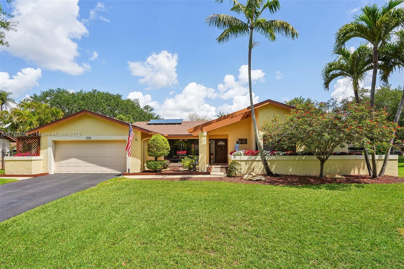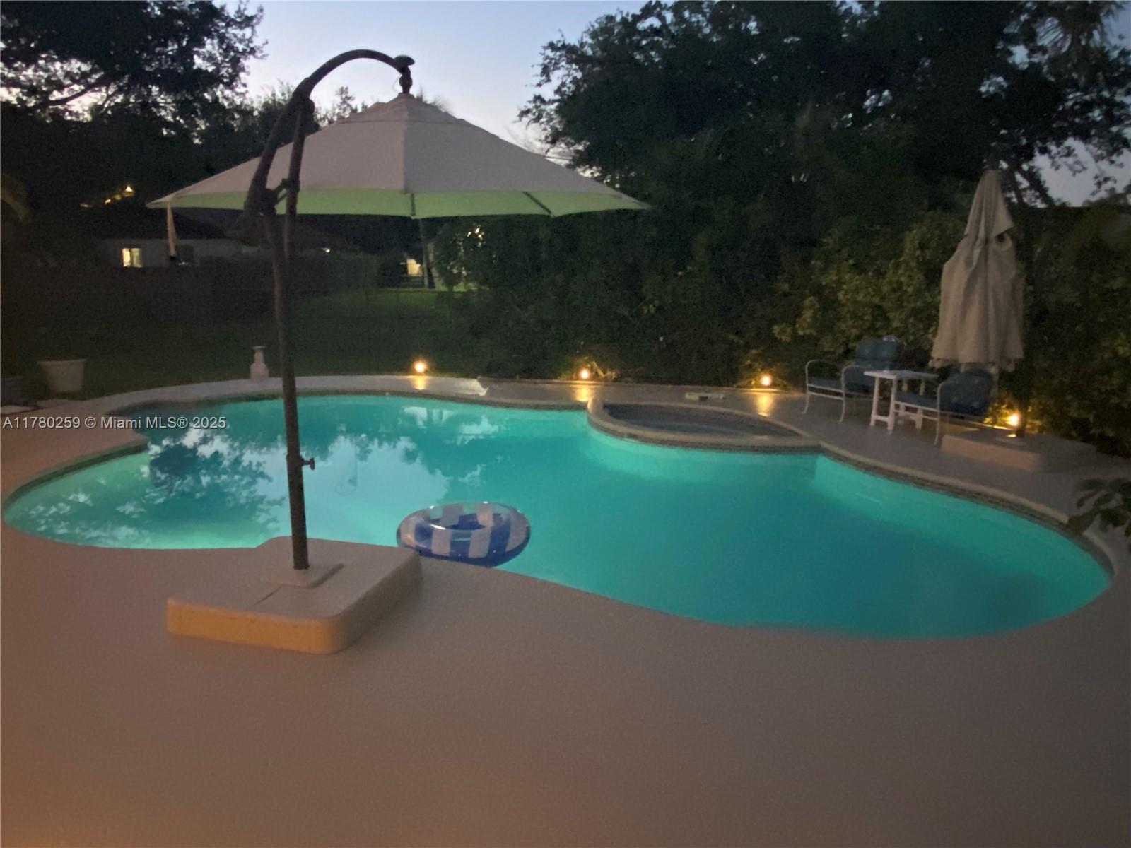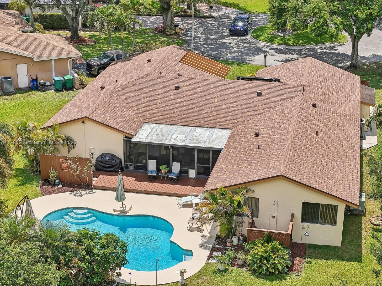 This lovely 4-bed, 3-bath pool home is located on a 1/3 acre lot in a quiet cul-de-sac in the desirable Rock Creek community. The ROOF WAS REPLACED IN MARCH 2025, and the home has IMPACT WINDOWS throughout except three windows which have panels. Inside, the updated kitchen features wood shaker cabinets, granite countertops with seating and an open layout that flows into the family room. The primary bedroom offers 2 walk-in closets & a remodeled, modern bathroom. The backyard is an entertainer's paradise with an enclosed patio, large pool, lighting, shower and privacy provided by a greenbelt area behind the property. The addition of the fourth bedroom (21x13) and bathroom offers the perfect opportunity to create a private mother-in-law suite or split the room into 2 bedrooms with ease.