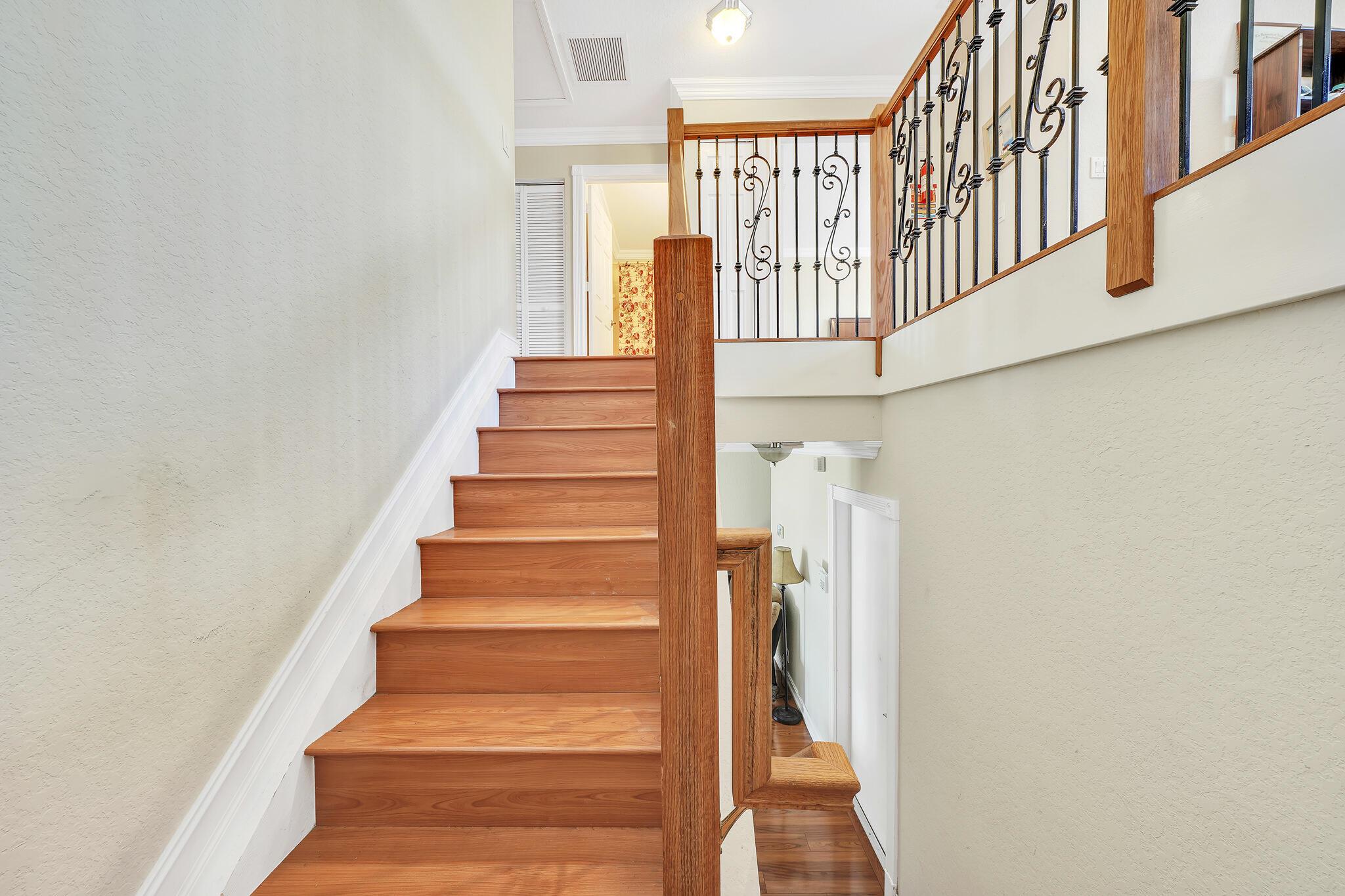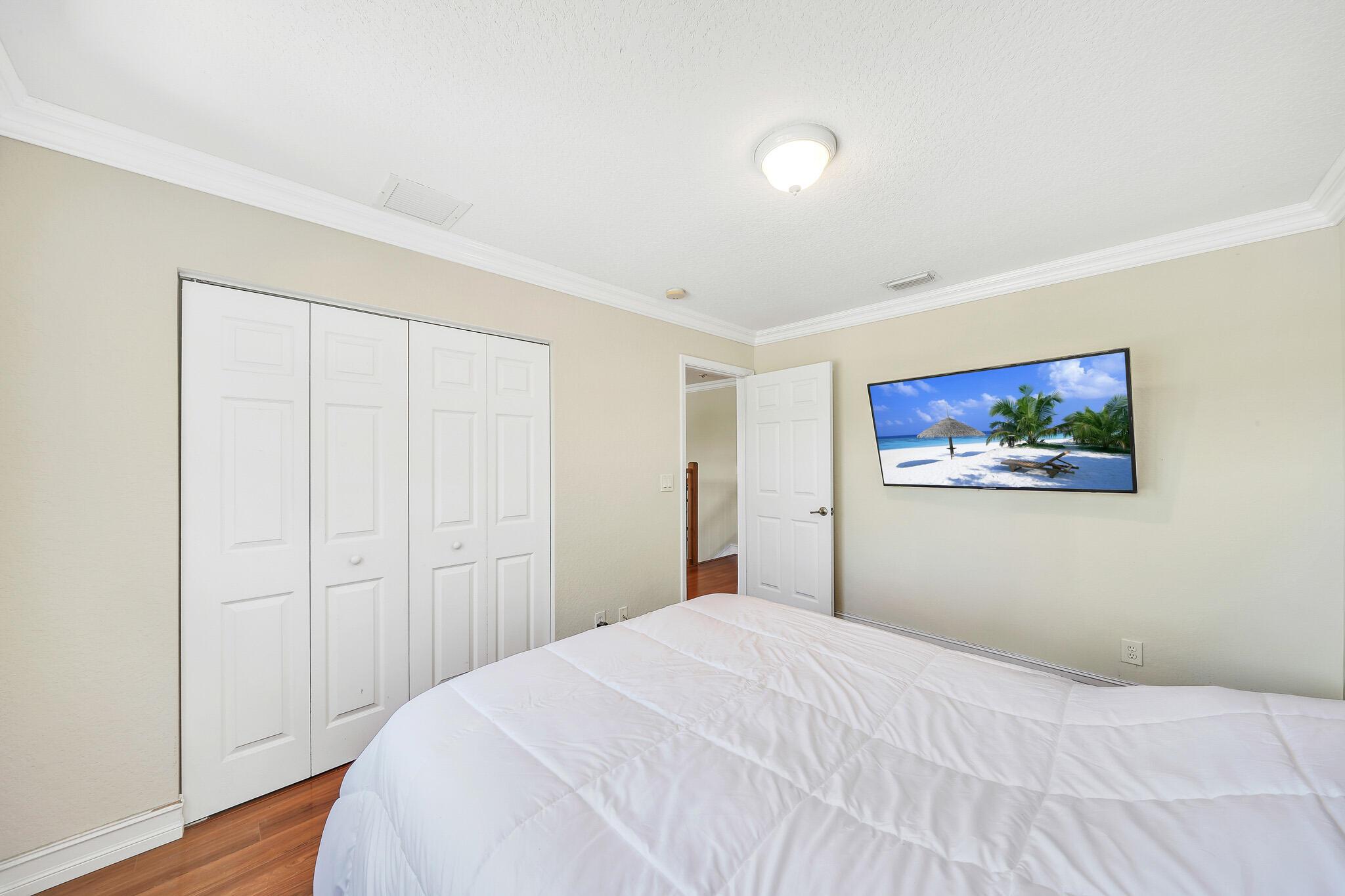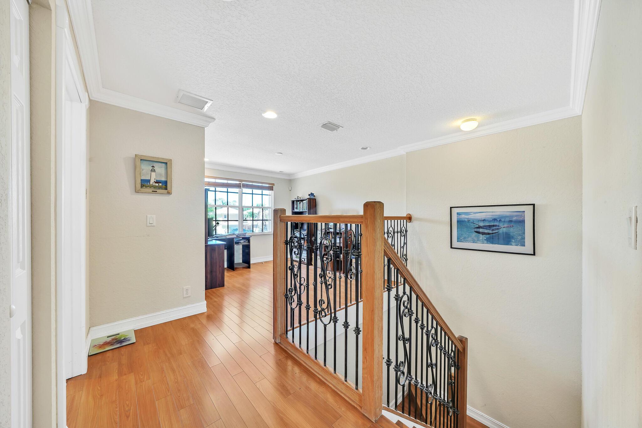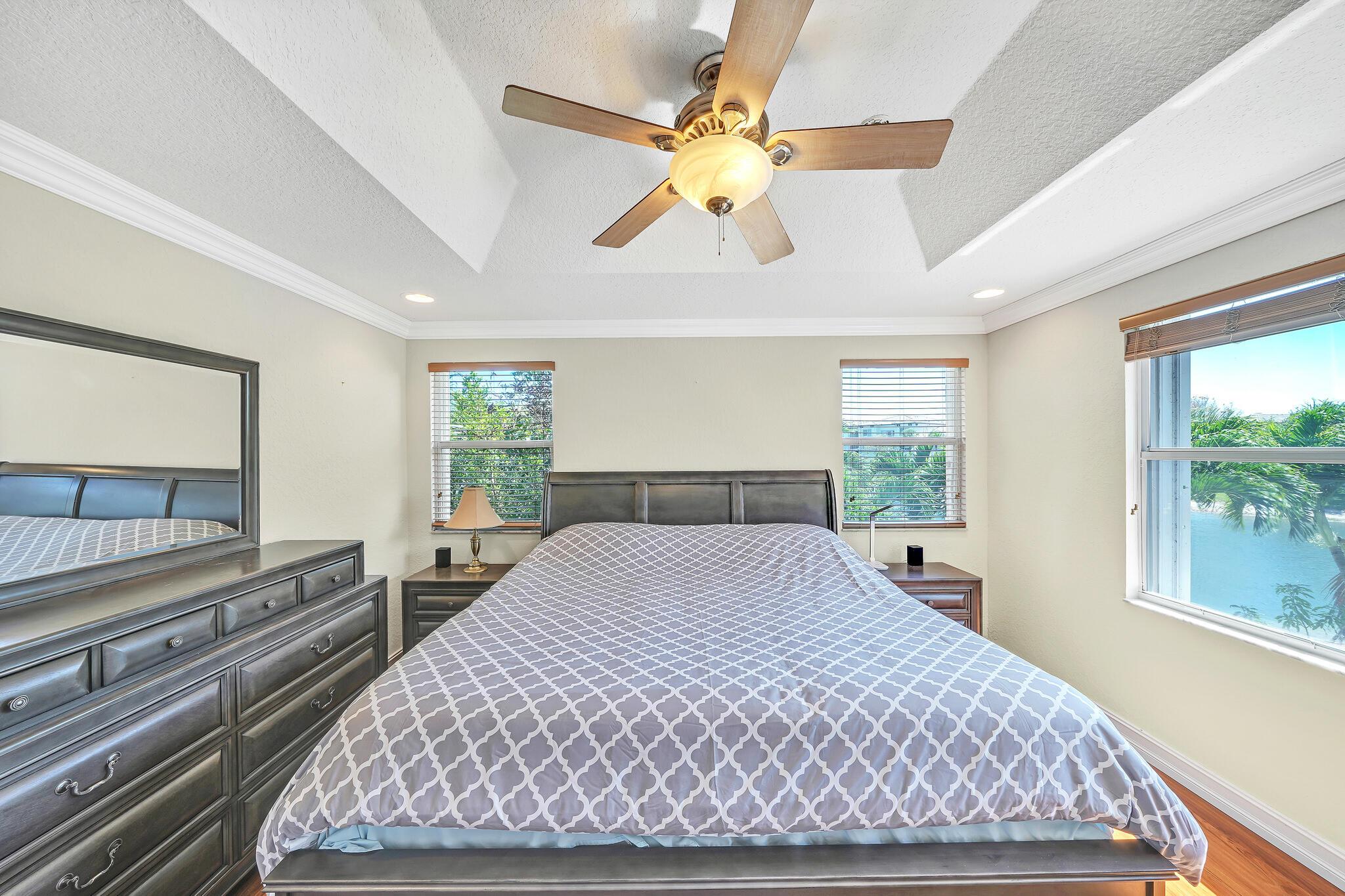 Beautiful lakeside home with large backyard off a private cul-de-sac. Fully fenced for privacy to enjoy the spacious grounds and tranquil lake! Lucious palm trees add to the tropical paradise, while the delicious fruit trees add flavor that include avocado, banana, mango, and more! 3 Bedrooms plus an upstairs loft, 2.5 bathrooms, and a 2-car garage. Rich laminate flooring upstairs and downstairs with tiled bathrooms. The large loft provides the perfect blend of functionality and entertainment options for a productive home office or thrilling home theater! Feel the inviting cool natural breezes in the 2nd floor master bedroom, while you enjoy the panoramic views of the lake! The walk-in closet makes organization and access a dream!