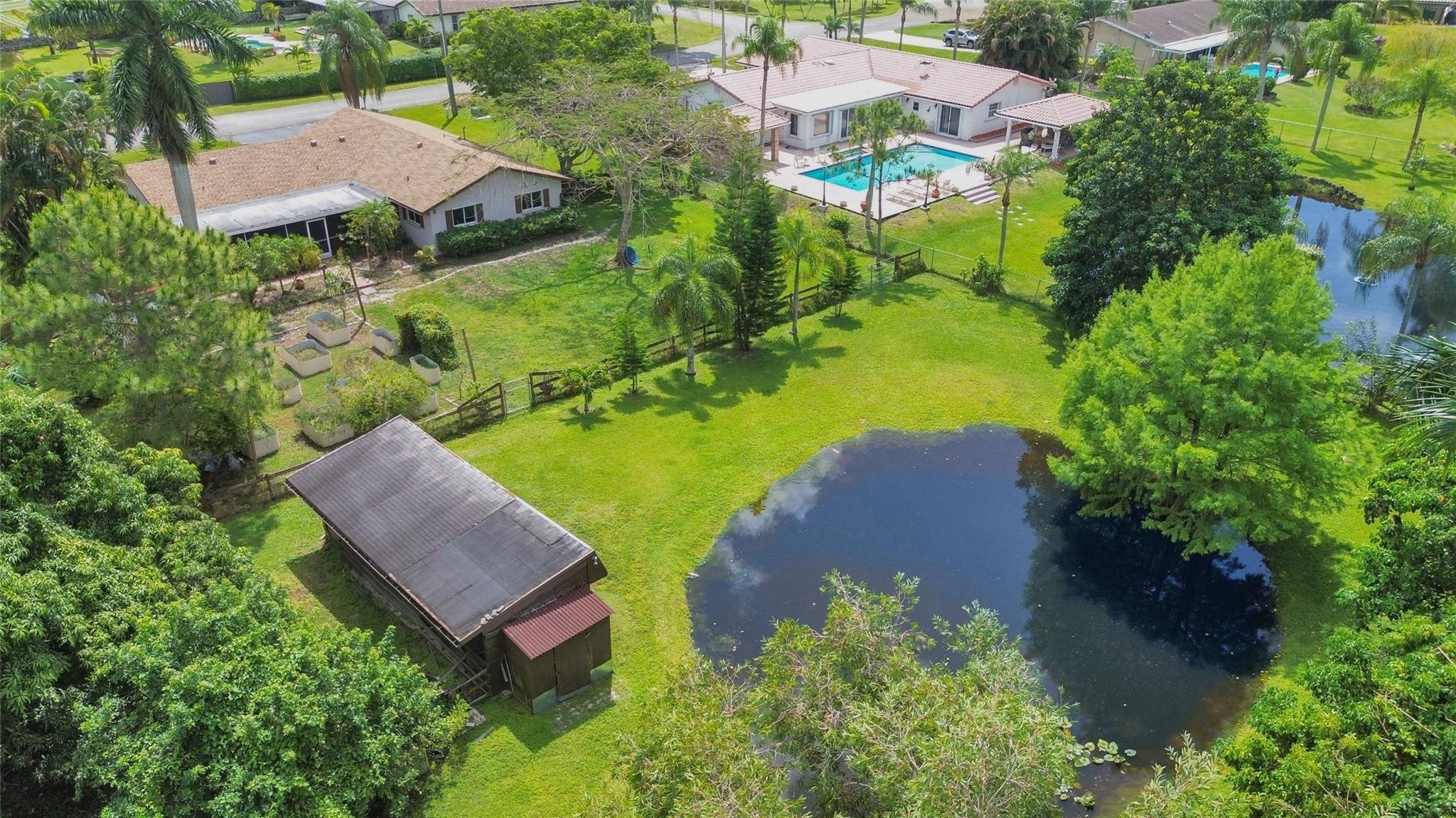 In a beautiful equestrian community this home features 3 horse stalls along with a picturesque pond front. Nestled on a builder's acre that is just perfect for your horses, RV and boats whatever your hobbies might be. New roof 22, water heater 24, W/D 24. Inside, you'll find a warm and inviting living space with an open floor seamlessly connecting the kitchen, dining and living area. The kitchen is equipped with modern appliances, that overlooks a patio, perfect for parties. The 4 bdrms are a good size, primary has new wood flooring & walk in closet. The outside has a huge, screened patio that overlooks the 12 raised garden beds to grow all your produce and a very large pond. The property is completely fenced in. The community will have unground electrical lines by end of yr. Hobby farm.