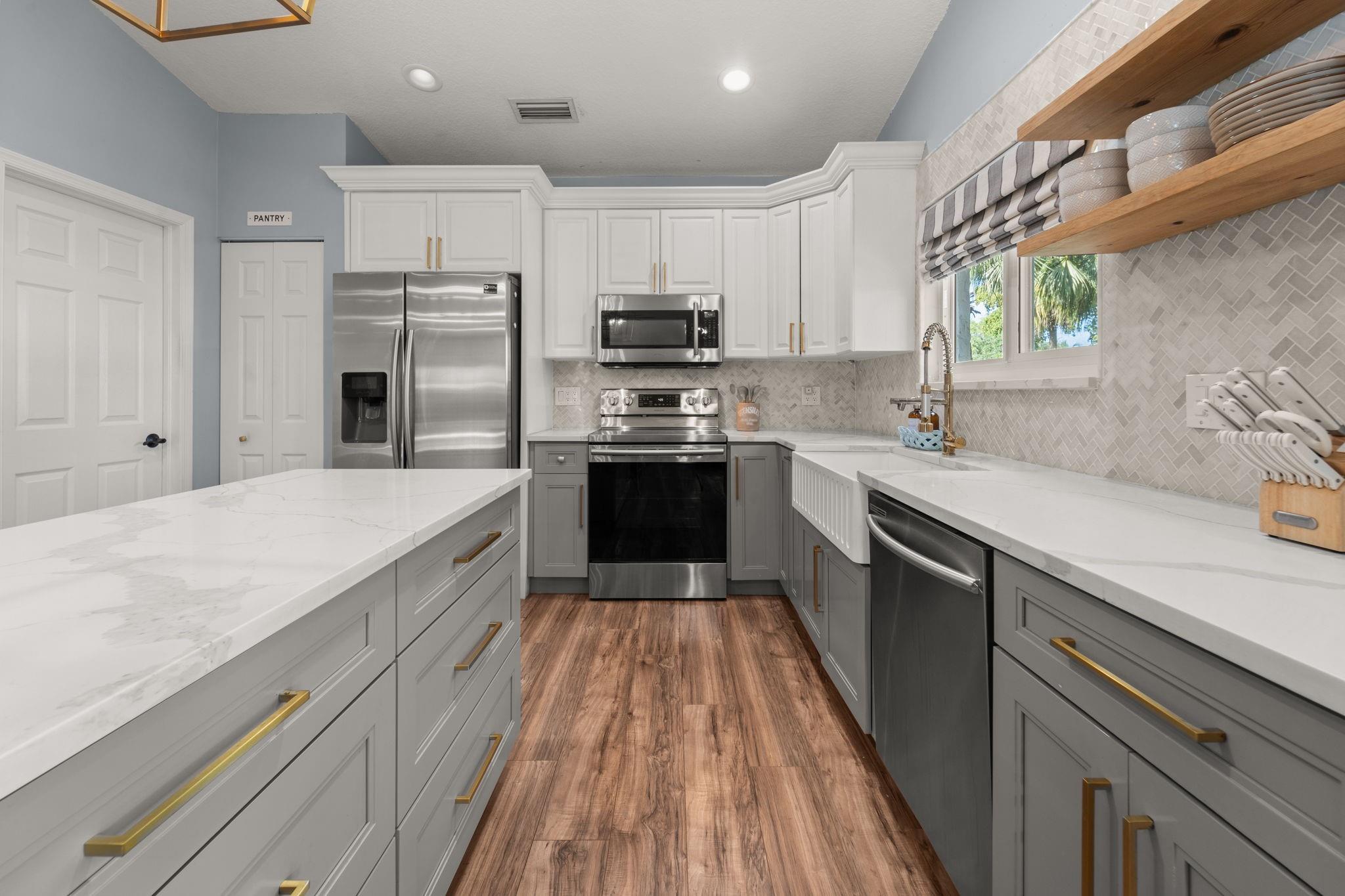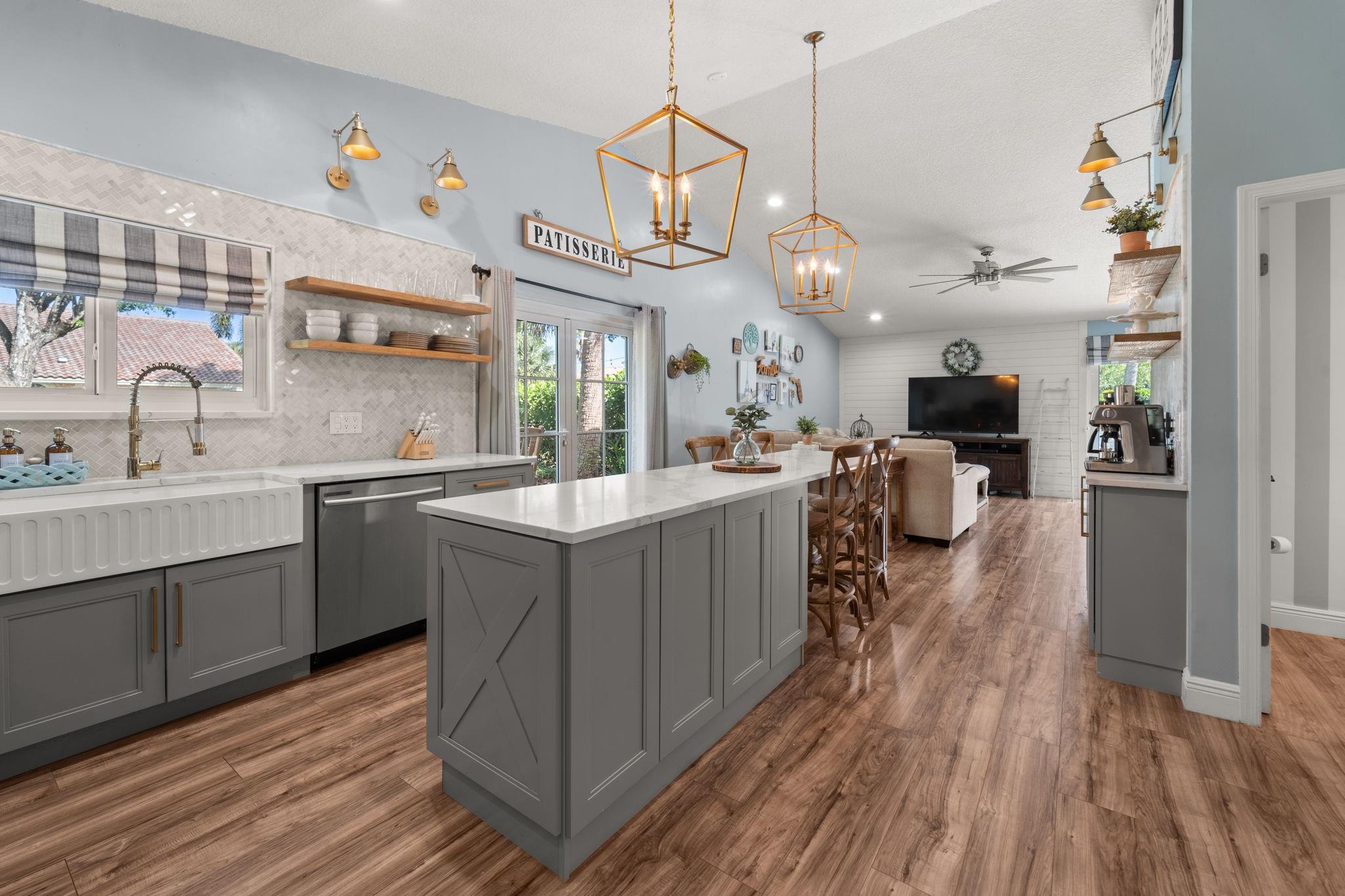 Welcome to your South Florida DREAM HOME! Enjoy Indoor/Outdoor living with this stunning canal-front beauty on the largest lot in Feathertree. The home seamlessly blends elegance with resort-style living. Fully remodeled backyard (2022) features new brick pavers, extended patio, resurfaced pool, new pool tiles & energy-efficient pump. Inside, enjoy a remodeled kitchen (2023) with quartzite counters, Carrera Marble backsplash, custom coffee bar, & oversized island. Perfectly situated on a spacious corner lot, with 13,126 sqft for excellent privacy. Vaulted ceilings, LVP floors, remodeled baths, Impact Windows & Doors with oversized Sliding Doors, & newer Roof (2019), add great value. Professionally designed landscaping complete this private oasis. Close to Shopping, Restaurants, and more!