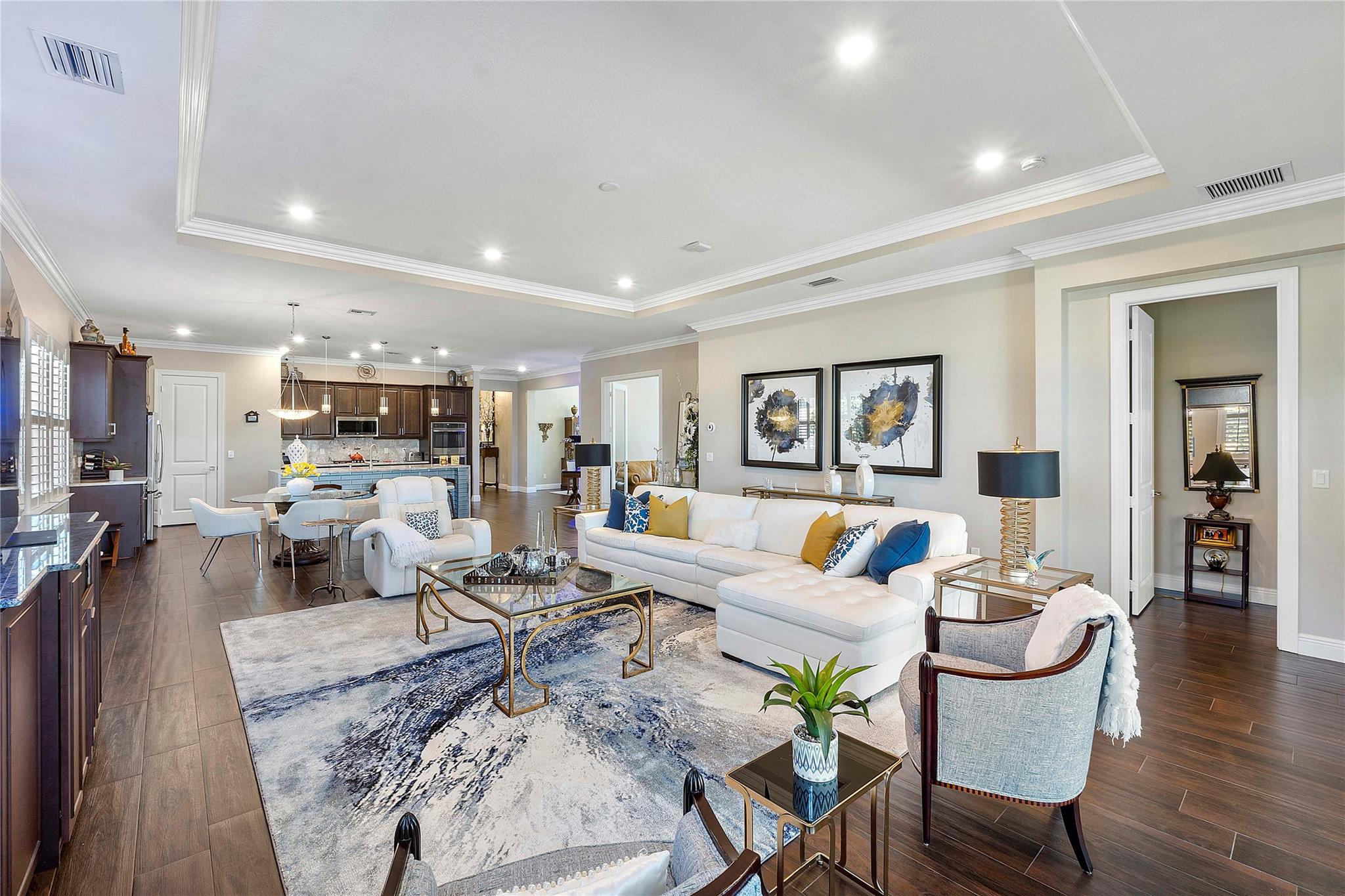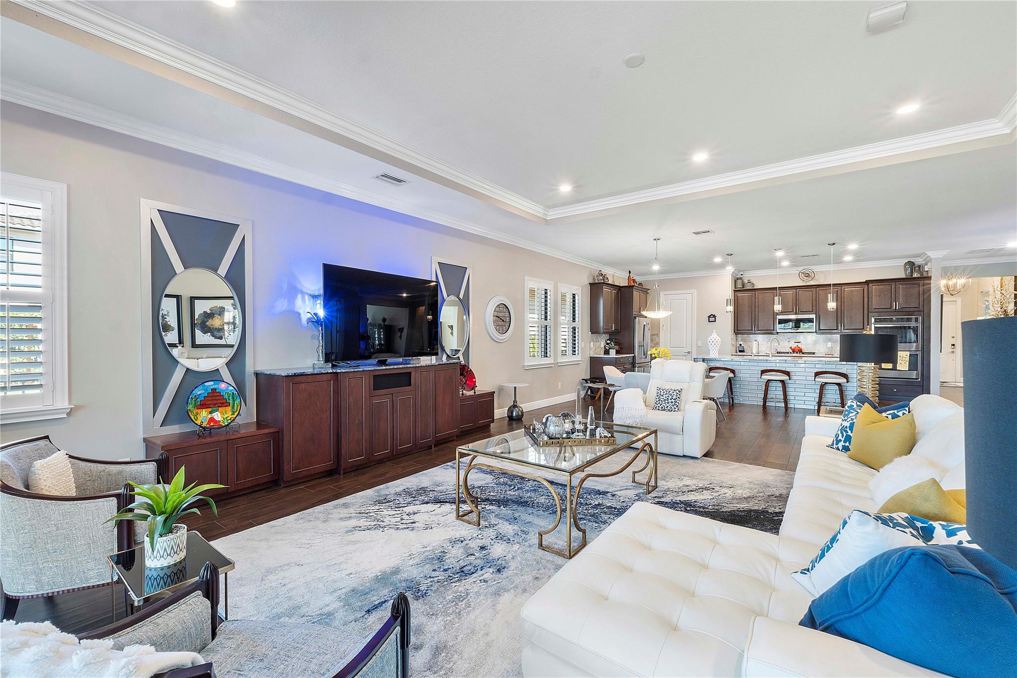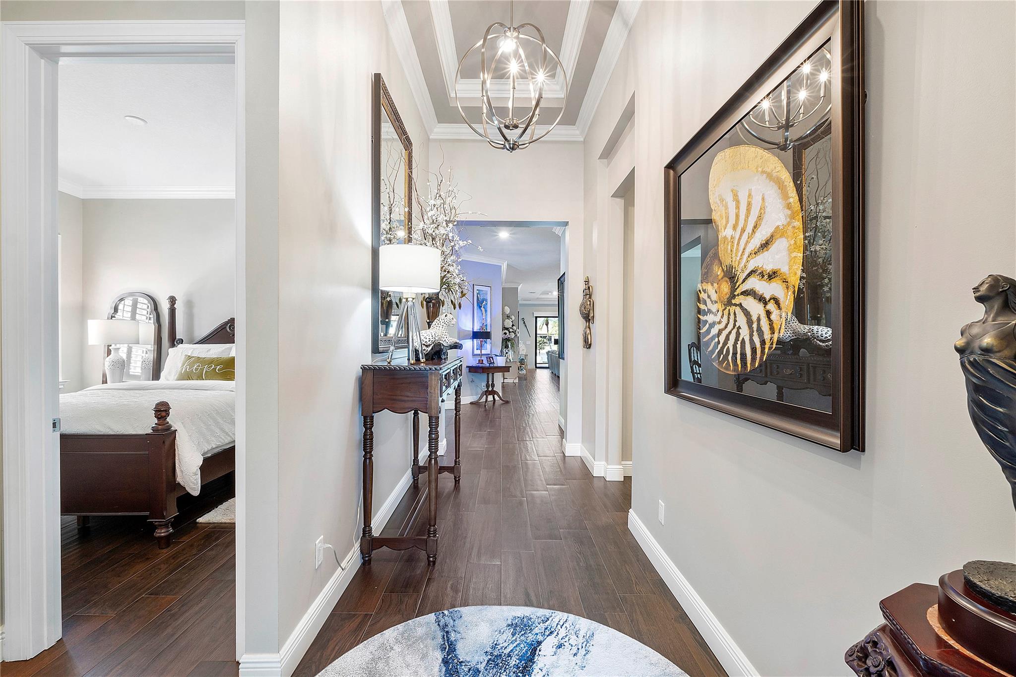MODEL CONDITION ON THE LAKE IN PARKLAND BAY. Welcome to this stunning 4 bedroom, 2 and a half bath home offering elegant wood like tile floors throughout and crown molding in every room. Impact windows and doors. The gourmet kitchen is a chef’s dream, featuring a large center island with quartz countertops, wood cabinetry, double ovens, and a spacious walk-in pantry. Primary bedroom has 2 custom built closets. Primary bath has 2 sinks, roman tub, private toilet and large shower equipped with frameless glass doors. Plantation shutters add a touch of charm and privacy throughout the home. Enjoy serene lake views from the comfort of your screened patio.