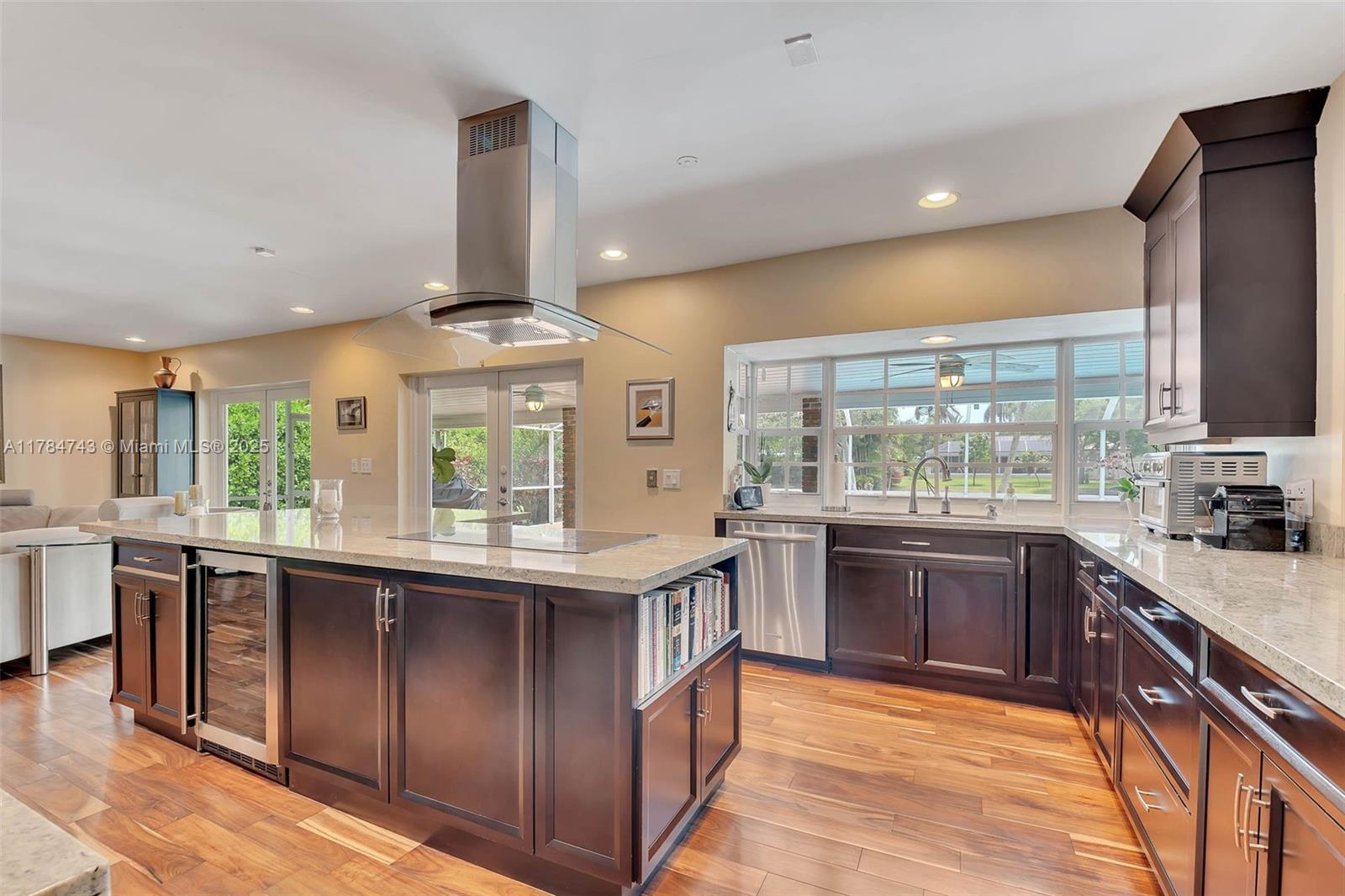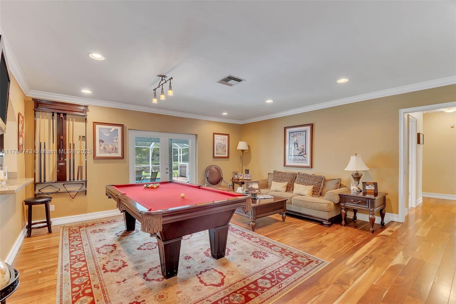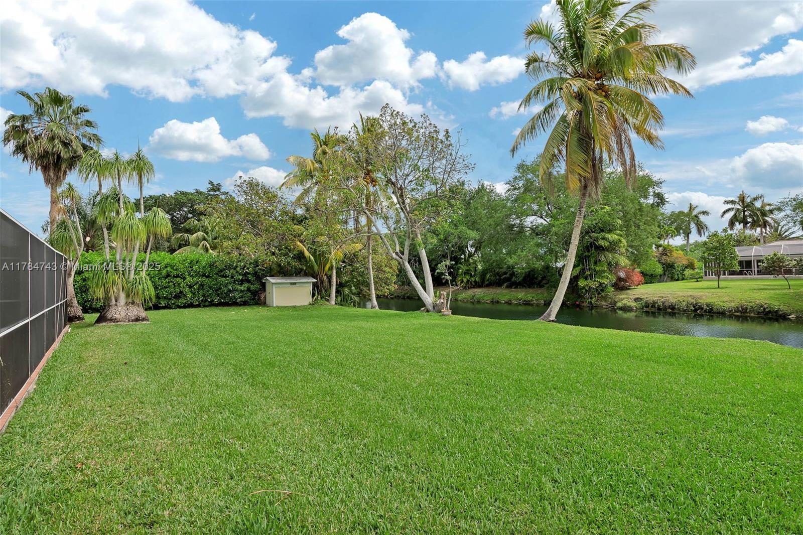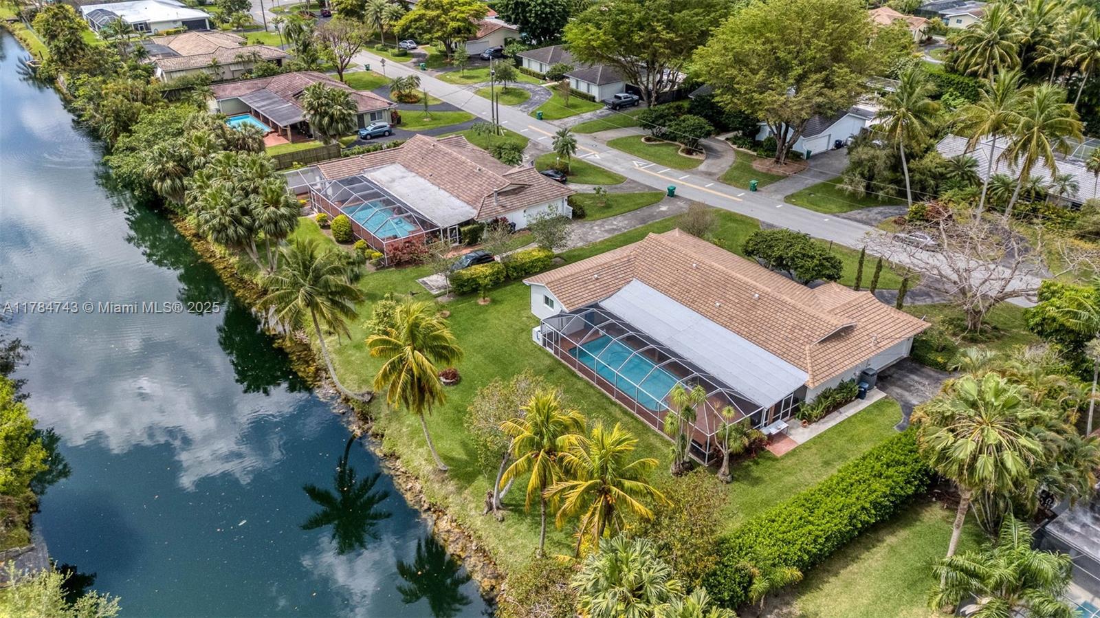 Wonderful 4 bdrm/ 2.5 bath home on lovely, wide & serene canal in Palmetto Bay. Formal living & dining rms w/ crown molding, French doors leading to the backyard. Wood flooring throughout. Great kitchen w/ cooking island, built in seating area, desk/office area, opens to family rm. Conveniently located half bath for guests. Guest bdrms have custom closets. Primary suite features walk in closet, bath w/ dual sinks, glass enclosed shower, water closet. Plantation shutters, impact windows/doors, 2023-installed flat tile roof. Indoor laundry rm. Pristine backyard w/ expansive lawn, fire pit, shed, spacious covered patio, screened pool. Enjoy bird watching, fishing or launch a boat from your backyard & enjoy the South Florida canal lifestyle.  Circular driveway, 2 car side entry garage.