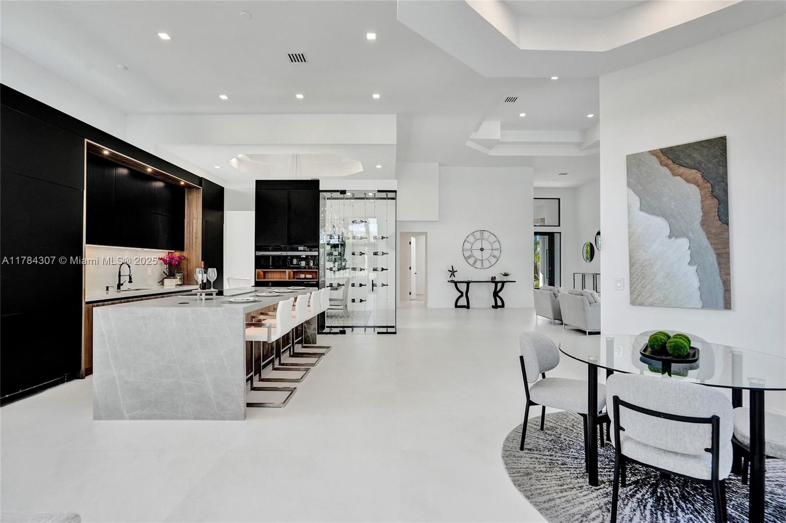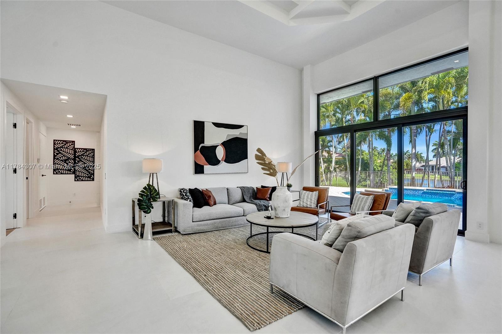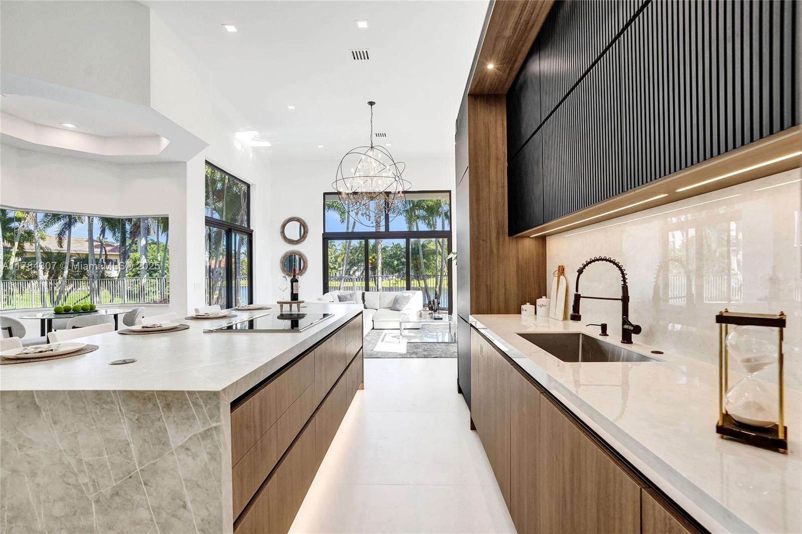 Discover this fully renovated estate in Poinciana at Weston Hills CC situated on a 16,345 sqft lot. Every inch of this home showcases exceptional craftsmanship, including NEW impact windows, NEW roof, and NEW HVAC system. Inside, 4 Bedrooms/Office/4.5 Bath, floor-to-ceiling windows flood open-concept layout with natural light, water and pool views. Gourmet kitchen with Miele/Wolf appliances, Neolith stone surfaces, Italian Marfa cabinetry, and spacious hidden pantry. Modern 50-bottle glass wine cellar with 8ft glass pivot door and European hardwood. Retreat to oversized primary suite, with boutique-style closet and spa like bathroom, while all-new “Belldini” solid core doors. Outside, resort-style pool with Diamond Brite, paver deck, and covered patio overlooking the panoramic lake views.