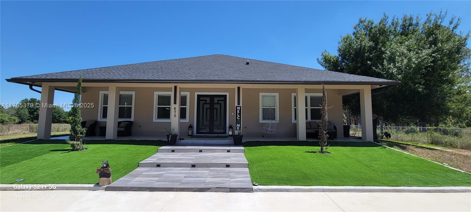 Beautiful home in Montura Ranches awaits you. Find your perfect nature getaway in this gorgeous 3 Bed/2 Bath, fully fenced 1.25 acre, CBS home, built in 2024. This gorgeous home is fully furnished with state of the art appliances, security camera system, custom exterior impact doors and windows. Ample porches front and back. Additional separate covered entertainment area, parking for golf cart, above ground pool deck, fire pit area, 2 large sheds, and many fruit trees! On Well & Septic with water filtration systems. Perfect for fishing and boating on Lake Okeechobee and other outdoor sports activities in the area. Close to US 27! Easy to show! Come and see soon!