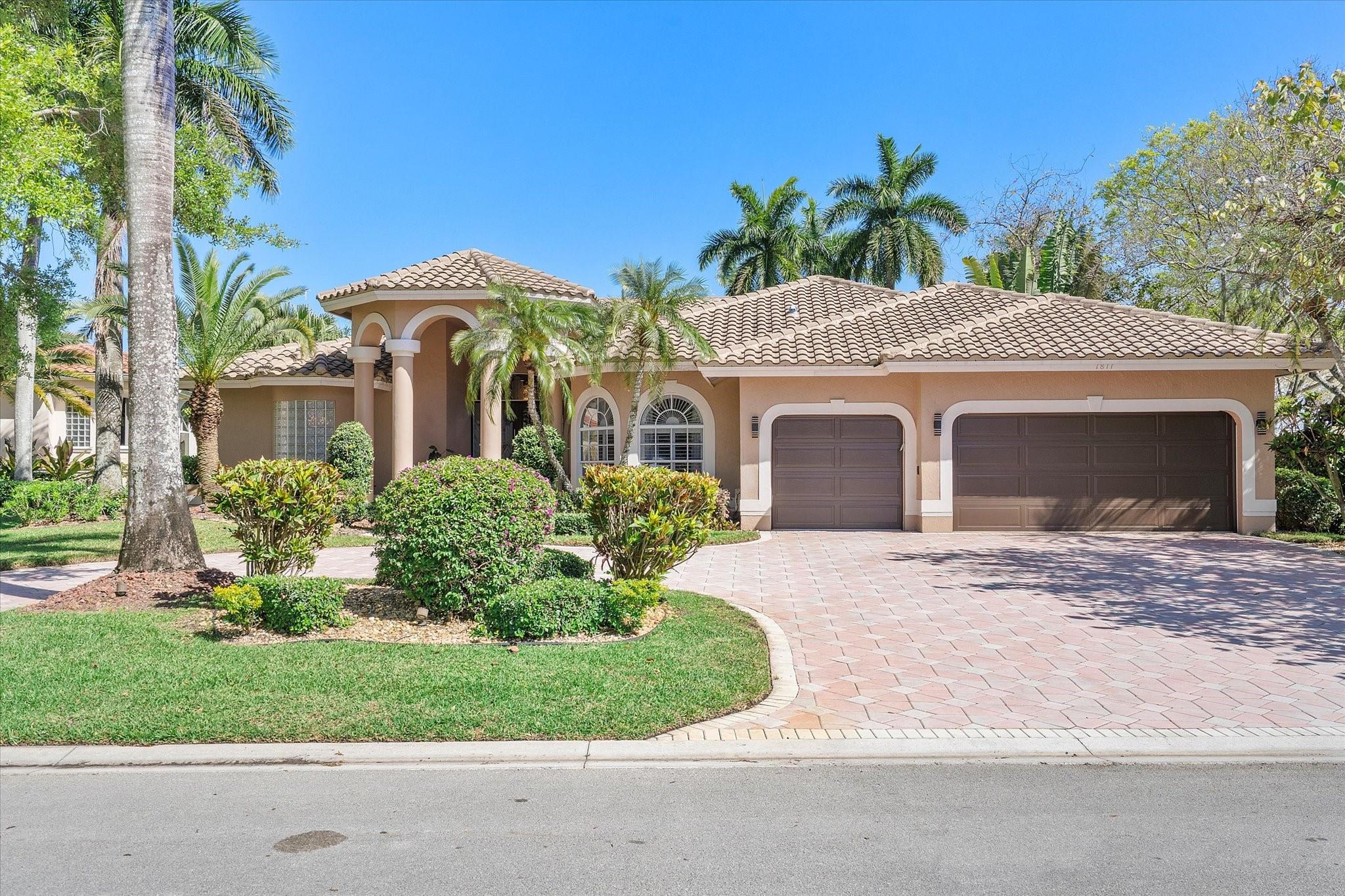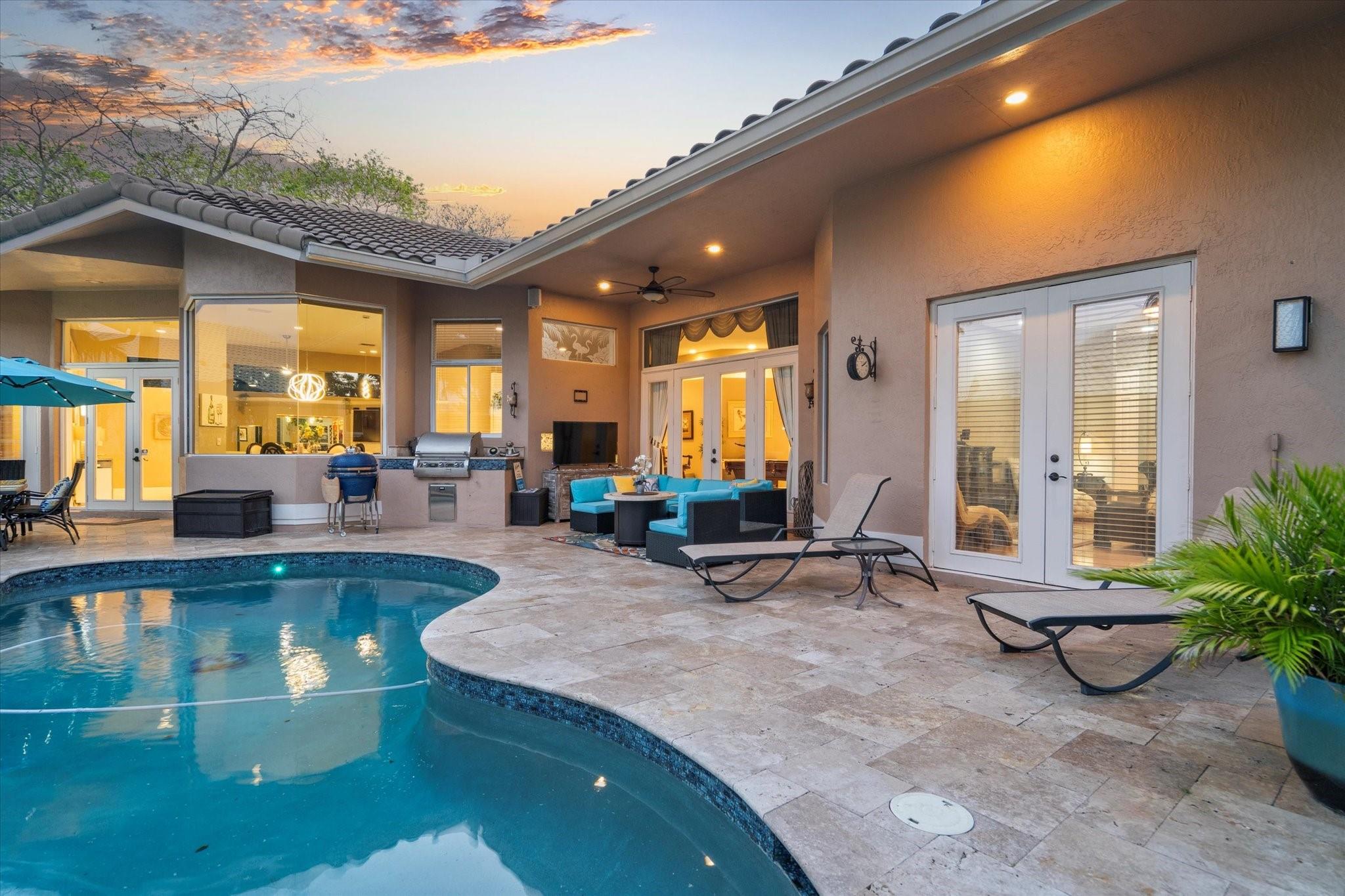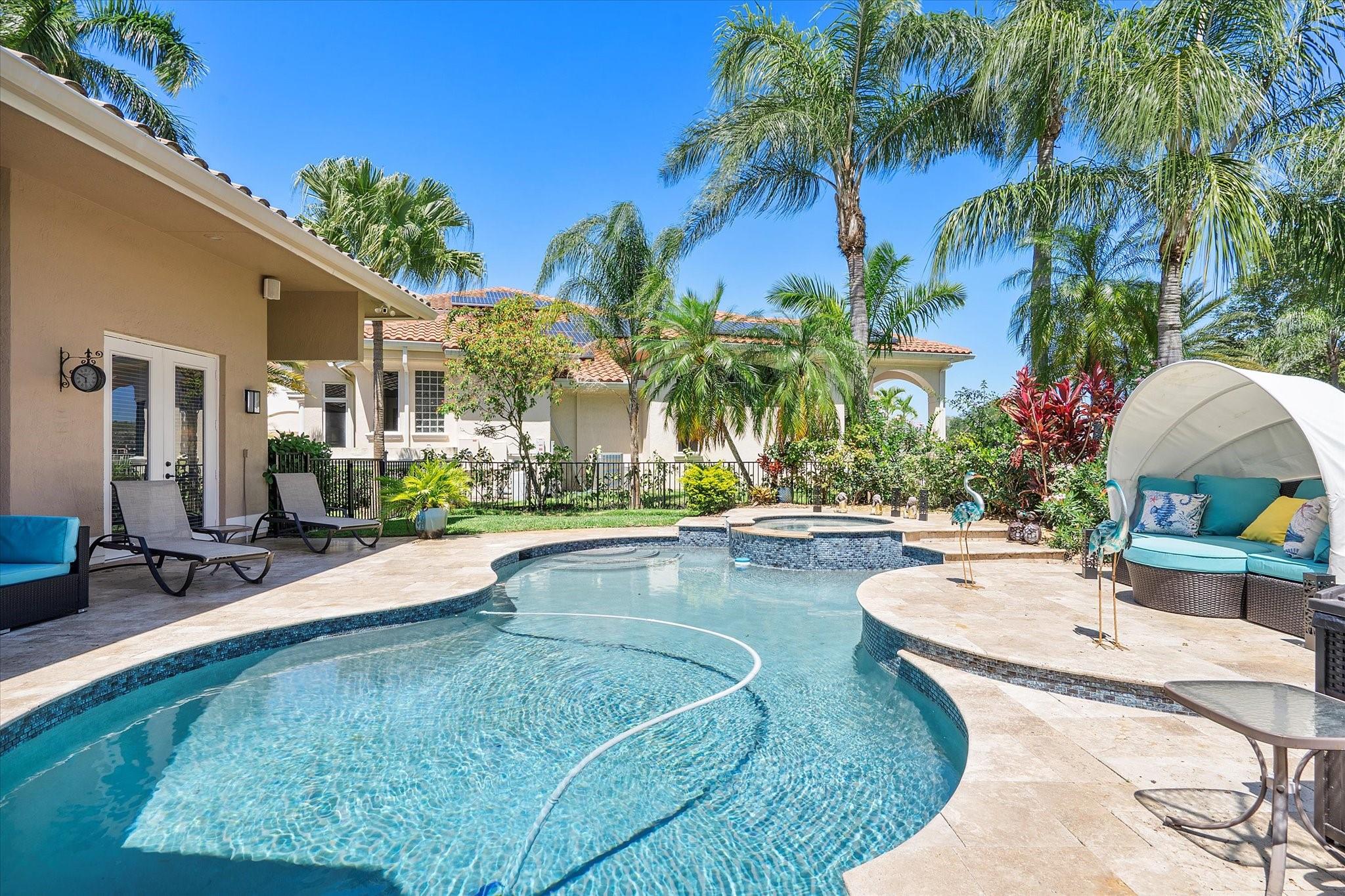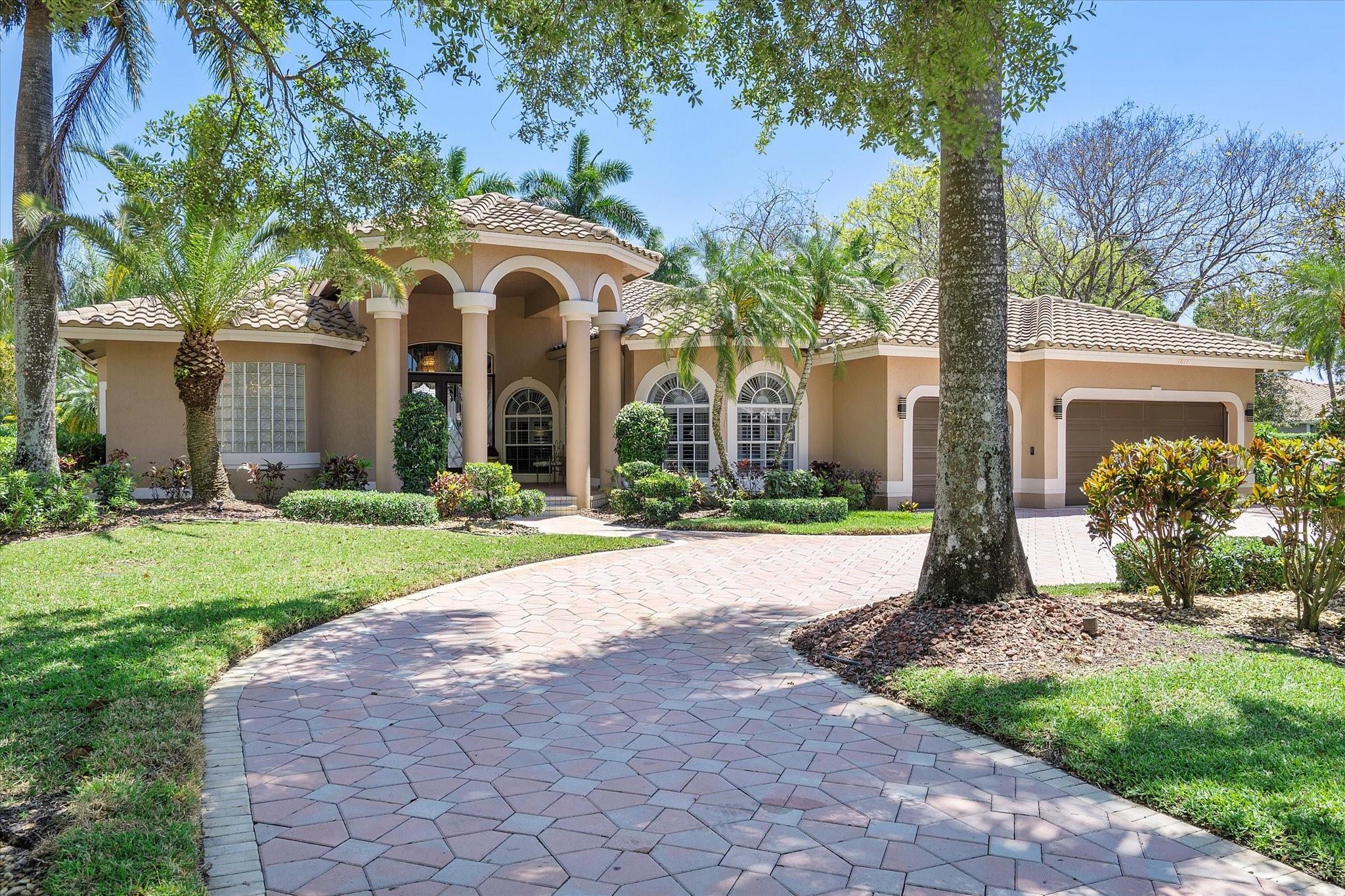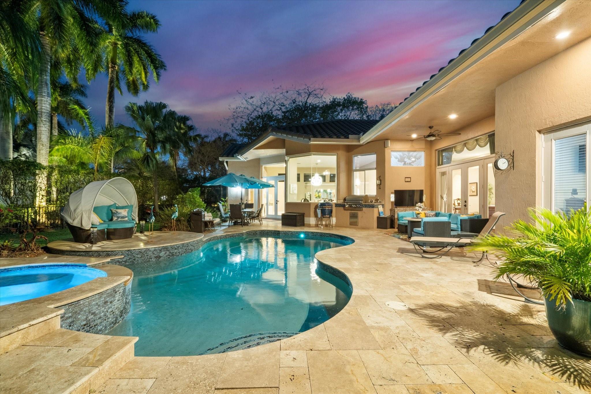 Exclusive, gated Greens of Eagle Trace dream home with amazing golf course views! This 5-bed, 4-bath residence sits on a prime oversized corner lot with a circular paver driveway and 3-car garage. Recent upgrades include a 2018 roof, 2 newer AC units, new hurricane-impact garage door and windows, new kitchen appliances, new pool heater, and updated bathrooms. Entertain in the spacious formal dining room or central living area. The luxurious primary wing offers dual walk-in closets and a spa-like ensuite with marble tile, walk-in shower, soaker tub, and dual vanities. Enjoy volume ceilings, ceramic tile, a cozy family room fireplace, and a private backyard oasis with a remodeled pool, infinity edge, spa, travertine pavers, cabana bath, summer kitchen, and serene golf course views.