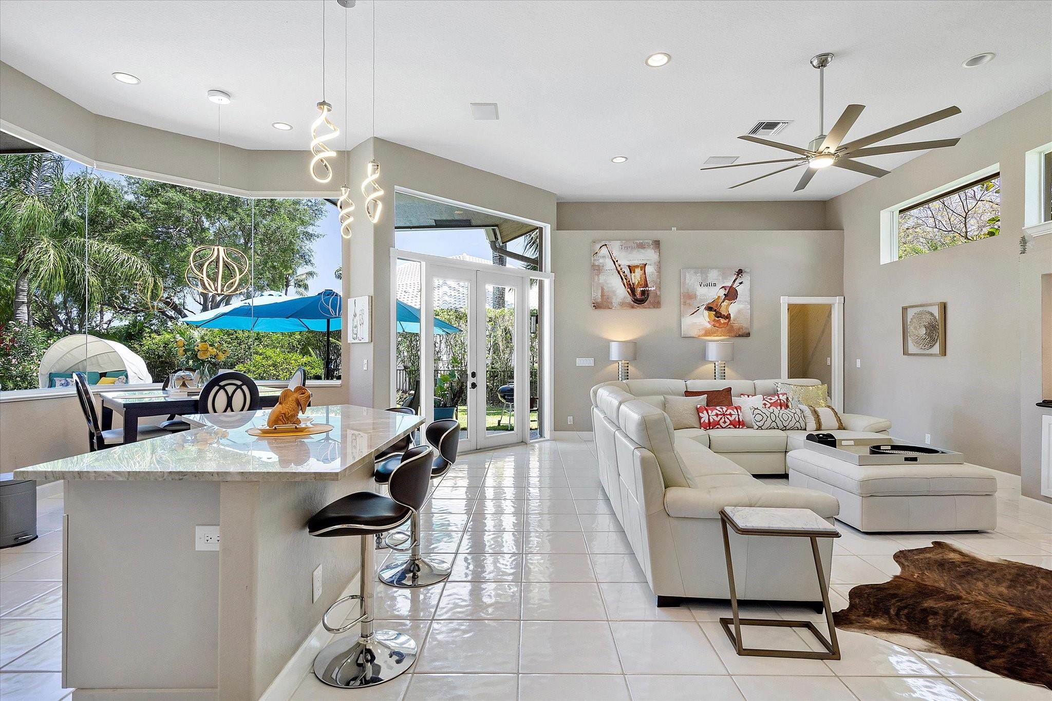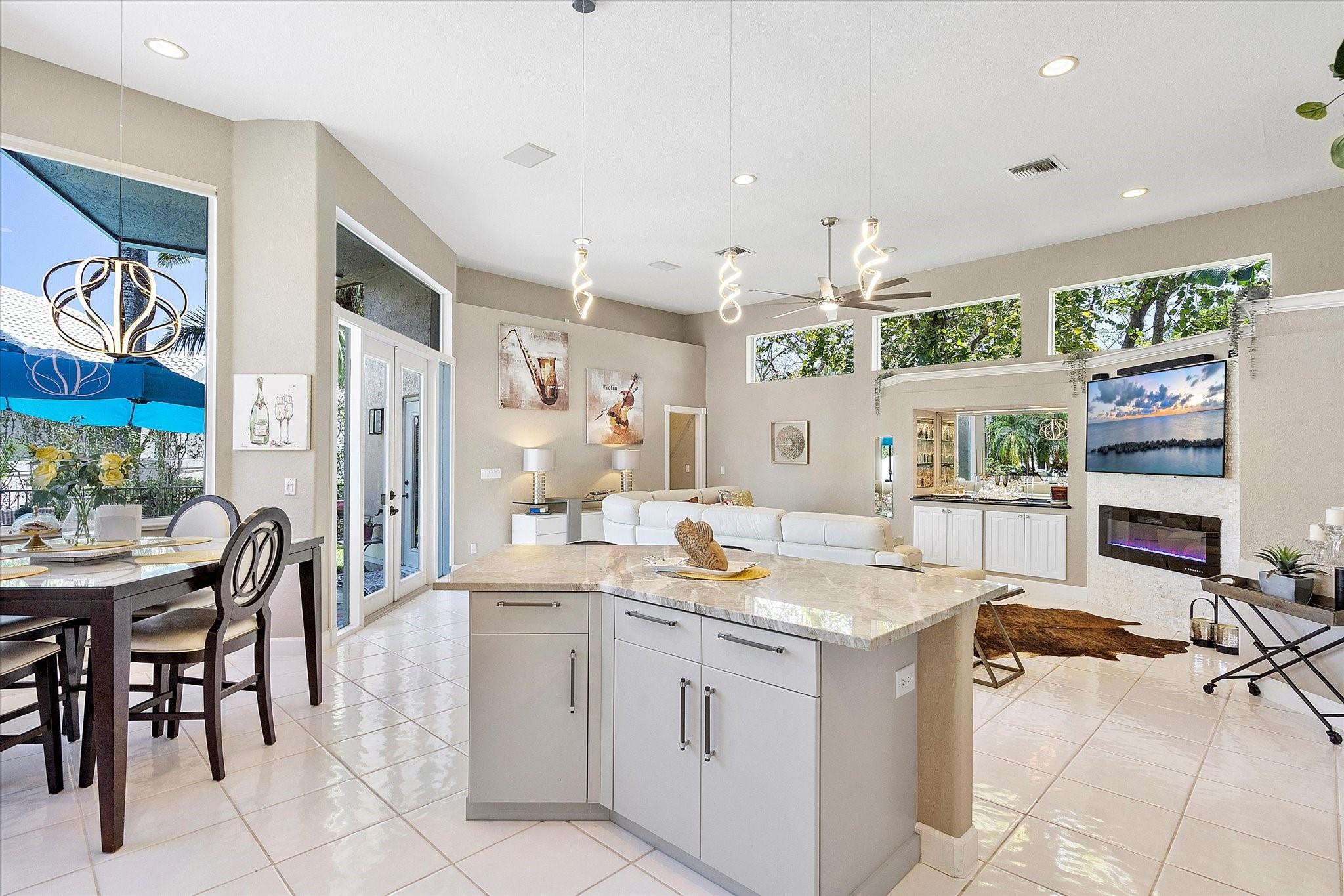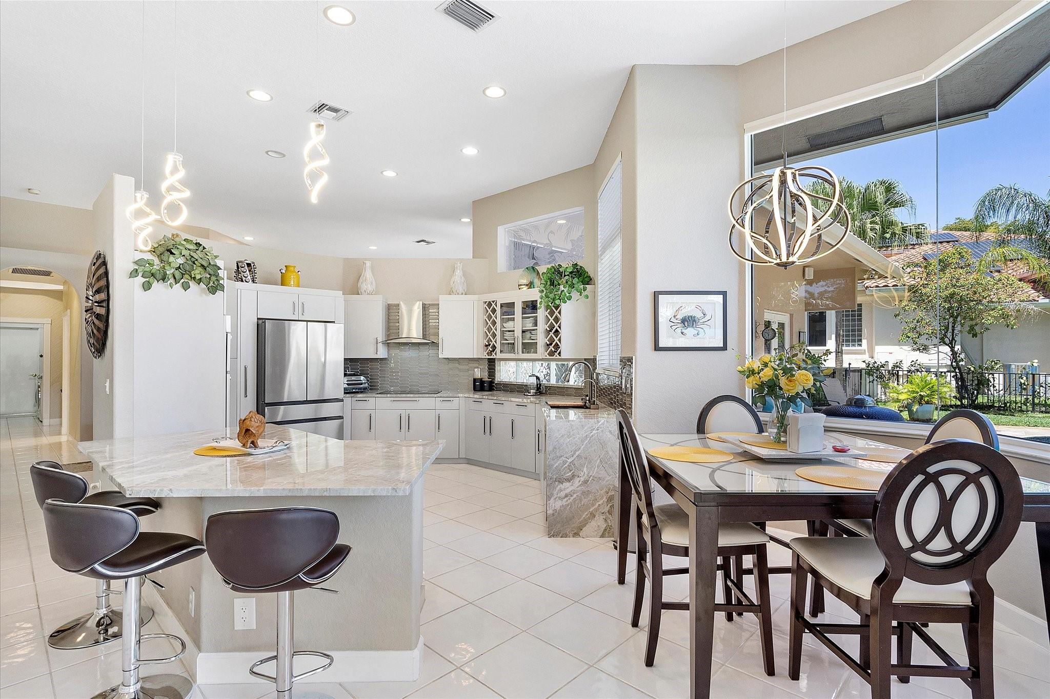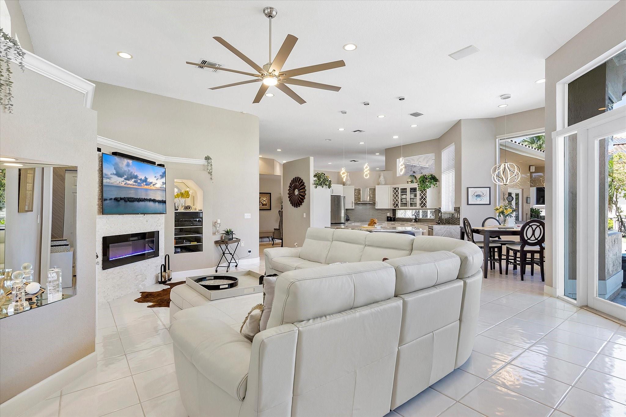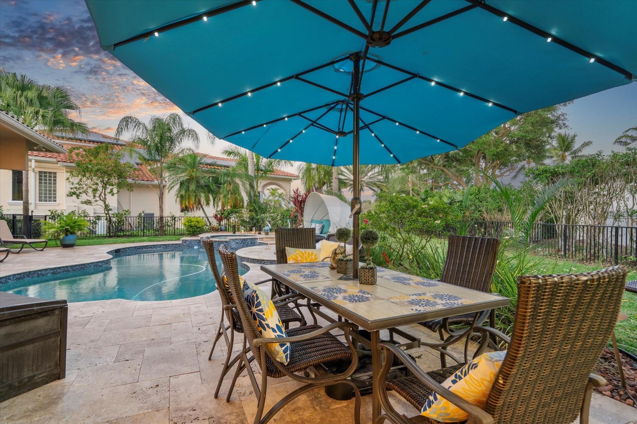 Exclusive, gated Greens of Eagle Trace dream home with amazing golf course views! This 5-bed, 4-bath residence sits on a prime oversized corner lot with a circular paver driveway and 3-car garage. Recent upgrades include a 2018 roof, 2 newer AC units, new hurricane-impact garage door and windows, new kitchen appliances, new pool heater, and updated bathrooms. Entertain in the spacious formal dining room or central living area. The luxurious primary wing offers dual walk-in closets and a spa-like ensuite with marble tile, walk-in shower, soaker tub, and dual vanities. Enjoy volume ceilings, ceramic tile, a cozy family room fireplace, and a private backyard oasis with a remodeled pool, infinity edge, spa, travertine pavers, cabana bath, summer kitchen, and serene golf course views.