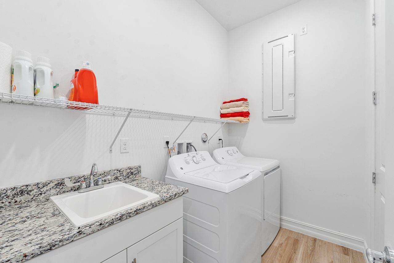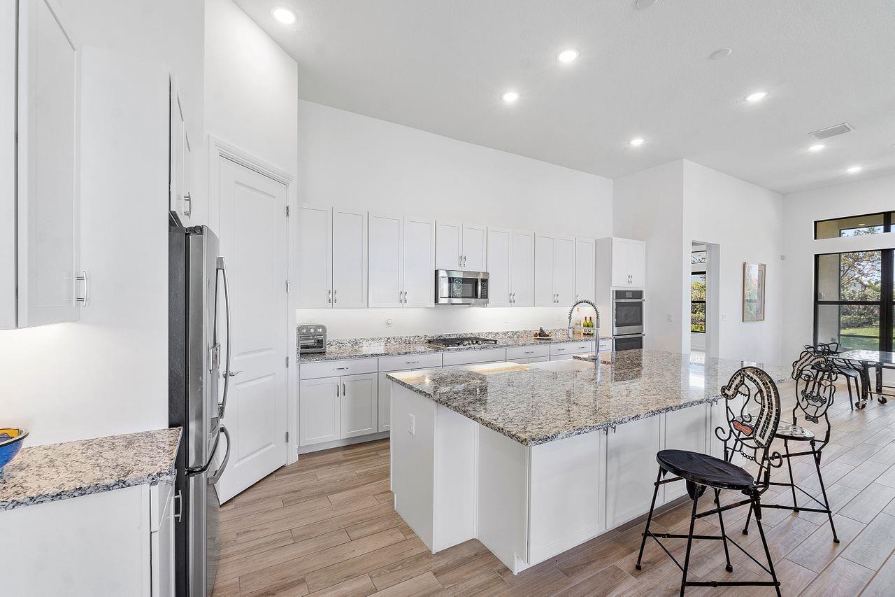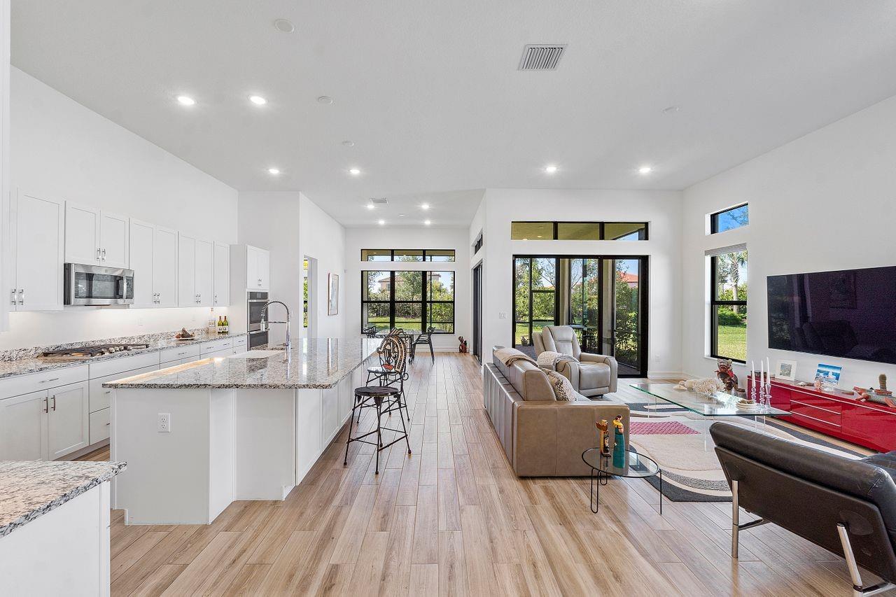 Welcome home! Step into this beautifully maintained, barely lived-in residence that exudes warmth & comfort from the moment you arrive. The spectacular open floor plan greets you with soaring volume ceilings & an abundance of natural light, creating an inviting & airy atmosphere. Spacious two bedrooms, a flex room perfect for dining/bonus/or office space. Split Floor plan offers privacy. Fall in love w/the kitchen's crisp white cabinets, granite countertops, and a walk-in pantry. Step outside to the LARGE screened paver lanai, an ideal retreat for enjoying the Florida sun. Addt'l Highlights a walk in laundry room and a meticulous interior. Vibrant 55+ community w/activities pickleball, tennis courts, cafe and resort style amenities-all w/no membership fee.