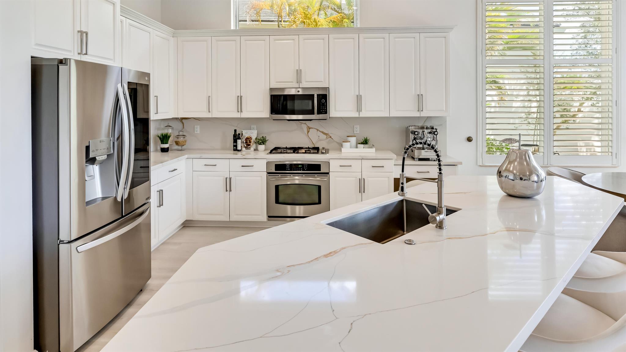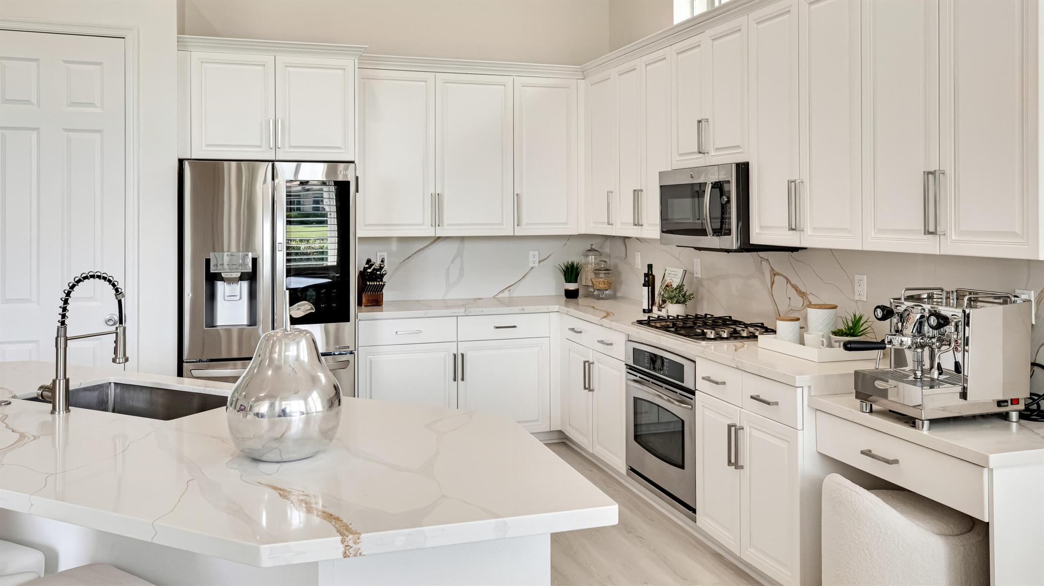 Nestled within the prestigious Mirasol Country Club is this exquisite home offering 5 bedroom and 5.5 baths. This highly desirable Seville home offers the ultimate South Florida lifestyle. Imagine unwinding in your private backyard oasis, complete with a sparkling poolside retreat and breathtaking lakefront vistas. There is plenty of living space in this expansive residence, with over 4,100 square feet of luxurious living space. Beautifully updated kitchen featuring stunning new quartz countertops and backsplash, and grand island perfect for entertaining. The first floor oversized master suite provides a serene escape with tranquil lake views and custom-designed closets.