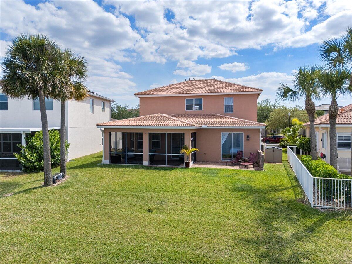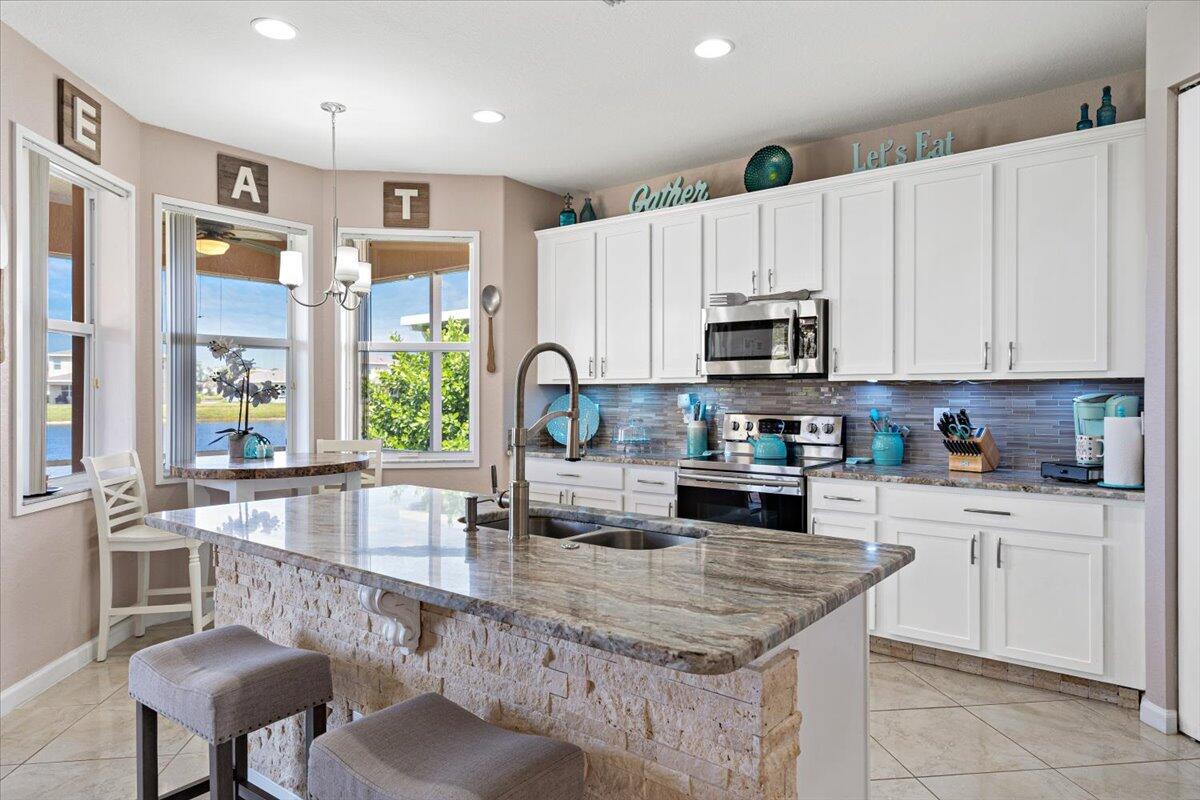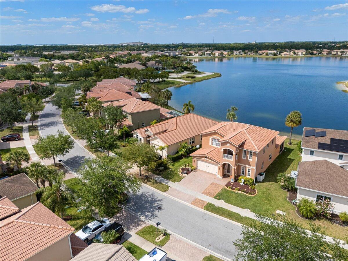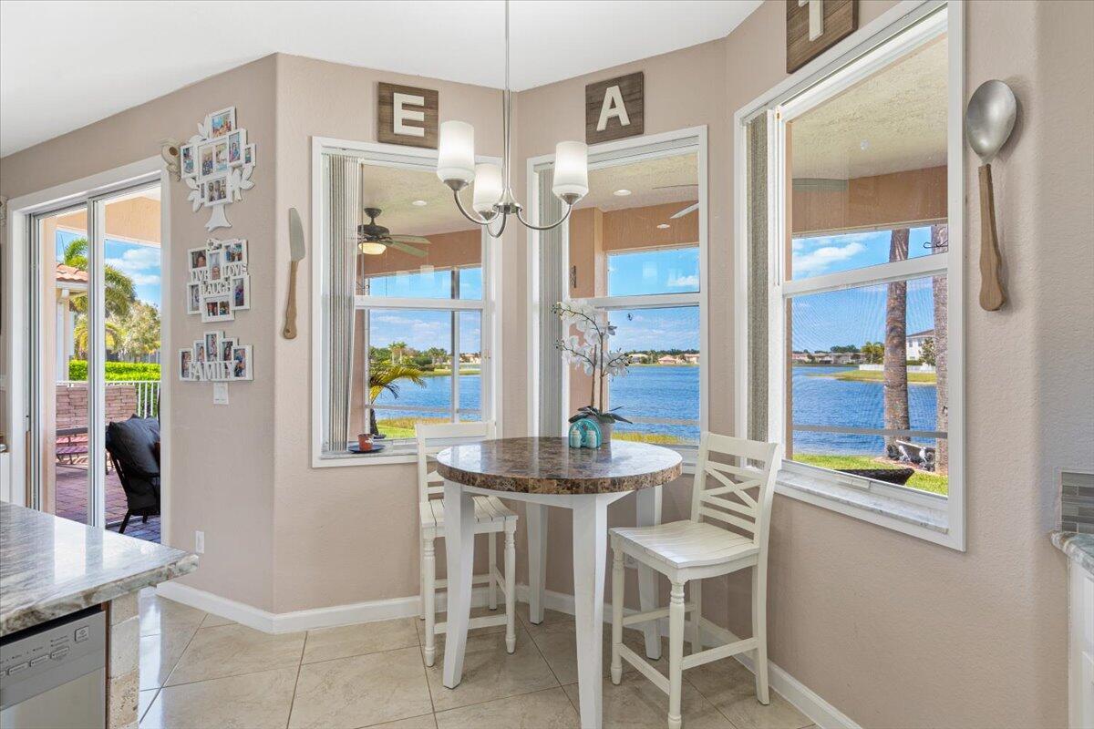 Live like you're on vacation in this stylish 4-bedroom, 2.5-bath home in coveted Vizcaya Falls, showcasing peaceful lake views and a smart, open layout. Solid CBS construction spans two stories with tile throughout the first floor, luxury vinyl on the stairs and upstairs commons, and soft carpet in the bedrooms. Soaring ceilings are elevated by upgraded crown molding, designer fixtures, and a statement chandelier. The upgraded kitchen shines with granite counters, a center island, and a sunny breakfast nook. Retreat to the first-floor primary suite with Roman tub, oversized shower, dual vanities, and a spacious walk-in closet. Recent updates include a 2024 washer & dryer, expanded three-car-width driveway, large entertaining patio, new impact-rated front door, and