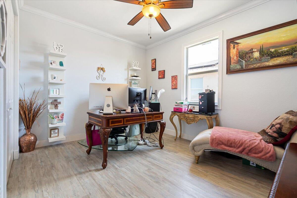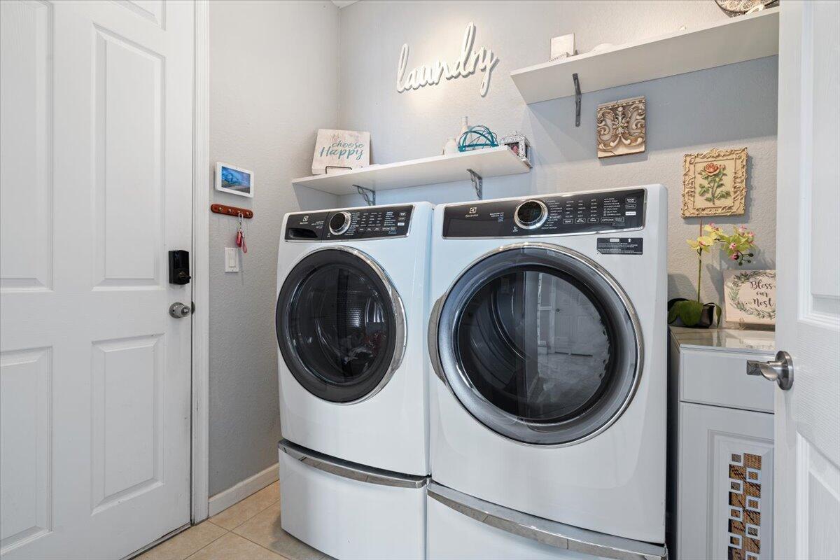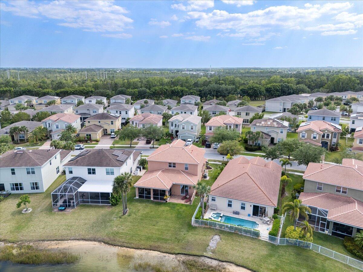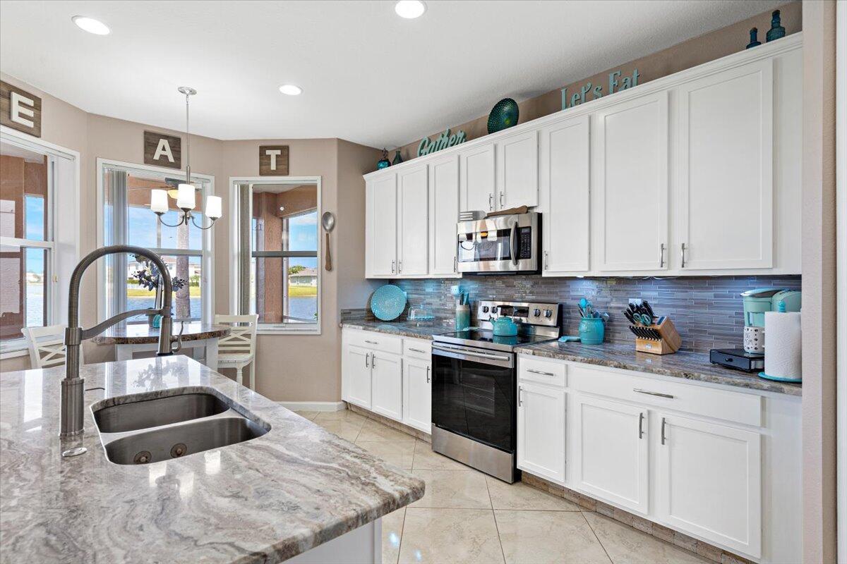 Live like you're on vacation in this stylish 4-bedroom, 2.5-bath home in coveted Vizcaya Falls, showcasing peaceful lake views and a smart, open layout. Solid CBS construction spans two stories with tile throughout the first floor, luxury vinyl on the stairs and upstairs commons, and soft carpet in the bedrooms. Soaring ceilings are elevated by upgraded crown molding, designer fixtures, and a statement chandelier. The upgraded kitchen shines with granite counters, a center island, and a sunny breakfast nook. Retreat to the first-floor primary suite with Roman tub, oversized shower, dual vanities, and a spacious walk-in closet. Recent updates include a 2024 washer & dryer, expanded three-car-width driveway, large entertaining patio, new impact-rated front door, and