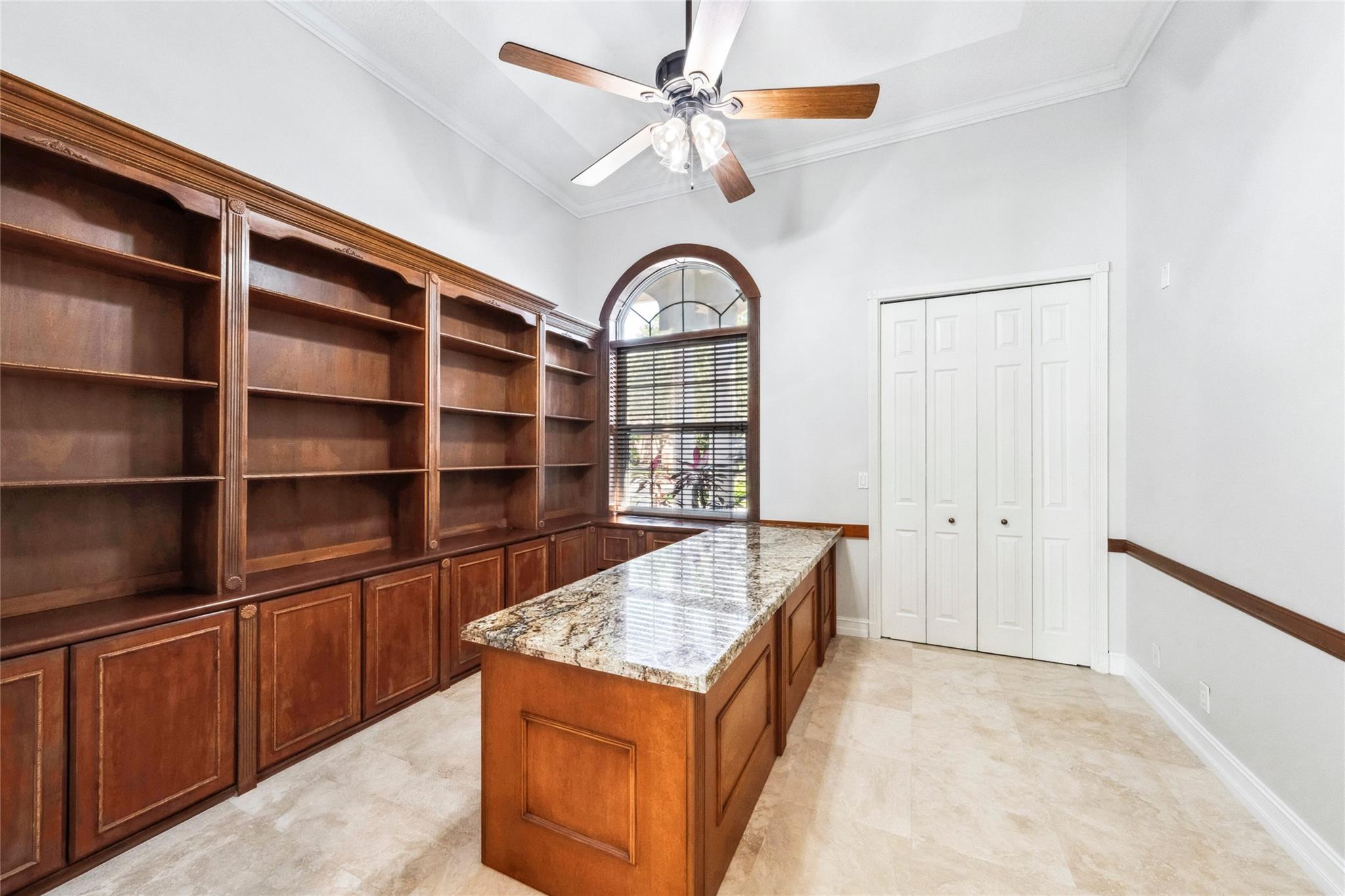 Rarely available lakefront estate in Fox Ridge! Situated on nearly a ½-acre lot, this stunning home features a desirable triple split floorplan with 5 BR, 3.5 BA, soaring volume ceilings, and breathtaking views throughout. Highlights include: NEW ROOF (2017), ALL HURRICANE IMPACT WINDOWS/DOORS, a tropical heated pool w/waterfalls, custom lighting & lush landscaping, marble flooring in all main living areas, an updated kitchen with wood cabinetry, granite counters, and stainless steel appliances. Additional upgrades: freshly painted interior, custom marble built-in desk, custom closets, crown molding, and an open patio overlooking the lake and amenity island—a true backyard paradise! All A-rated schools! Guard-gated community w/tennis, playground, volleyball & walking paths (low HOA fees).