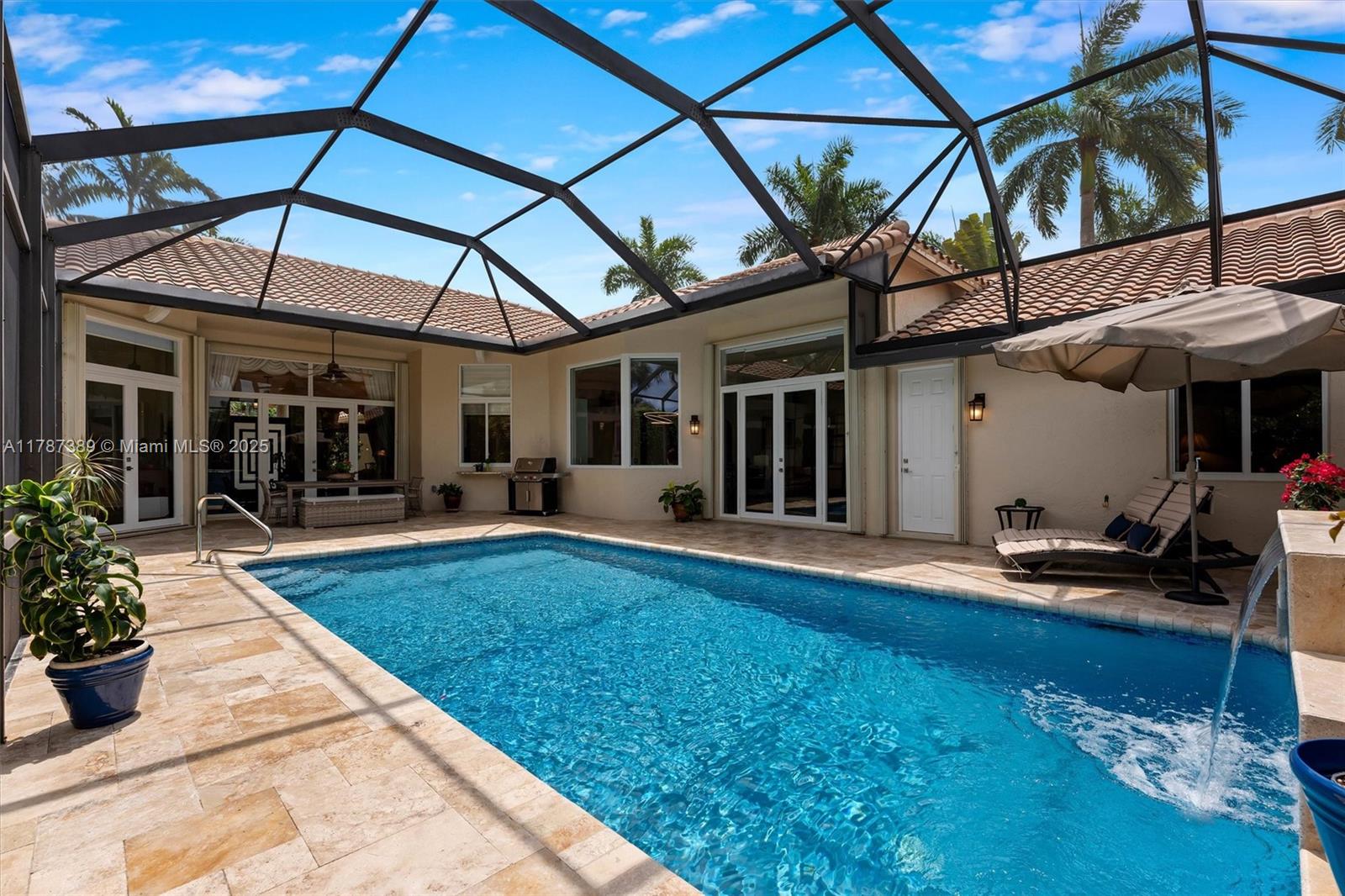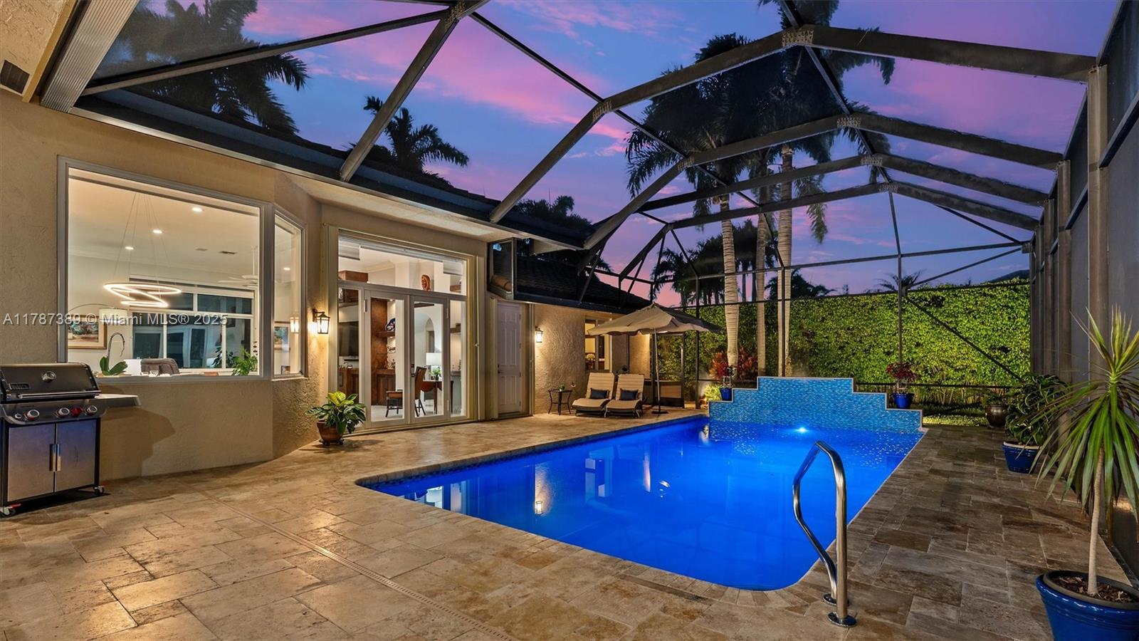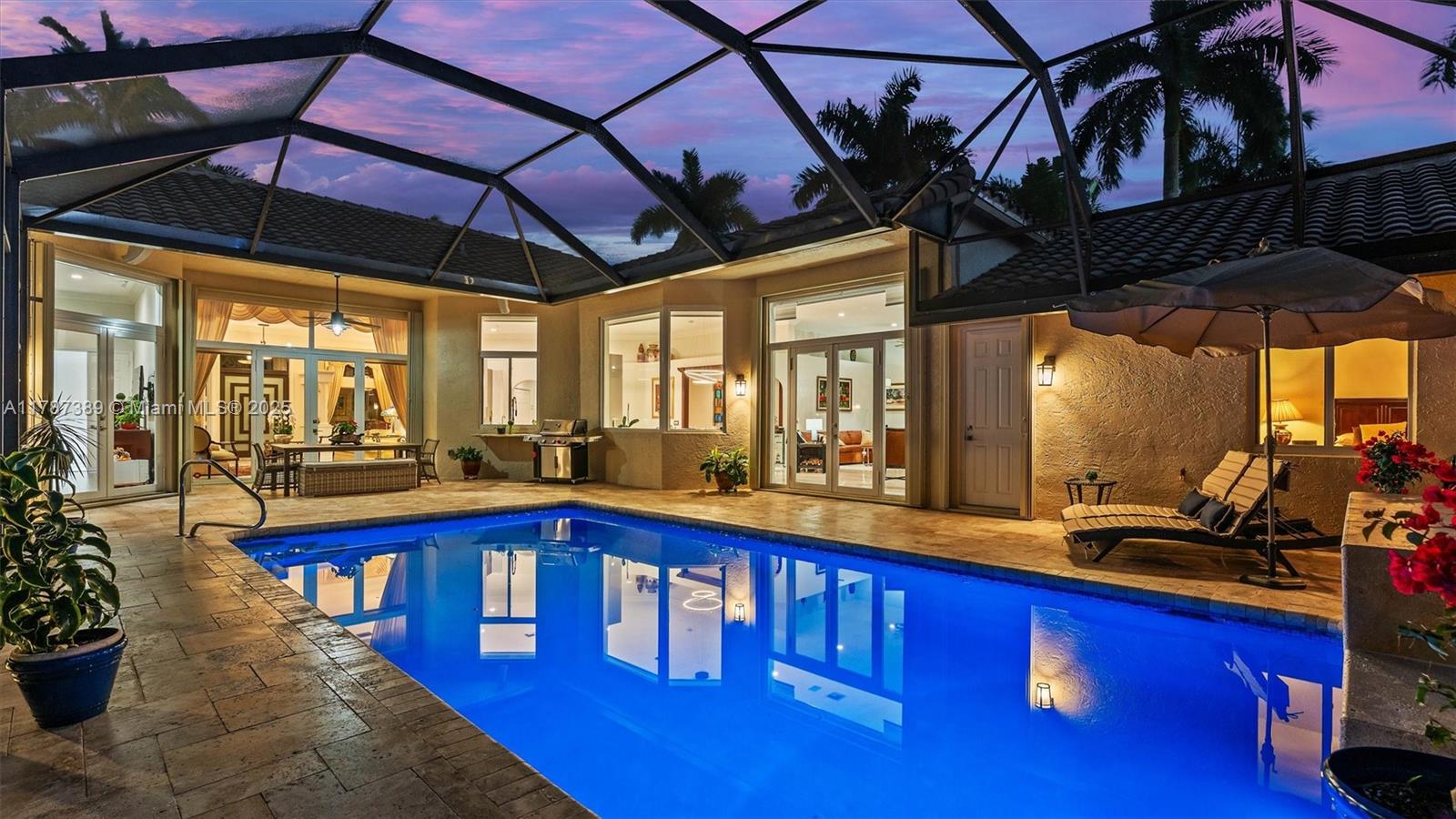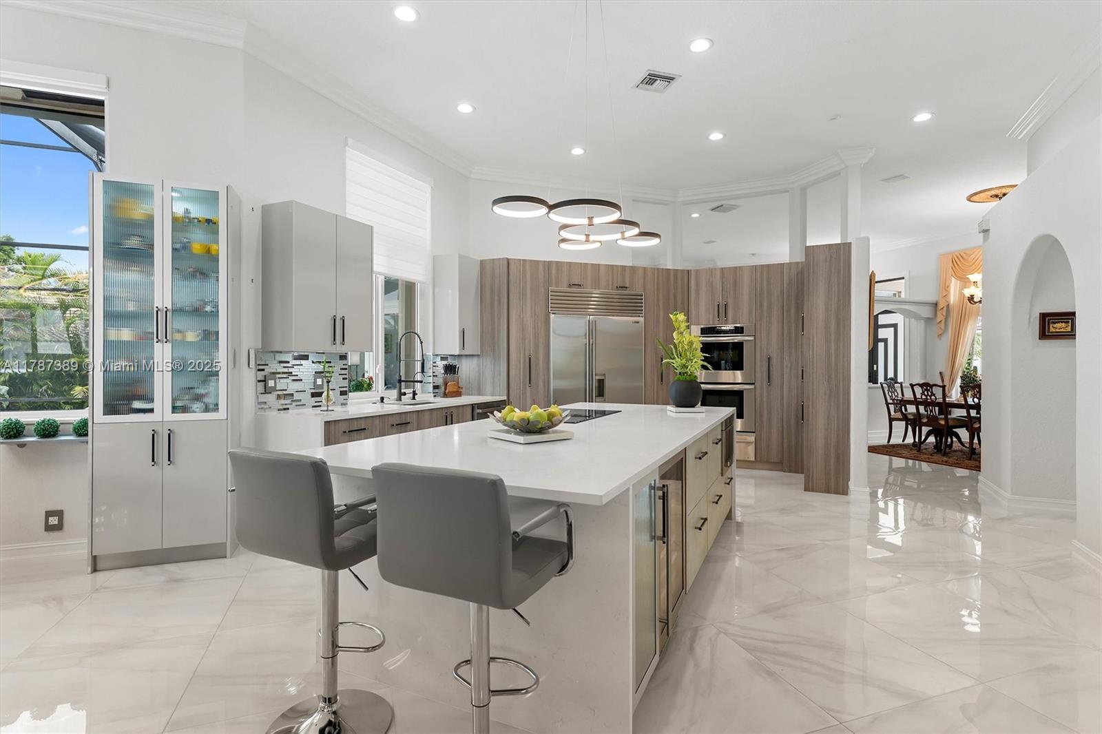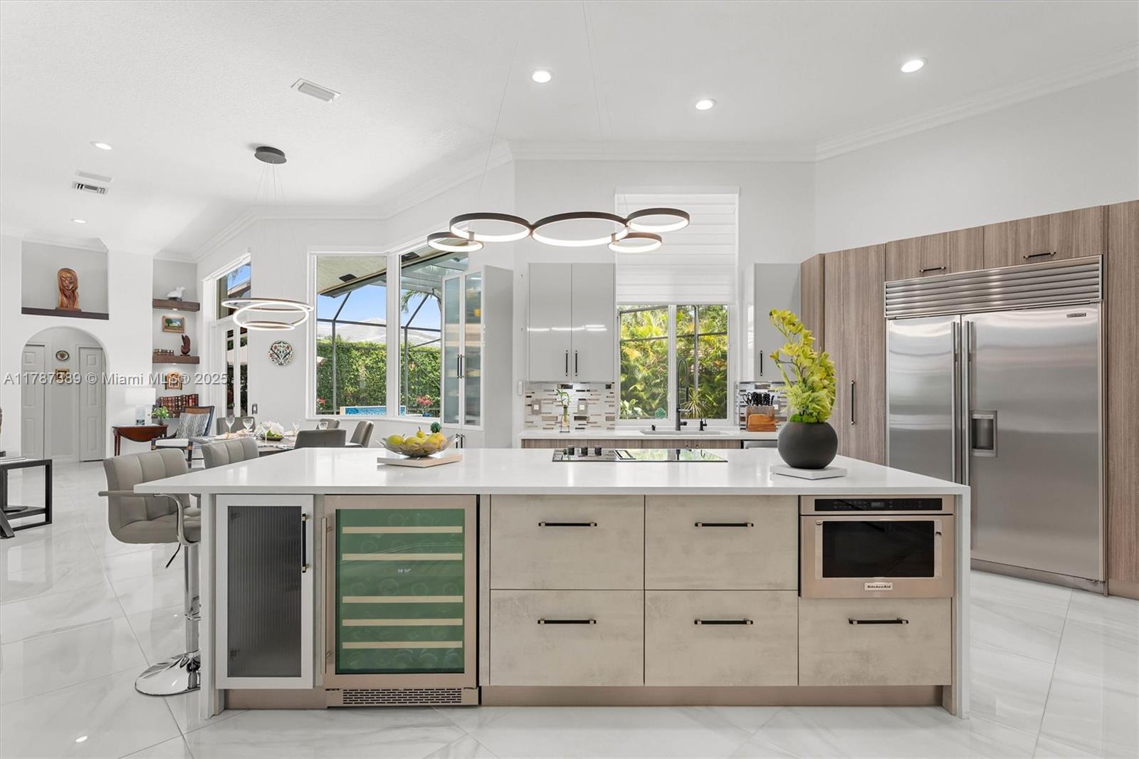 A rare offering in Weston Hills, where timeless architecture & exceptional craftsmanship meet on an expansive corner lot. This elegant home features 5BD plus a dedicated office and an entertainment room, with luminous porcelain flooring & rich laminated wood accents throughout. The oversized gourmet kitchen is equipped with Sub-Zero & Thermador appliances, quartz countertops, & a Zephyr wine cooler. Full impact windows fill the home w/ natural light, complemented by a 2017 roof for peace of mind. Enjoy a saline elongated pool within a screened patio, a whole-home water filtration system, & a three-car garage with insulated doors, transformed by Premier Garage. Located within Weston's premier A-rated school zone, this home offers the perfect blend of luxury, functionality, & prime location