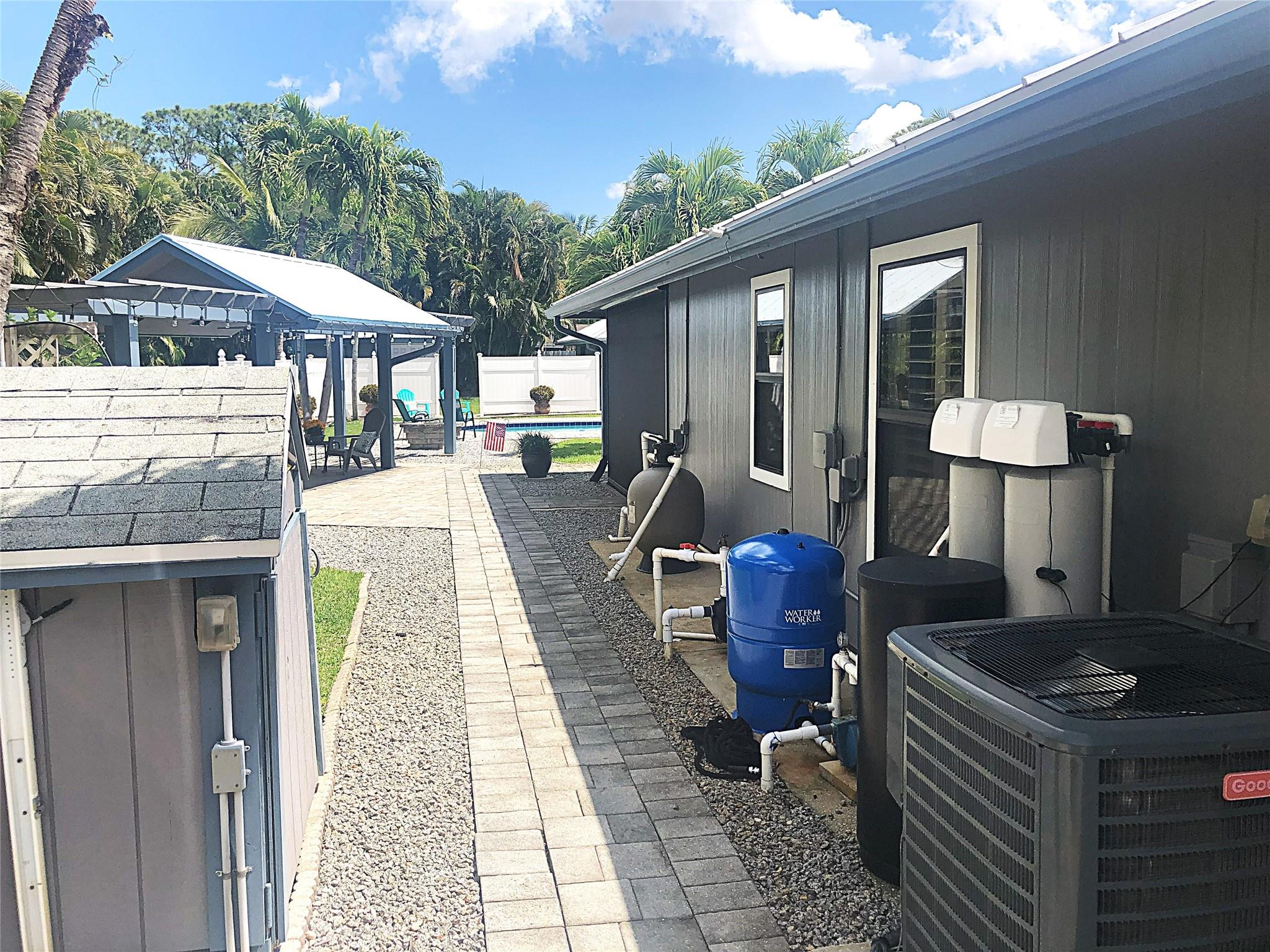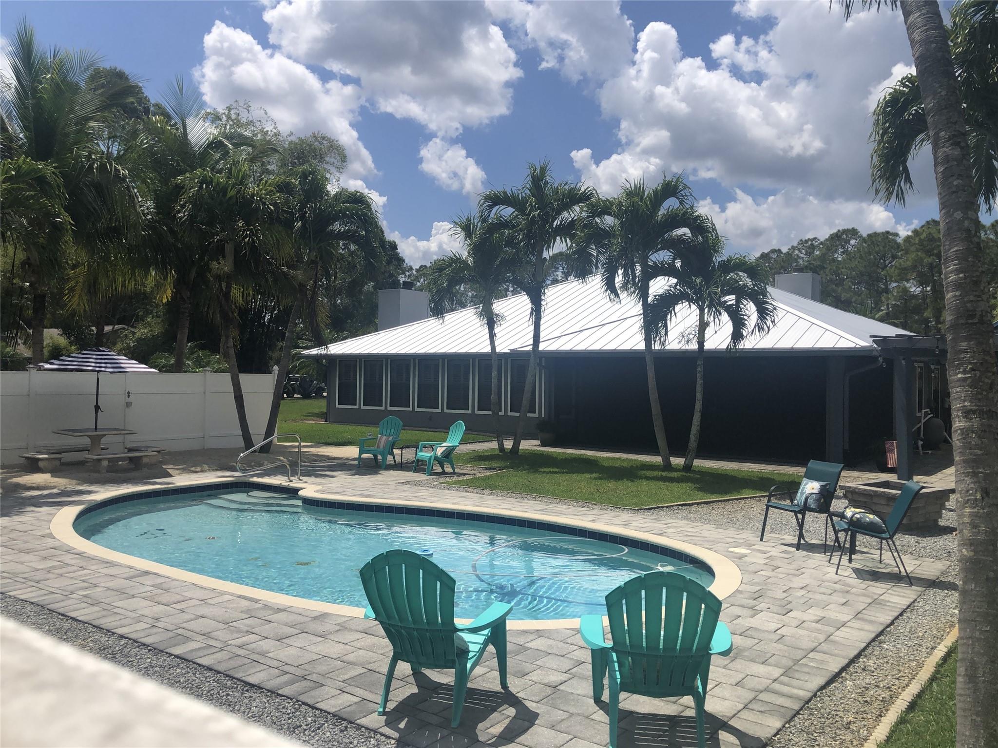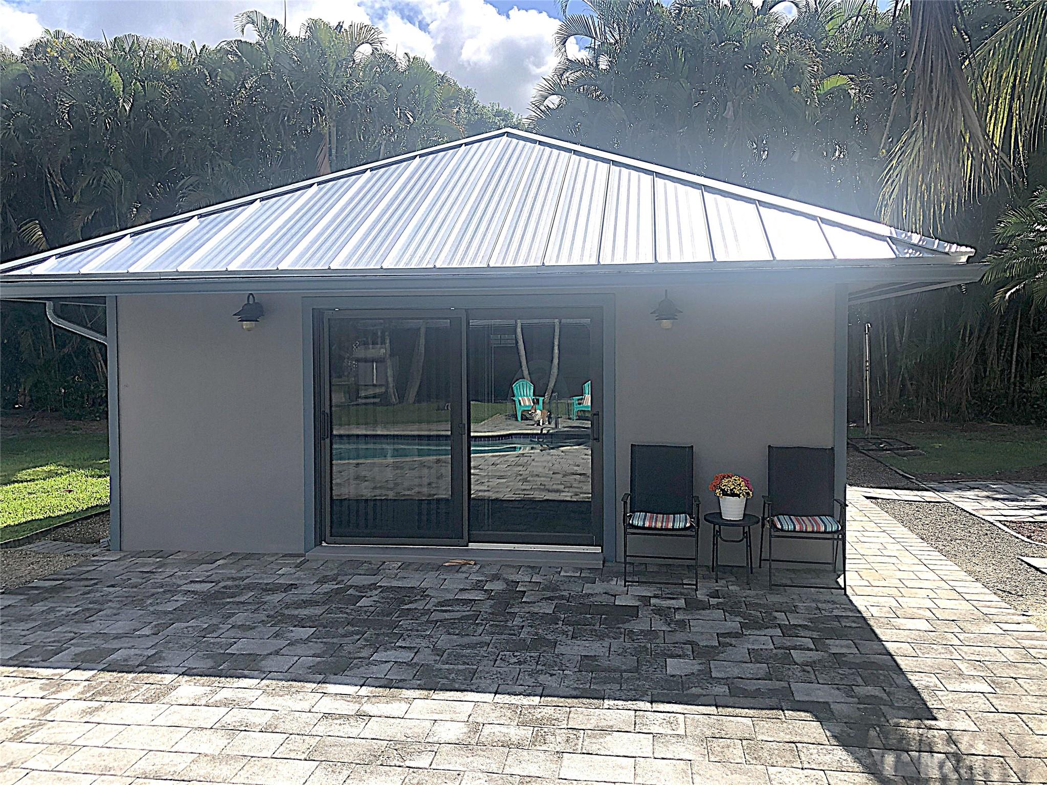 Beautiful 3/2, two car garage in Jupiter Farms featuring New 2024 standing seam metal roof on main and guest house, Main home is 2501 sf, under air with split plan. Completely Fenced In! Hurricane impact windows and sliders on main and guest house. Updated detached 500 sq ft 1b/1b guest house /or In- Law suite that is completely furnished with plantation shutters, full kitchen and bath, New tankless water heater, 2 ton a/c, TV, and an all in one Smart LG W/D combo. Main home features granite counter tops and ample cabinetry, pantry, 900 sf great room with fireplace, wet bar, LG appliances, convection oven, microwave, refrigerator, and dishwasher. Brand new W/D with 5 yr warranty. Two wood burning fireplaces, plantation shutters, new wood flooring throughout, 5 ton a/c.