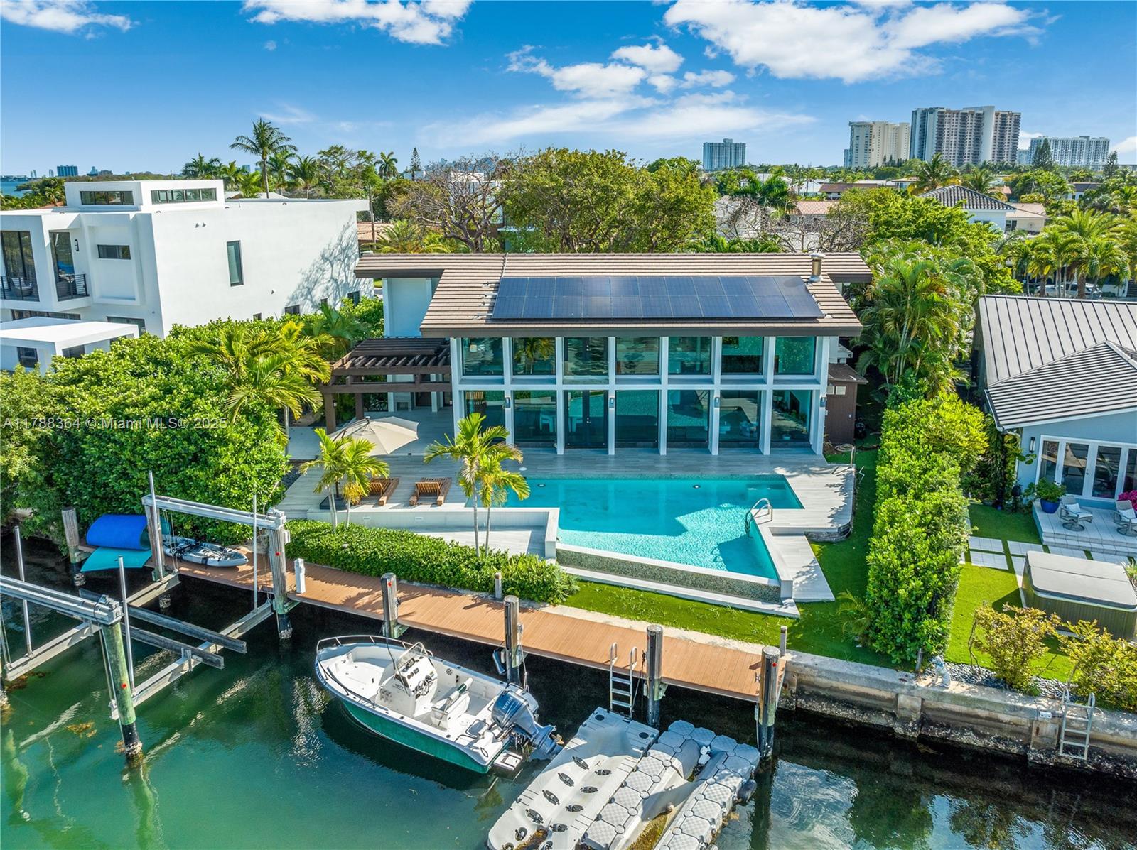 Designed by renowned architect Barry Sugarman, discover your coastal sanctuary where panoramic windows frame breathtaking views of the shimmering pool and the tranquil canal of the sea—perfect for yacht lovers. Natural light floods the space, creating a serene ambiance of peace and tranquility. This elegant home features 4 spacious bedrooms, 3.5 baths, and an elevator connecting the levels. The stunning walnut floors complement the Italian kitchen with a ceiling of warm wood. A Gumbo Limbo tree in the lush garden adds warmth and freshness, while solar panels on the roof ensure energy efficiency. Experience a harmonious blend of luxury, nature, and sophisticated design.